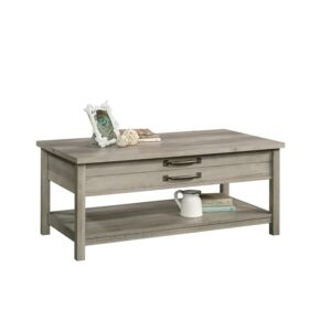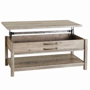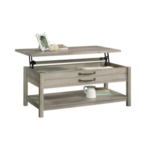 Style and convenience all in one. Give your home a fresh new look with the rustic charm and unique style of this lift-top coffee table from the Better Homes & Gardens Modern Farmhouse collection. This one-of-a-kind coffee table offers a spacious top surface that lifts up and forwards to create a multipurpose workspace for you to work from home, surf the web on your laptop or eat a yummy dinner all while relaxing from the comfort of your couch. Beneath its nifty lift-top surface is a hidden storage area for you to stow away miscellaneous around home essentials like spare blankets, board games, your collection of books or any other items you typically wouldn’t want your guests to see. It also features open shelving for additional storage or to display home decor items like picture frames and knick-knacks. Finished in Rustic Gray, this beautiful coffee table gives your home the style you want with the functionality you need.