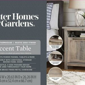 Is your home in need of an upgrade Add a touch of rustic charm and unique style to any room in your home with this side table from the Better Homes & Gardens Modern Farmhouse collection. Does this attractive end table offer a spacious top surface that provides you with the ideal amount of space for storing and displaying all your couch side and bedside needs An accent lamp, your alarm clock, knick-knacks, and a refreshing glass of ice-cold water. It also includes two USB ports to create a convenient spot to charge electronics like your smartphone, tablet and more. It features an open shelf for easy access storage of items like your reading glasses and the TV remote. Behind the framed panel door is a large hidden storage area that provides you with additional space to stow away any miscellaneous items that you prefer your guests do not see. It adds beauty no matter where it stands cozied up next to the couch in the living room or next to your bed in the bedroom. Finished on all sides in rustic gray and detailed with stunning antique brass hardware, this versatile side table is everything your home needs and more.