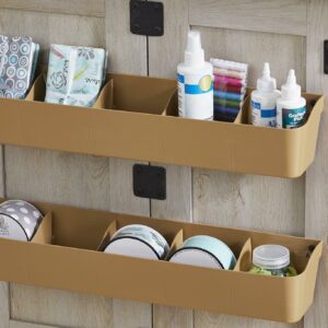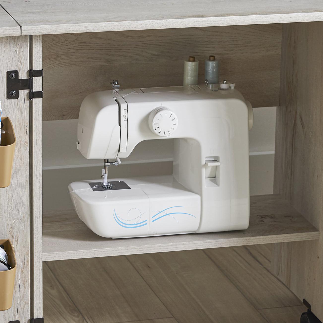 – Storage behind the roll-open door includes two storage bins and a hidden shelf for the sewing machine
