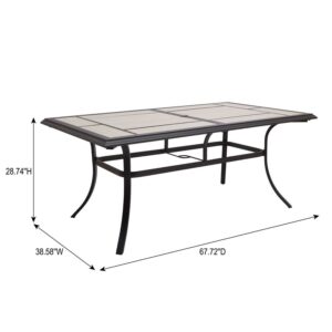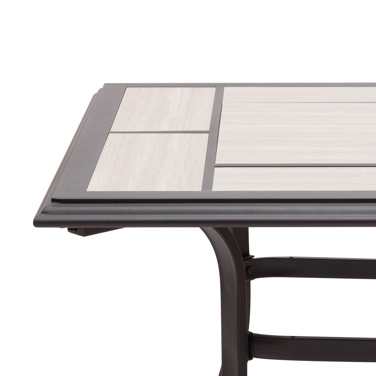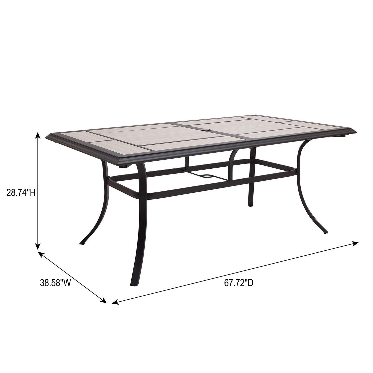 Gather in the fresh air for a delightful meal with the Better Homes & Gardens Newport Outdoor Ceramic Tile Top Dining Table with Umbrella Hole, Gray. The ceramic tile top gives your patio area a unique look and is designed with an umbrella hole for welcome shade on hot days (umbrella sold separately). The 67.72″ x 38.58″ steel dining table is crafted with black-finished steel legs that have been e-coated and powder-coated for increased rust resistance. Easily assembled with the included instructions, the Better Homes & Gardens Newport Outdoor Ceramic Tile Top Dining Table with Umbrella Hole, Gray can be combined with the Better Homes & Gardens Newport Outdoor Stationary Dining Chairs or Better Homes & Gardens Newport Outdoor Swivel Rocker Dining Chairs (both sold separately) for a full dining set that you and your family will enjoy for years to come.
