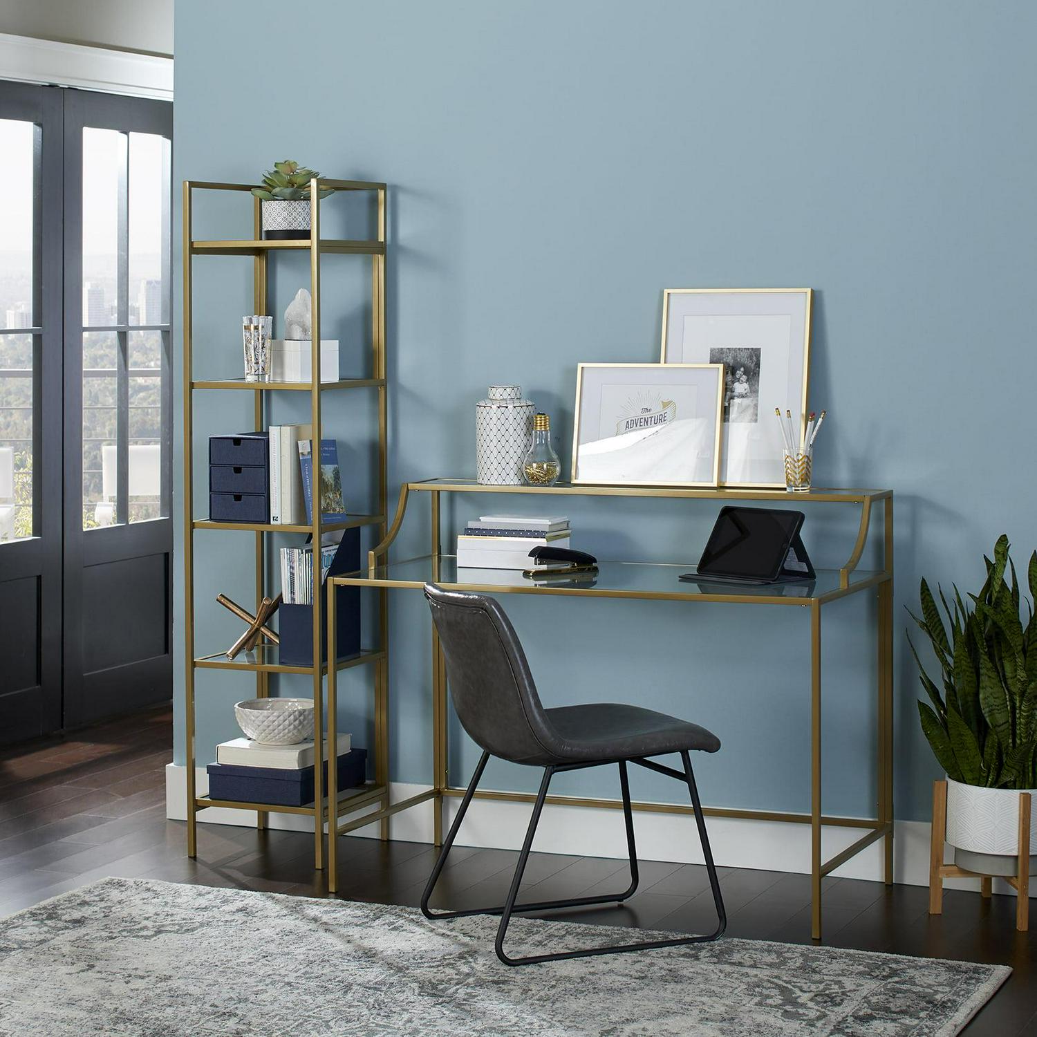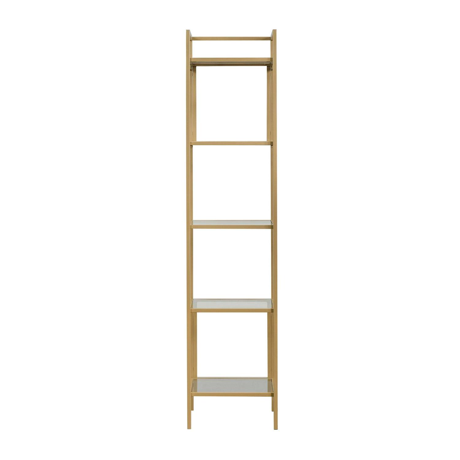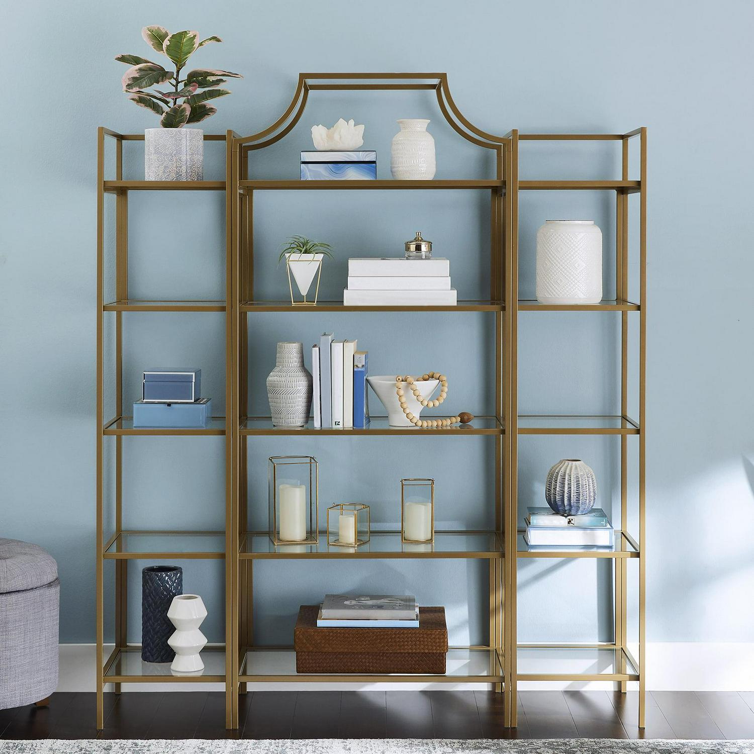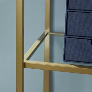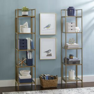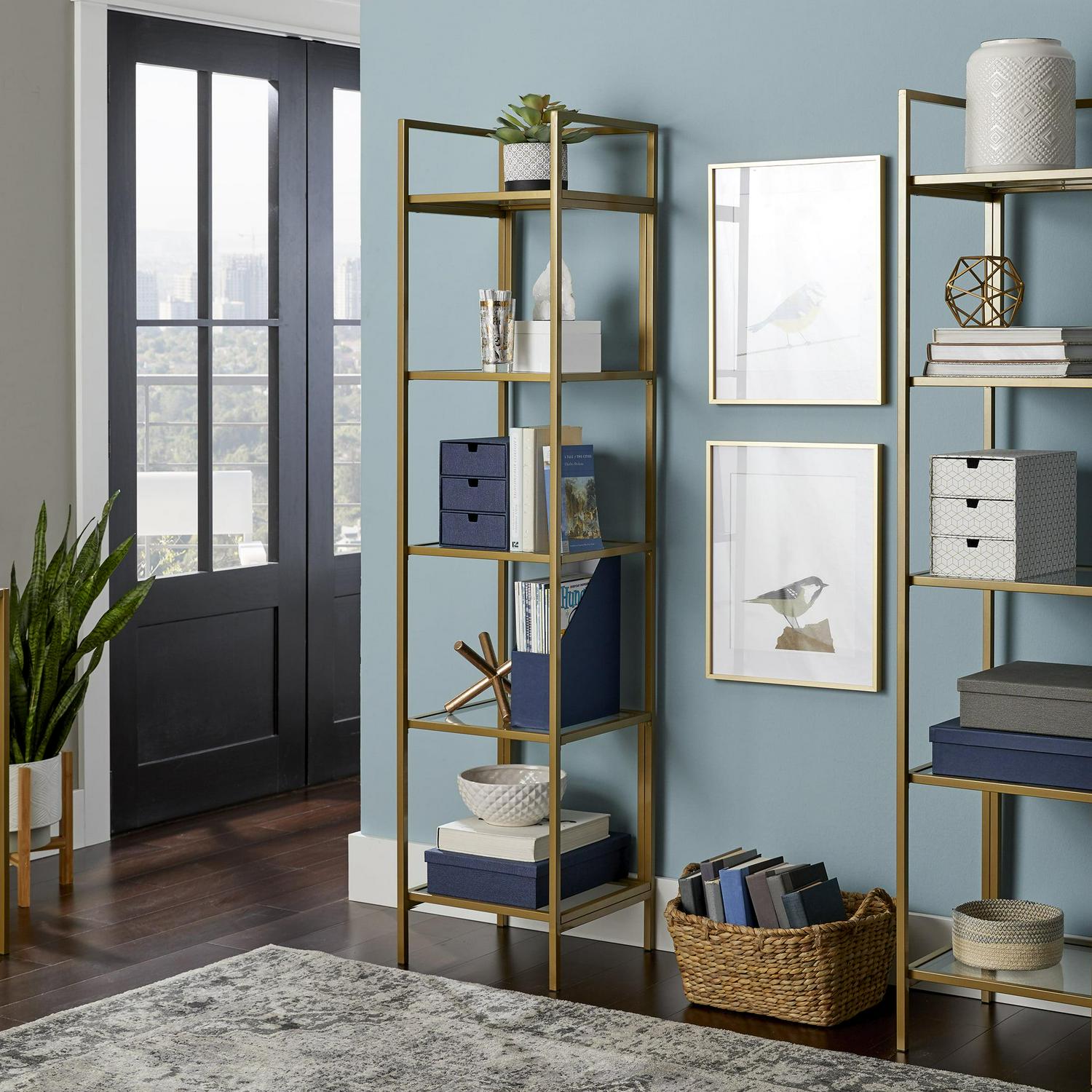 It’s time to elevate the style in your home. Add a touch of sophisticated style while creating versatile storage and display space with this narrow bookcase from the Better Homes & Gardens Nola collection. This tall bookcase features five safety tempered glass shelves. These spacious shelves are ideal for storing a variety of different items like stacks of books, work binders, and organizing bins. They also make the perfect spot to display all your favorite things like your collection of knick-knacks, decorative plants, and photos of your family and friends. There’s a place for all your things! This stunning bookcase is finished on all sides for versatile placement throughout any room in your home The living room, your office, or even in the bedroom. Its sturdy metal construction ensures that it is built to last. Finished in gold, this charming Better Homes & Gardens Nola narrow bookcase will give your home the style you have been looking for. From bookcases to tv stands, Better Homes & Gardens furniture is designed to help you organize your home. Look for a new dresser for your clothes, display your favorite books with a bookcase or create your home office with a desk and a cube organizer. You’ll also find kitchen and dining tables, chairs, living room, and kid’s furniture.