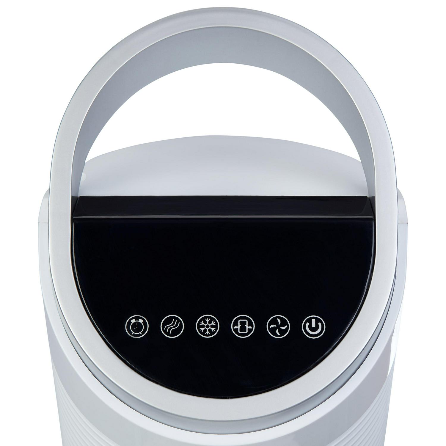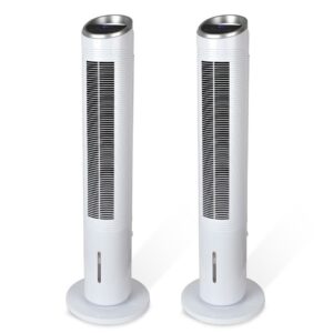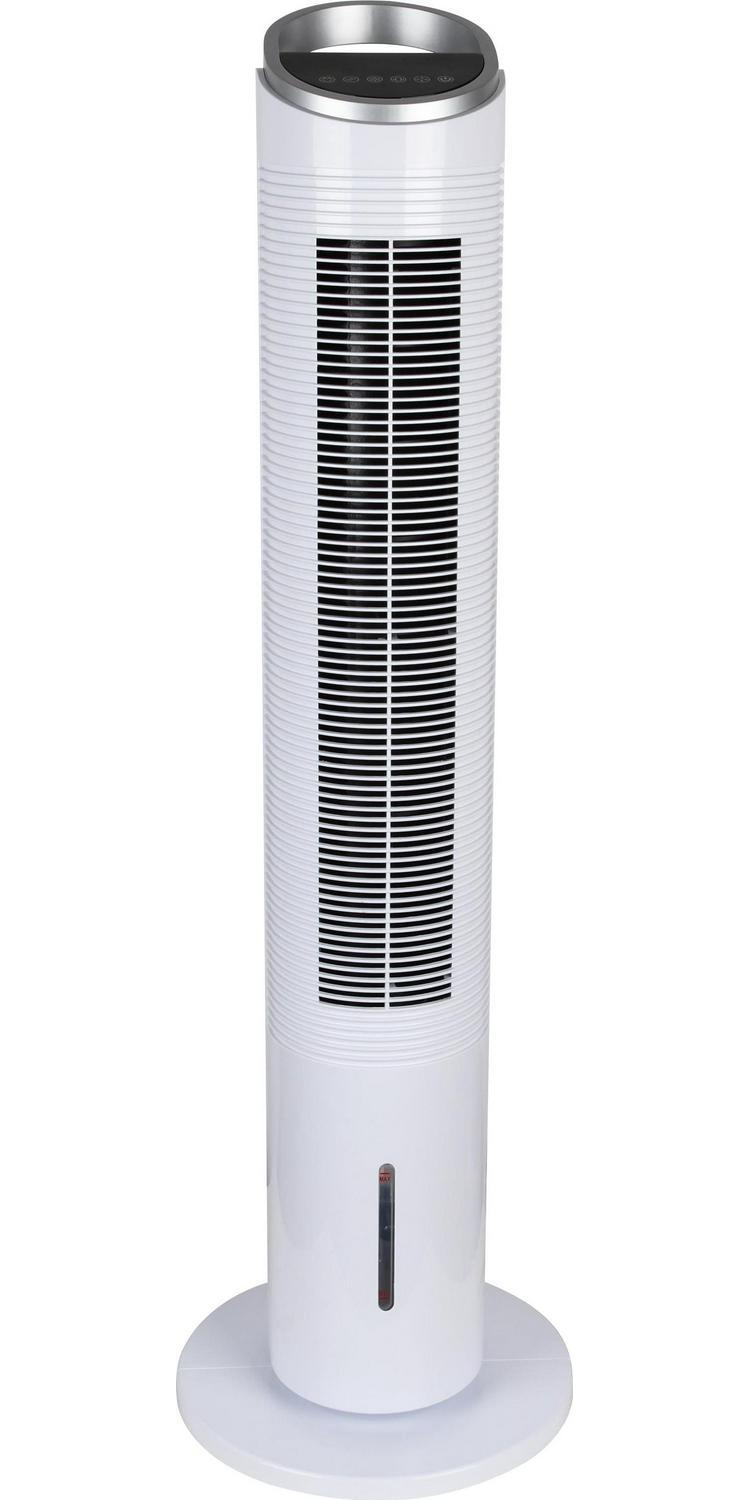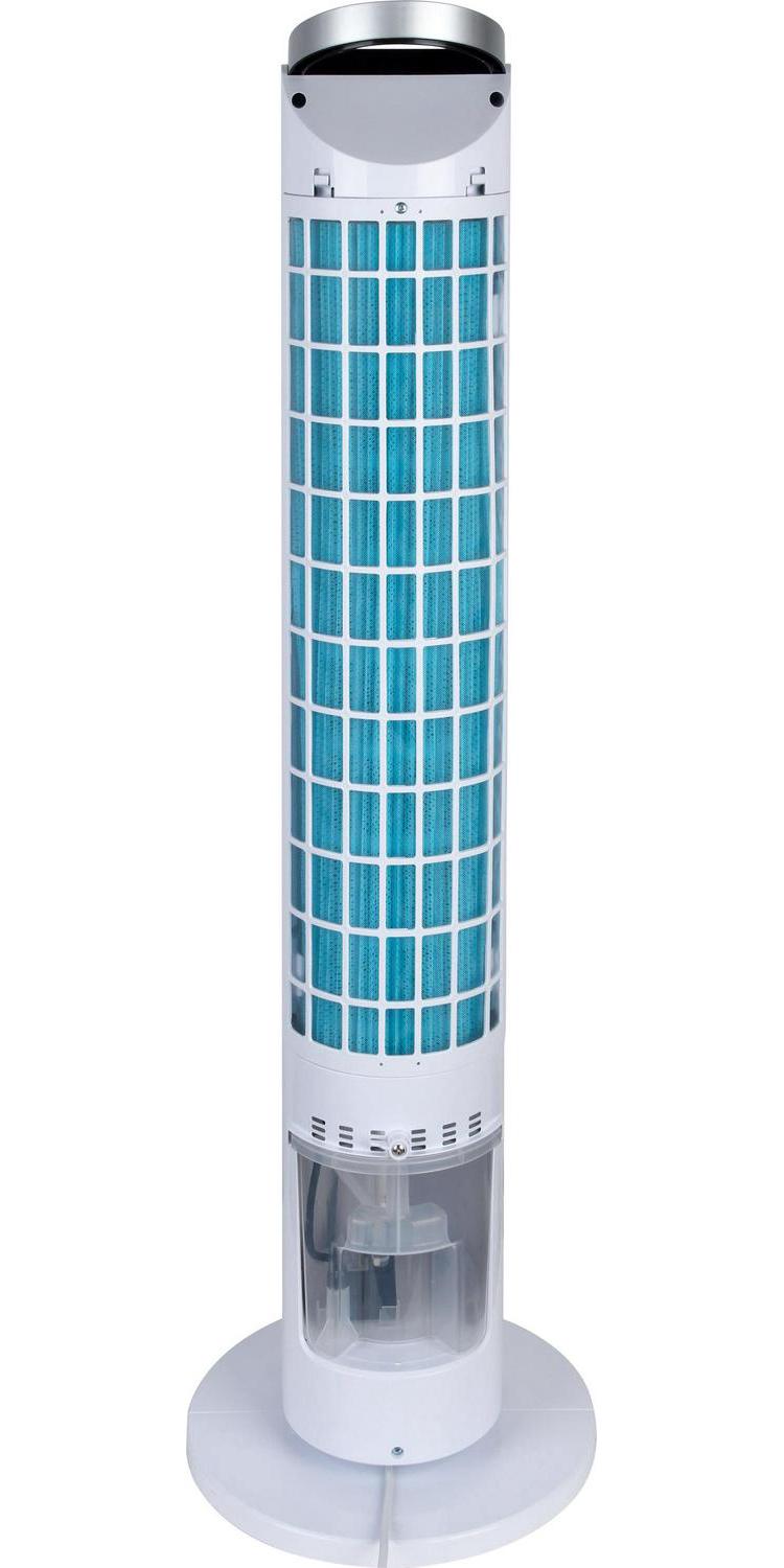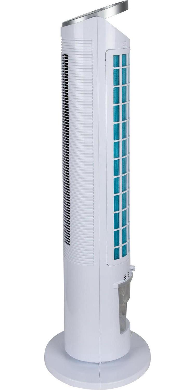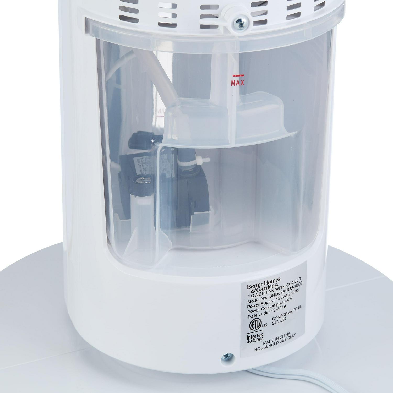 The Better Homes & Gardens programmable LED display tower fan with air cooler and remote can help you keep your cool in any room. Designed with a tower construction and a small footprint in white to complement virtually any room decor, the fan includes a 0.55 water tank to cool air as it circulates and comes with a remote control to allow operation from anywhere in the room. With just the touch of a button, you can choose between three quiet speeds, three wind types, and oscillation without getting up. The fan features a timer programmable for up to eight hours, an LED display, and a top carrying handle to make transport easy. Easily assembled with the included instructions, the Better Homes & Gardens programmable LED display tower fan with air cooler and remote is perfect for large spaces and small in bedrooms, dining rooms, living rooms, dens, playrooms, mancaves, offices, classrooms, dorm rooms, and more.
