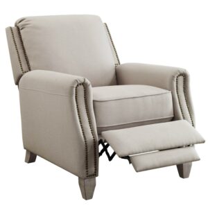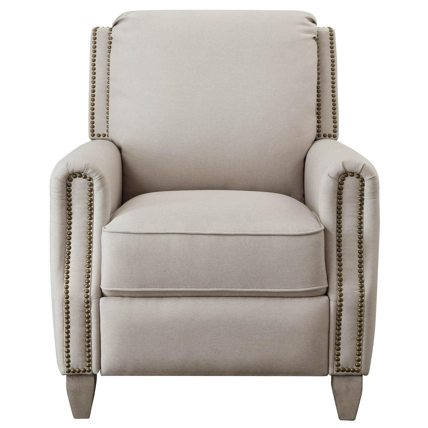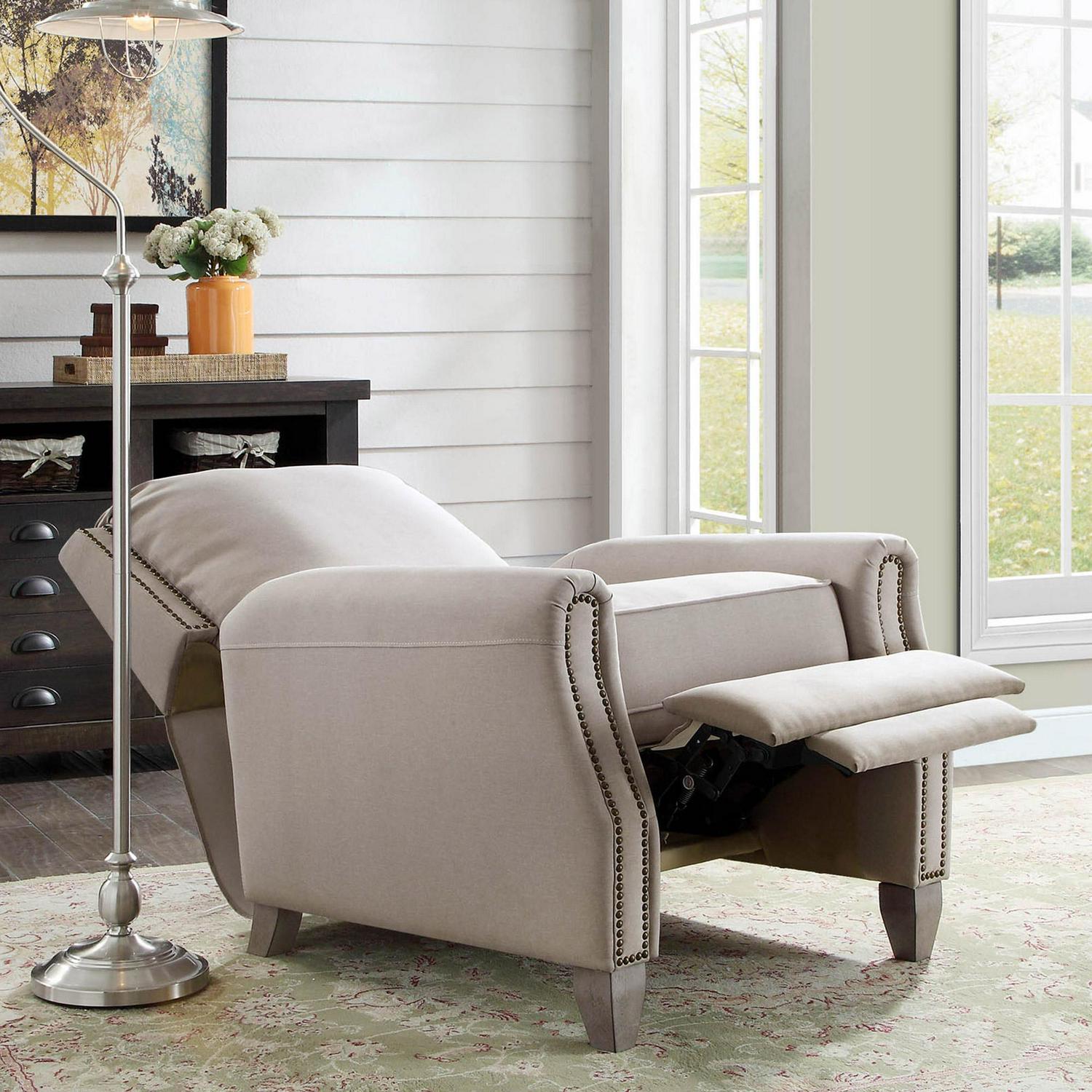 Our fabulously stylish Better Homes and Gardens Pushback Recliner offers the perfect combination of comfort and style. High-quality, warm beige upholstery with bronze nail-head accents and hand-finished, solid wood legs in an espresso brown finish give this chair an elegance and sophistication that will complement most any interior décor or home furnishings. The generously padded chair back and seat gives the chair a cozy comfort that you are sure to love. The handy pushback reclining mechanism makes lounging a breeze. It is the perfect addition to any room, from the living room or family room to the study or home office. It creates the perfect place to curl up and read a book, or relax and unwind after a hard day. This chair is covered by a 1-year warranty. The Better Homes and Gardens Pushback Recliner is the ideal blend of quality and style and brings a sophisticated comfort to your home.