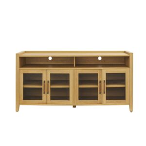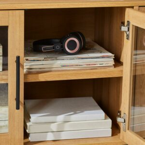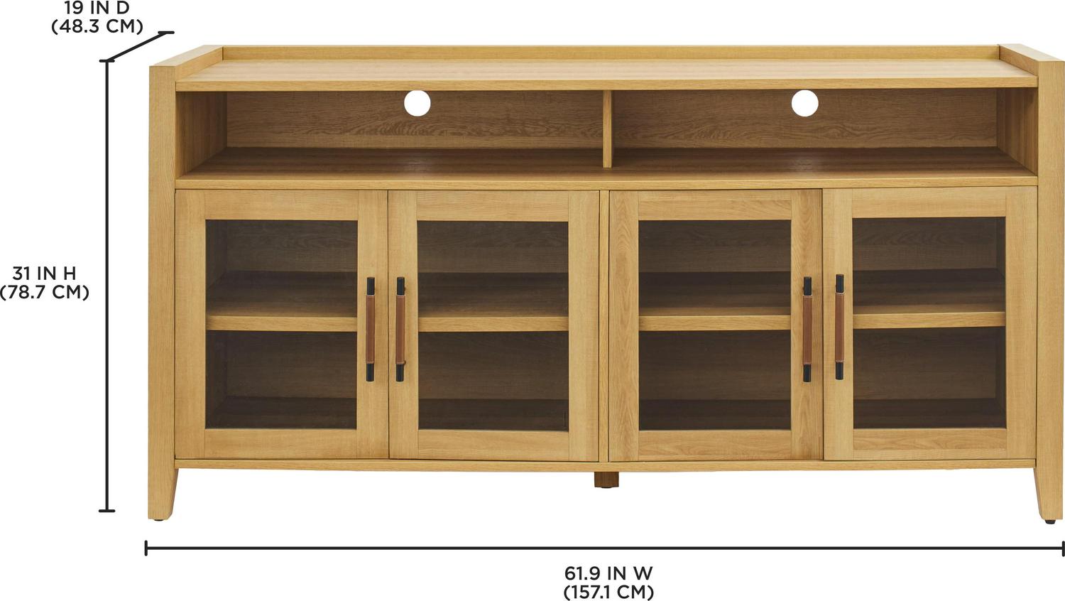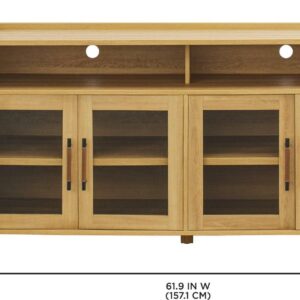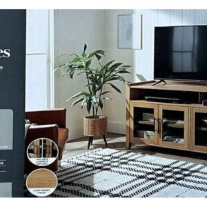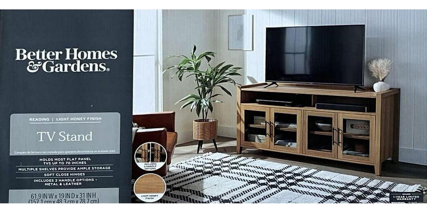 Better Homes & Gardens Reading Refined Farmhouse TV Stand for TVs up to 65″, Light Honey Finish. The modern look and clean lines make this TV stand fit well with any home décor or room style. The quality, finish & style are upscale and trend right. The size of 61.9″W*19″D*31″H accommodates flat panel TVs up to 65″ and 135 lbs. It also can also be used as an entryway console or storage cabinet in your living room. You can choose to use the plain black handles or black handles wrapped with leather as it includes both. This item is also easy to assemble.