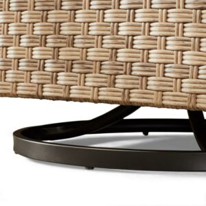 Boost your outdoor style and comfort with the Better Homes and Gardens River Oaks Outdoor Swivel Gliders, Set of 2, Natural, the perfect place to gather outdoors with family and friends. Engineered to brave the elements, the robust weather-resistant wicker and sturdy steel frames stand the test of time. The unique swivel glider function enhances usability, promoting effortless conversations and comfort. The neutral beige polyester cushions feature 3M Scotchgard treated fabric and weather-resistant fiberfill. A beautifully hand-woven basket weave pattern in a natural wicker covers the durable e-coated steel frame, perfectly paired to protect your patio furniture from the outdoor elements. The River Oaks outdoor swivel glider lounge chairs are the perfect complement to your outdoor patio, deck, or porch. The Better Homes & Gardens River Oaks Outdoor Swivel Gliders include weatherproof and durable outdoor covers to protect your outdoor furniture against all elements. Assembly is required.