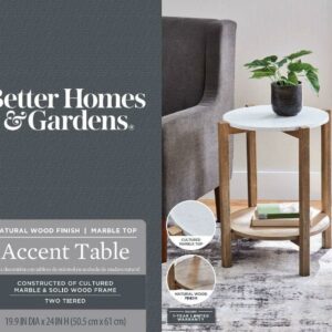 Add style and sophistication to your home with the Better Homes & Gardens Marble End Table. With a two-tiered design, its cultured marble top surface provides you with the perfect amount of space for a lamp, a home decor item or two, remotes or an alarm clock. It also features an open wood shelf below for easy access for storage and display of books, magazines and decorative items. The solid natural finished wood frame provides stability and the cultured marble top will bring a modern and classy feel to your home. Perfect next to the couch in the living room, an accent piece in your office or a nightstand in your bedroom, the Better Homes & Gardens Marble End Table looks good no matter where it’s placed. You can even pair two of the tables together for the perfect addition to either side of your sofa, desk or bed. Wherever you chose, the natural wood finish paired with the marble top, the sophisticated two-tiered table adds style and charm to your home.