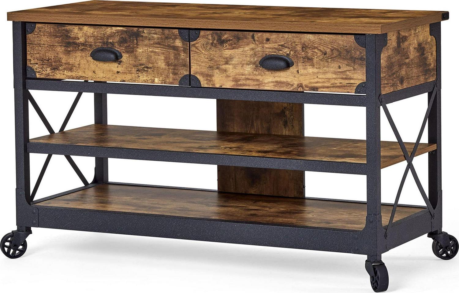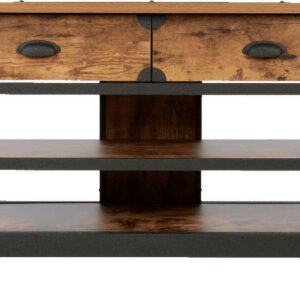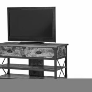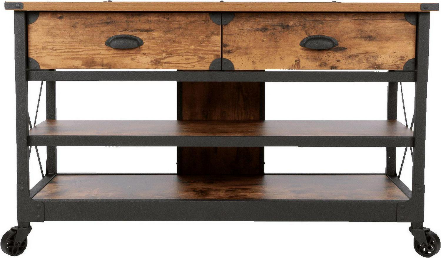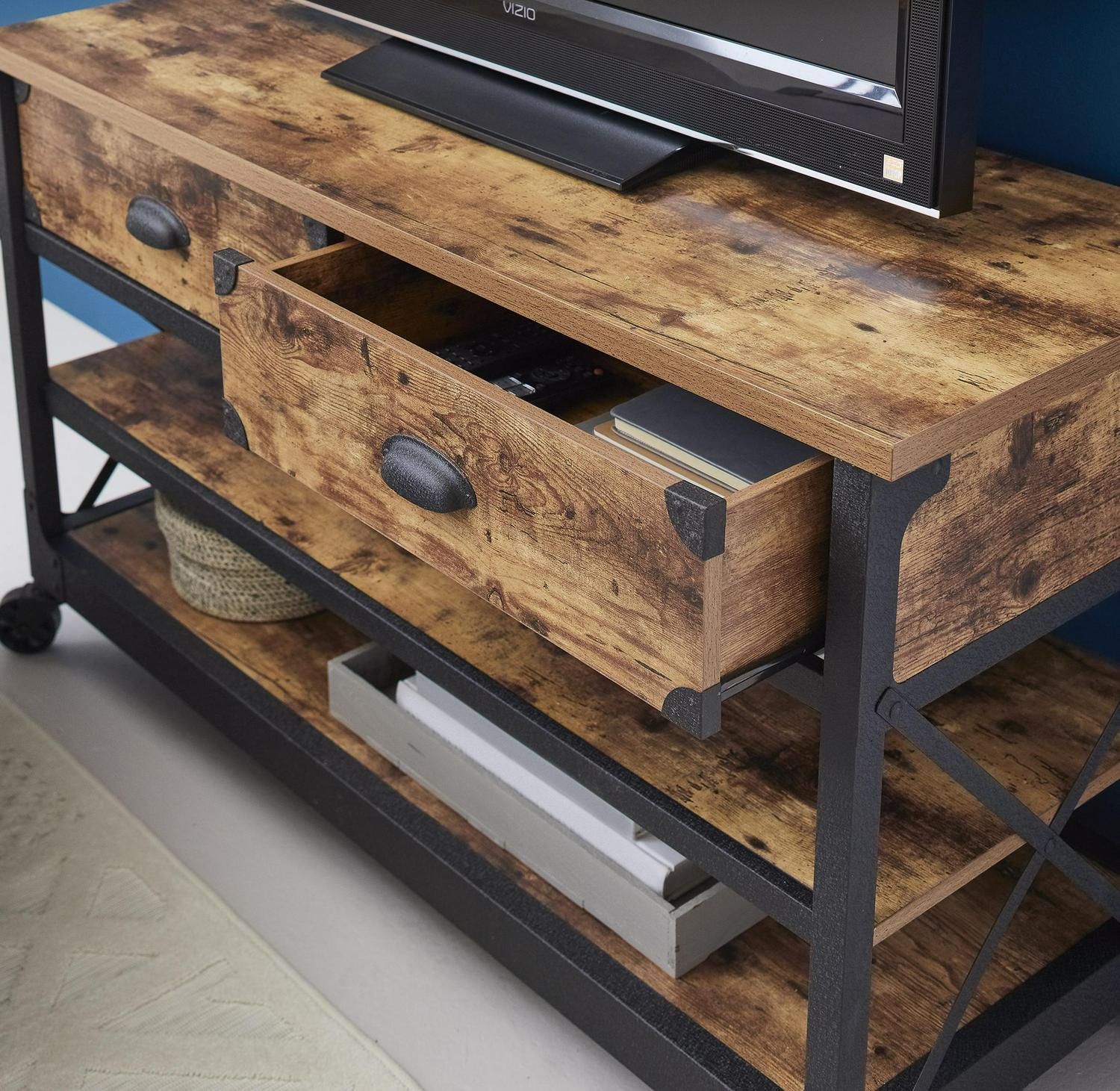 This Better Homes & Gardens Rustic Country Panel TV Stand features a warm, distressed-look engineered wood base and antiqued black metal trim which evoke the charm of a well-loved antique. Bring the feeling of a vintage piece sourced in the California Wine Country to your living room, den, or TV room. The textured metal legs feature fixed wheels. With two spacious shelves for storing media components, books, magazines, or Knick knacks and two drawers for storing DVDs and games, this TV stand has everything you need for a super fun and stylish movie or game night with the whole family. We hope you like what you see. Our designers travel the world and bring back the best and latest in style, finish, and color trends. This inspiring world travel is evident in the cutting-edge and innovative furniture solutions we offer to you! Other affordable furnishings from the collection (sold separately) are available to complete the look.