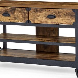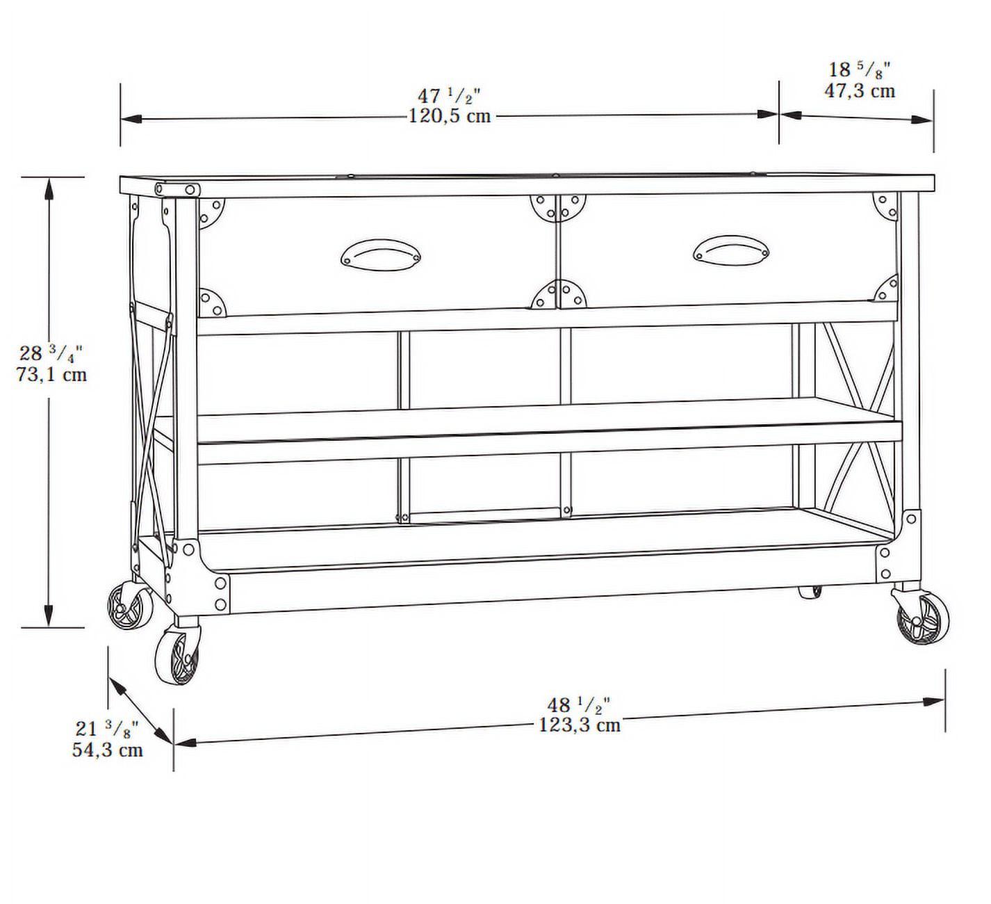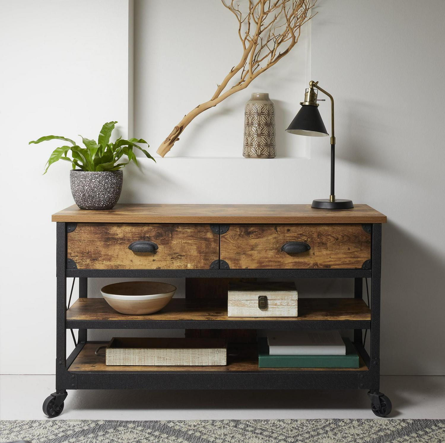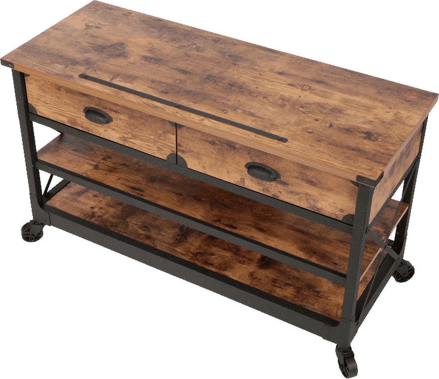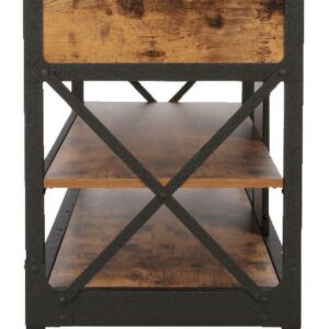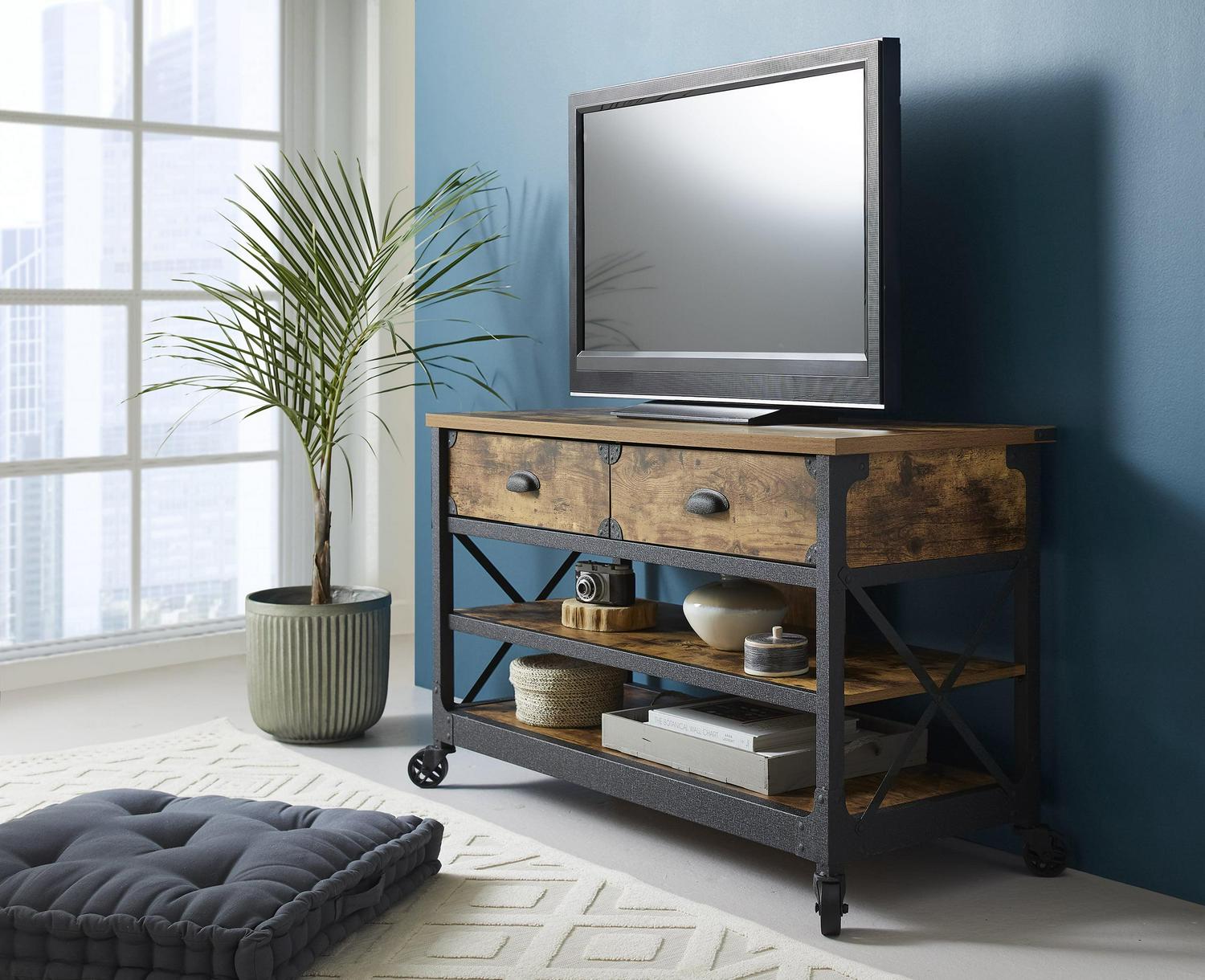 This Better Homes & Gardens Rustic Country Panel TV Stand features a warm, distressed-look engineered wood base and antiqued black metal trim which evoke the charm of a well-loved antique. Bring the feeling of a vintage piece sourced in the California Wine Country to your living room, den, or TV room. The textured metal legs feature fixed wheels. With two spacious shelves for storing media components, books, magazines, or Knick knacks and two drawers for storing DVDs and games, this TV stand has everything you need for a super fun and stylish movie or game night with the whole family. We hope you like what you see. Our designers travel the world and bring back the best and latest in style, finish, and color trends. This inspiring world travel is evident in the cutting-edge and innovative furniture solutions we offer to you! Other affordable furnishings from the collection (sold separately) are available to complete the look.