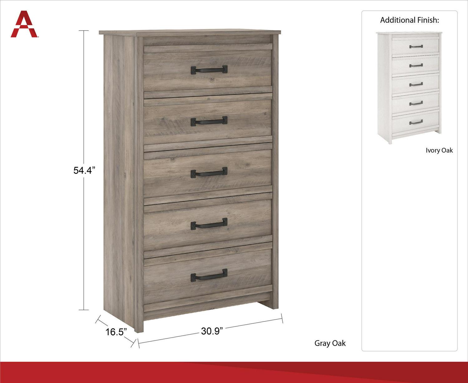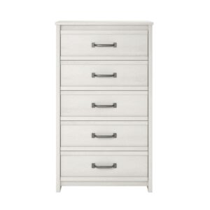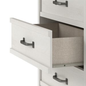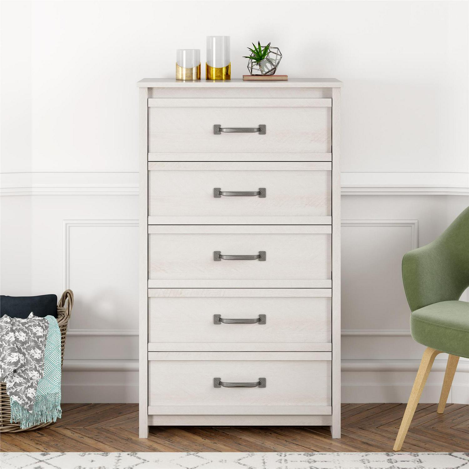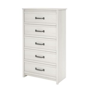 Add a rustic modern touch to your bedroom with the Ameriwood Home Bassinger 5 Drawer Dresser. The Dresser combines an off-white woodgrain finish on laminated particleboard and MDF with pewter handles to give your bedroom a sleek and updated look that fits any décor. Five drawers give you plenty of storage for your folded clothing or extra blankets. The top shelf provides an excellent area to display family pictures, or a convenient space to place your jewelry. The drawers are all finished in a linen-look paper laminate to complete the Dresser. A wall anchor kit is included to secure the Dresser to the wall and prevent tipping injuries. Each Bassinger 5 Drawer Dresser ships flat to your door and requires assembly upon opening. Two adults are recommended for proper assembly. The top shelf can hold up to 50 lbs. and each drawer can hold 35 lbs. Assembled dimensions are 54.37″H x 30.91″W x 16.54″D.