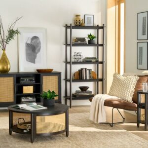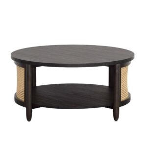 The dark, smooth surface of this modern coffee table provides ample room to store and display an array of items, such as a stack of books, the TV remote, a big bowl of snacks or an ice-cold beverage. With curved side panels made of a synthetic decorative caning insert, this round coffee table from the Better Homes & Gardens Springwood Collection encompasses a sophisticated yet homey aesthetic. The bottom shelf is the perfect place for stacks of magazines, board games, or to stash away a basket of snacks. This black coffee table with rattan is embellished on both sides with contrasting nature-like fibers, which are a soothing and timeless fashion statement. This coffee table with open storage is finished on all sides in dark Charcoal for versatile placement throughout any room in your home. With plenty of space for both storage and display, this open shelf coffee table lends a chic styling that is bold, dramatic, and just plain fashionable.