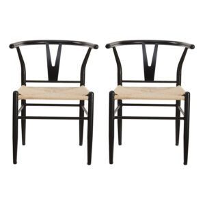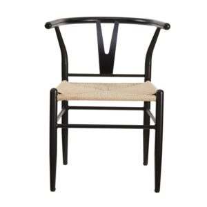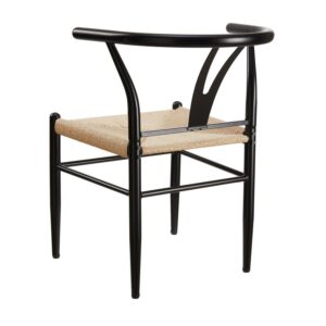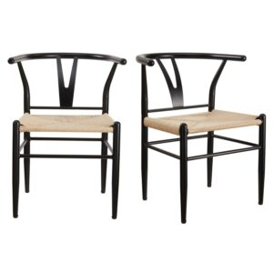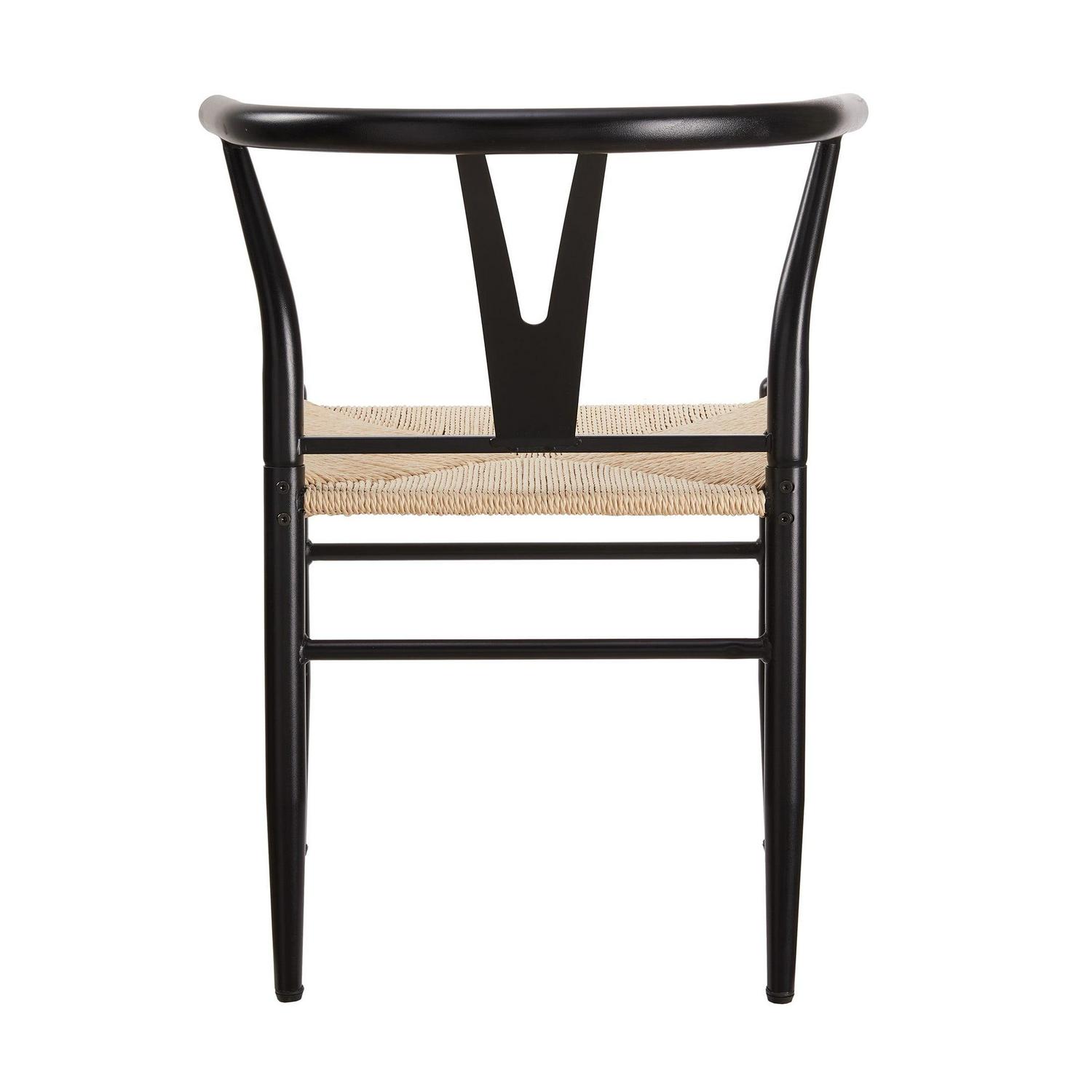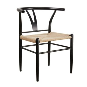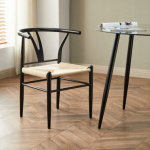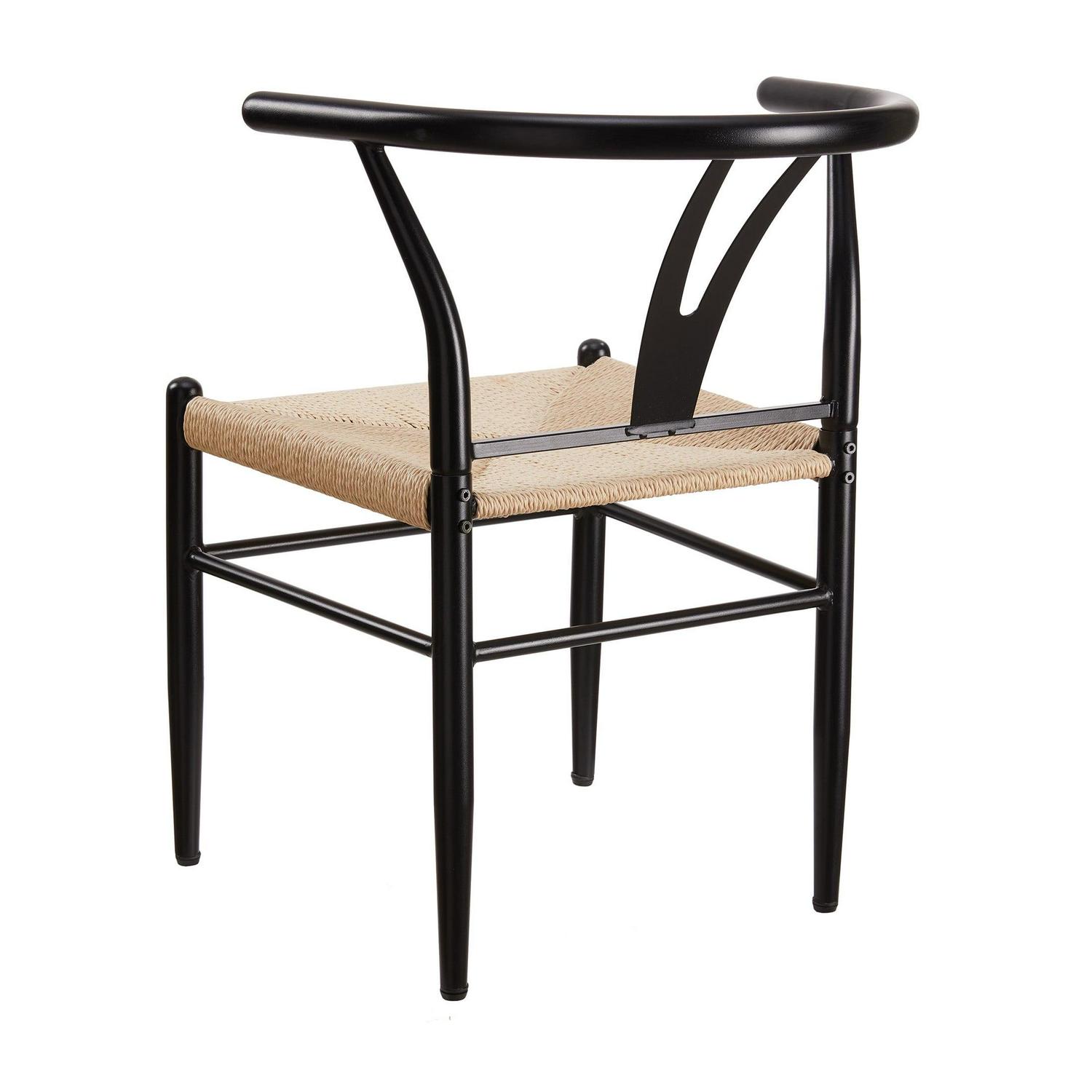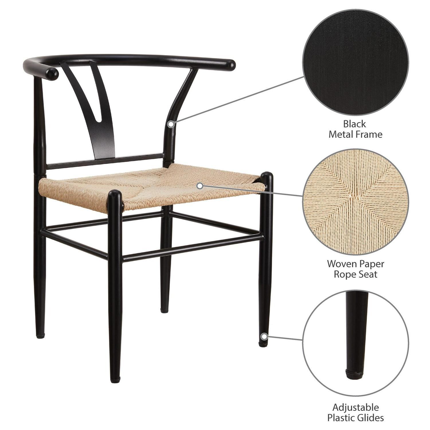 The Better Homes & Gardens Springwood Wishbone Chairs are made of steel frame in wood effect in black that makes these chairs stable and durable. The sturdy construction and steel frame to ensure the chairs will serve well. The seat is made of natural hand-woven paper rope, tightly woven, soft to the touch, durable and with good permeability. The armrest and backrest are in same piece with a suitable curve. It gives extra stability and comfort when use it. The Y-shaped cutout makes the chair attractive and unique, also improving the stability of the backrest. The clean lines and simple color, this pair of chairs are a good combination of aesthetics and stability. The chair legs have screw-in protective feet leveler, helping keep chairs stable and meeting the uneven floor. These modern weave chairs are sold in a set of 2, suitable for use in different places, such as dining rooms, living rooms, workrooms, parties, banquets, etc.