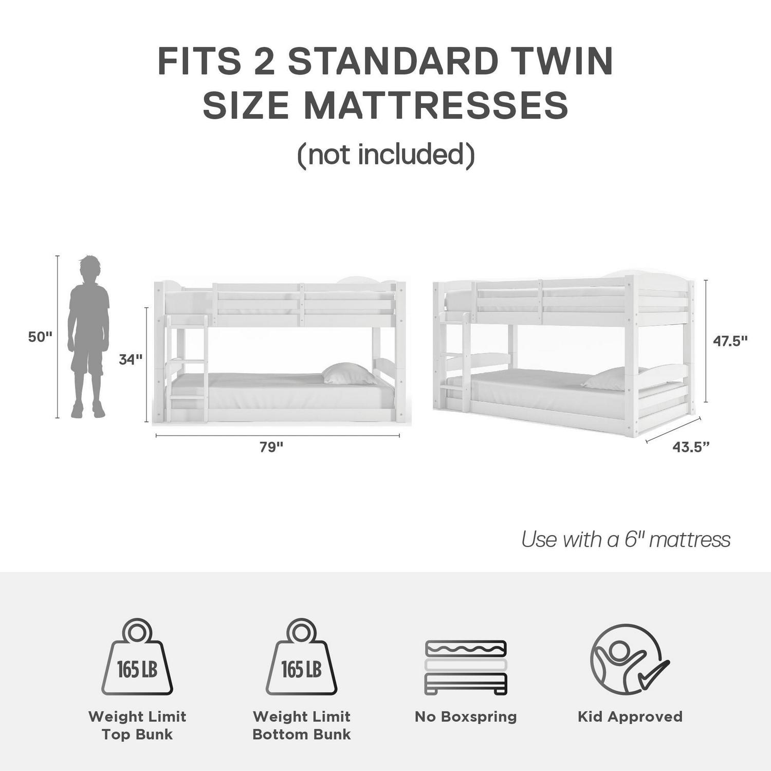 – Twin size floor bunk bed frame that optimizes vertical space. Made with solid wood construction.