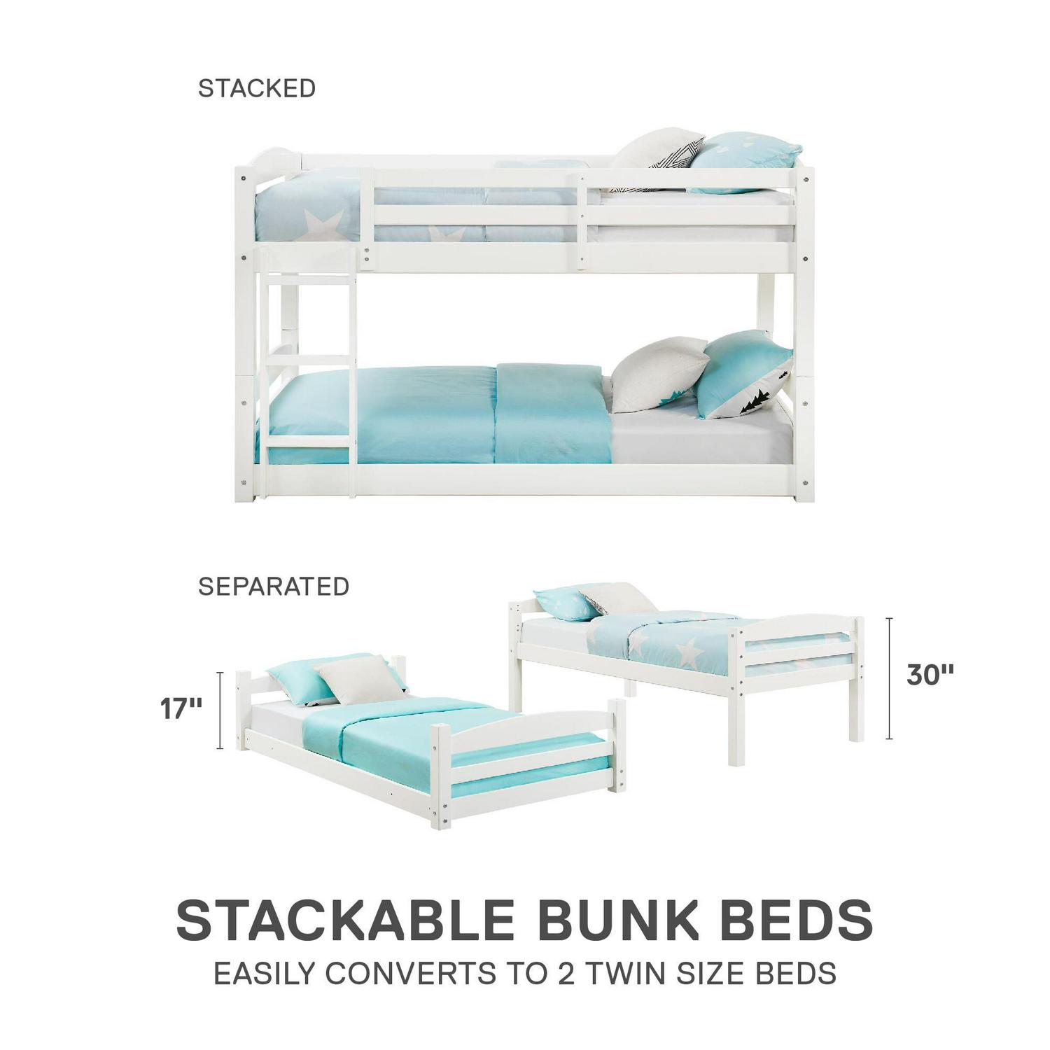 Sleep two in style and maximize vertical space with the fun and safe design of the Better Homes and Gardens Tristan Twin Bunk Bed. With a simple design that is durable and functional, the Tristan features a sturdy wood construction, clean lines and horizontal slats. A perfect option for young siblings sharing a room, and a brilliant solution for sleepovers or out-of-town guests. The customizable Tristan Twin Bunk Bed allows you set to it up to be a standard twin over twin configuration or two freestanding twin beds. The twin bunk bed features a white finish and a built-in ladder that allows for easy, dependable access to the upper bunk without sacrificing personal space. For a fun solution to sleeping two in a room, the Better Homes and Gardens Tristan Twin Bunk Bed is the perfect choice.