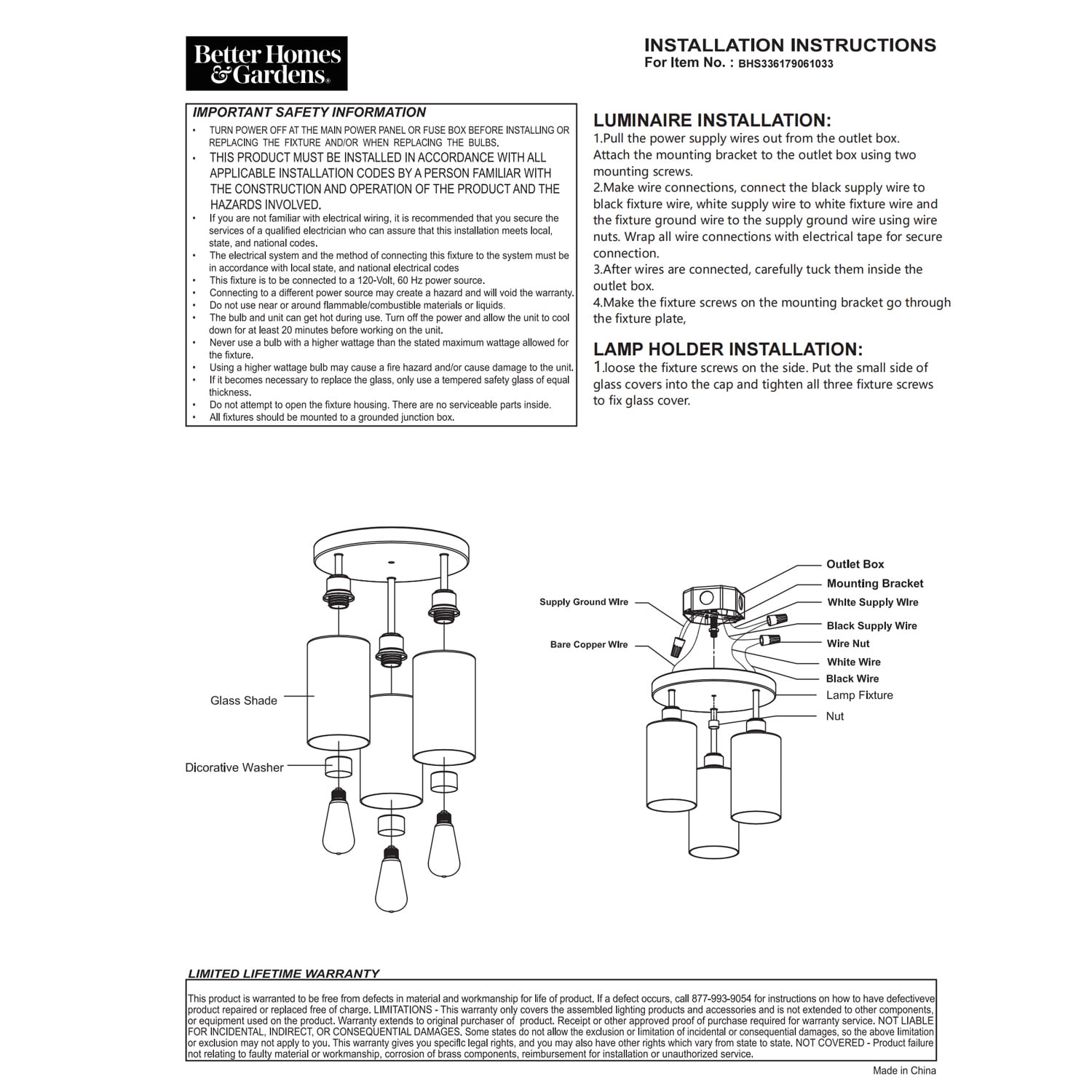 Better Homes & Gardens Three Tiers Flushmount Ceiling Light 3 Light Included Bronze Finish Classic design with three clear glasses and includes three 40W Equivalent ST19 filament bulbs 5 years limited life time warranty for defects in material and workmanship Size: 12.91×12.91×15.35IN ENERGY STAR® certified Light output: 450 Lumen x 3 Color temperature: Soft white 2700K