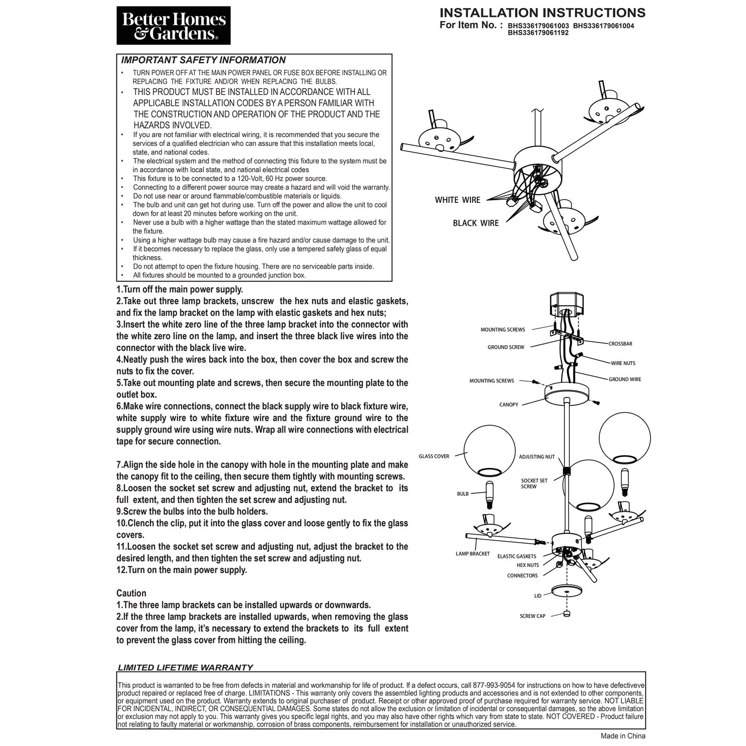 Better Homes & Gardens Three Globe Ceiling Light Light output: 450 Lumen x 3 Color temperature: Soft white 2700K Size: 17.09×15.47×12.6IN Dimmable 3 T6 5W filament bulbs Classic design with three 5W Equivalent T6 filament bulbs 5 years limited life time warranty for defects in material and workmanship Estimated energy cost is $0.6 per year, based on 3 hours per day, 11 ¢/kWh. Cost depends on rates and use Matte Black Finish 15000H life time BHS336179061003