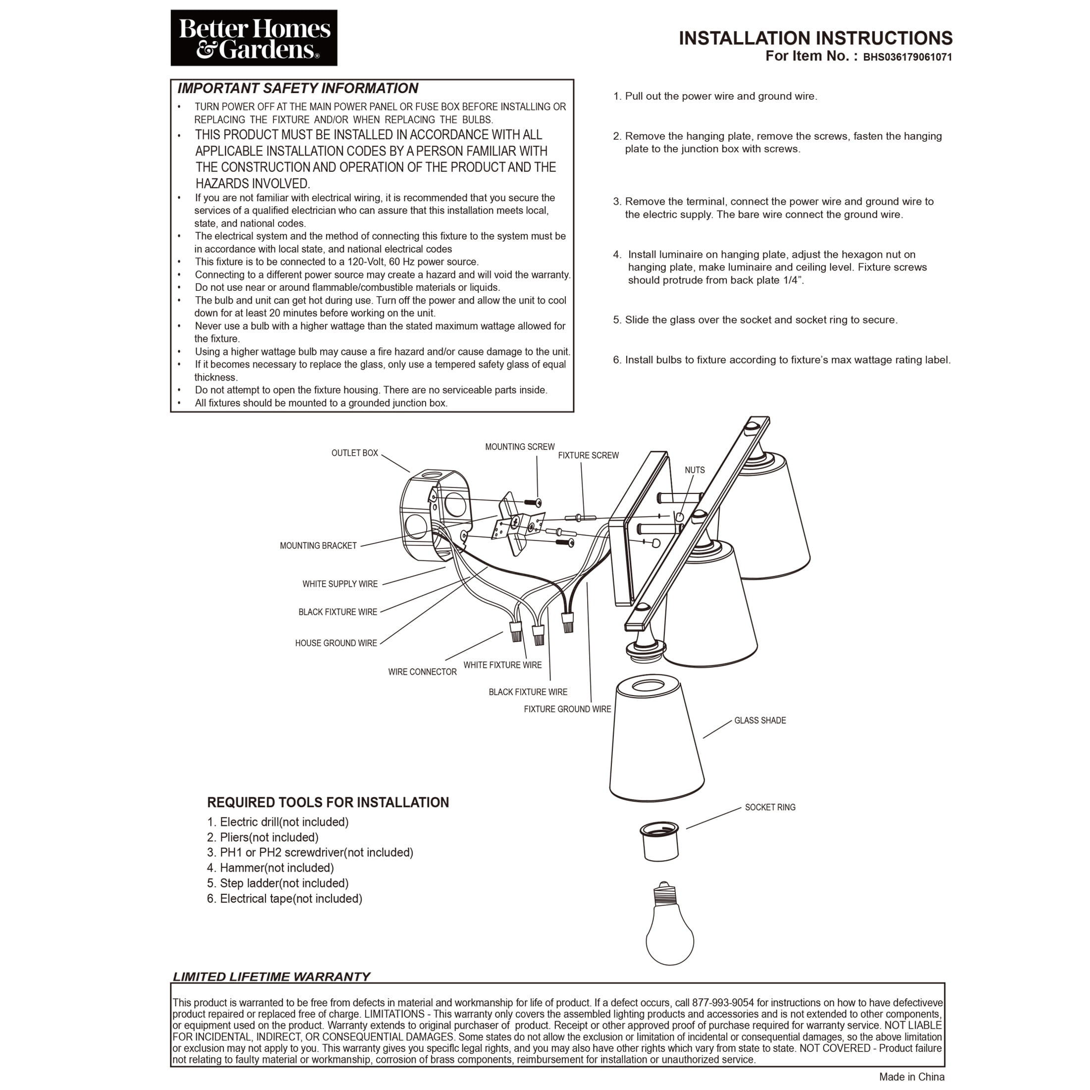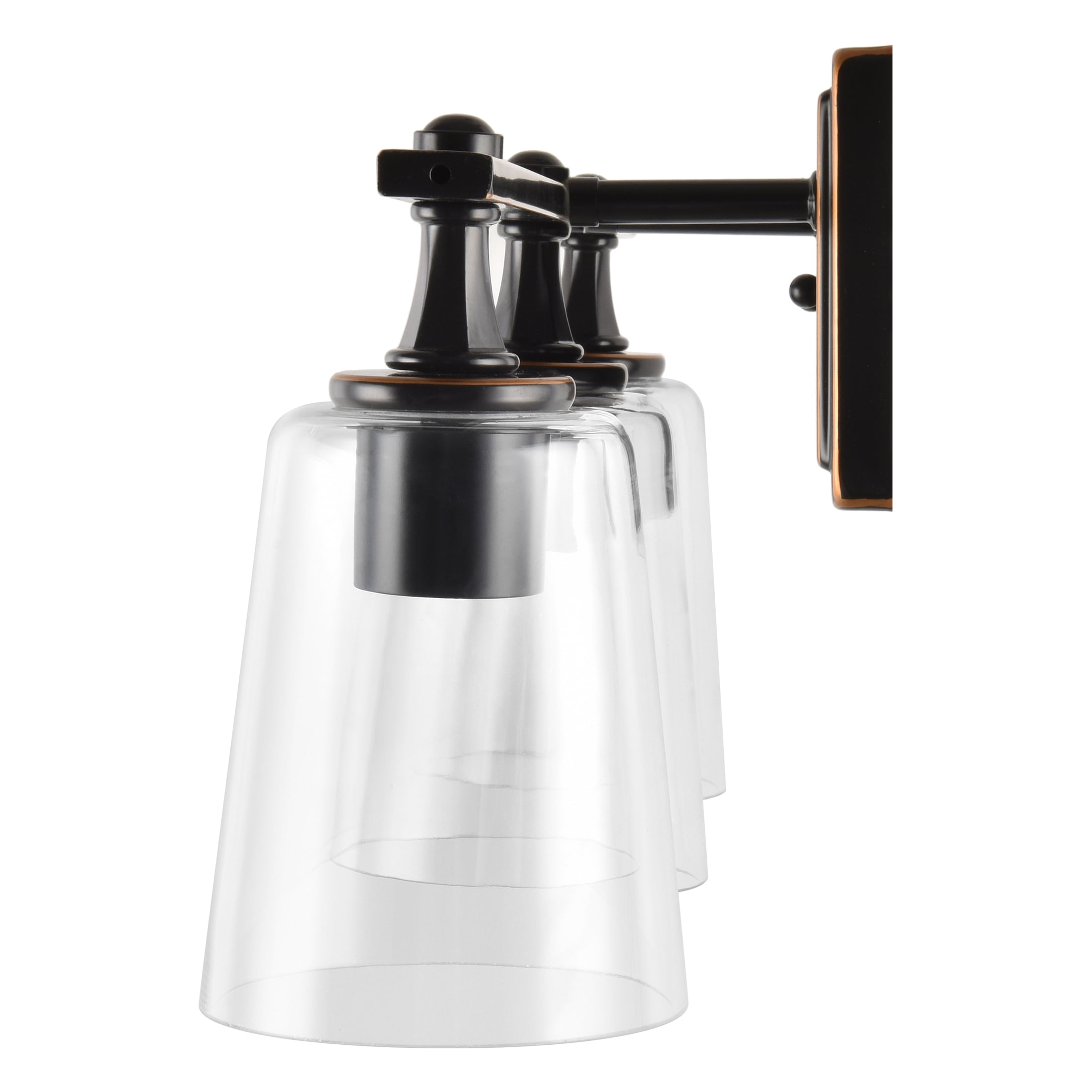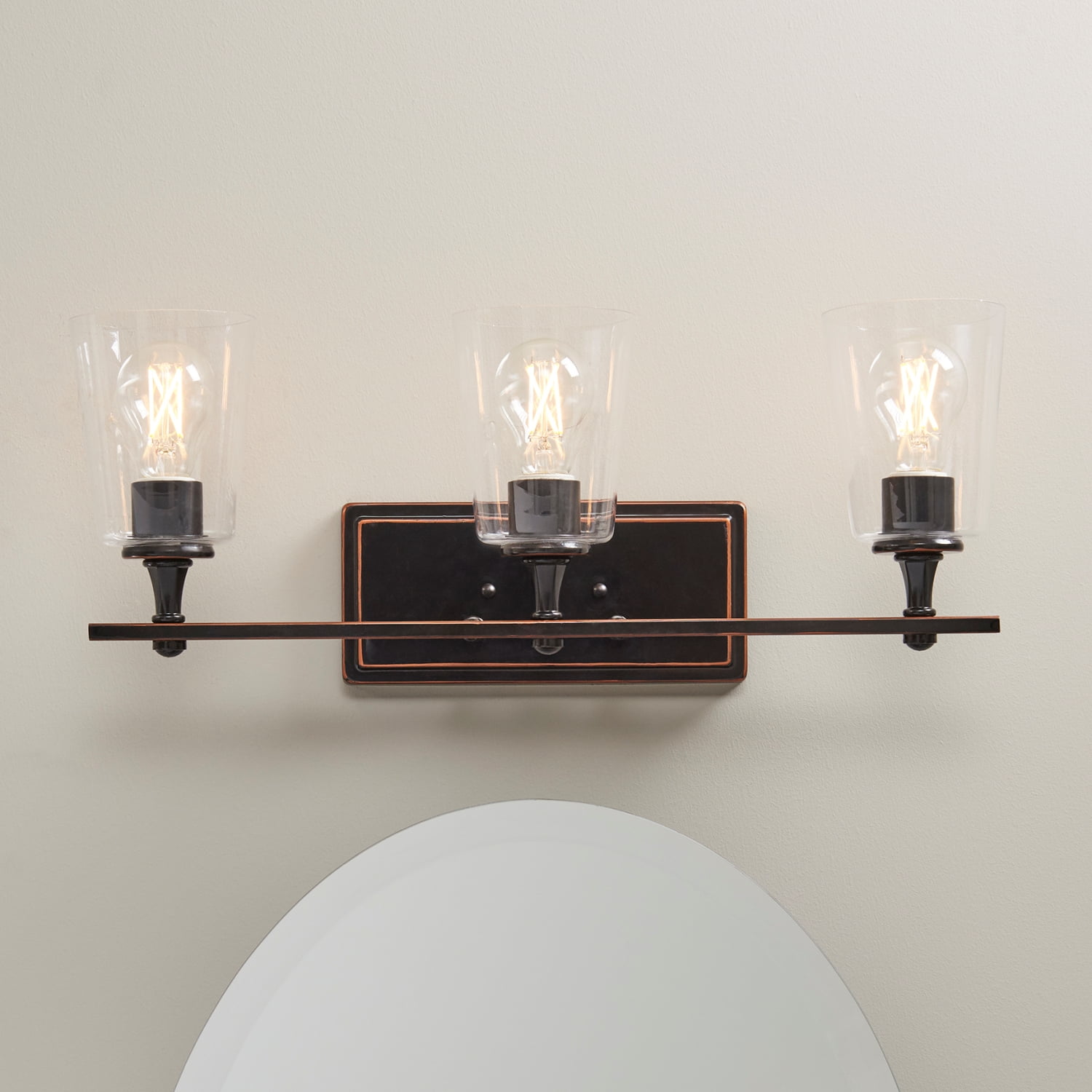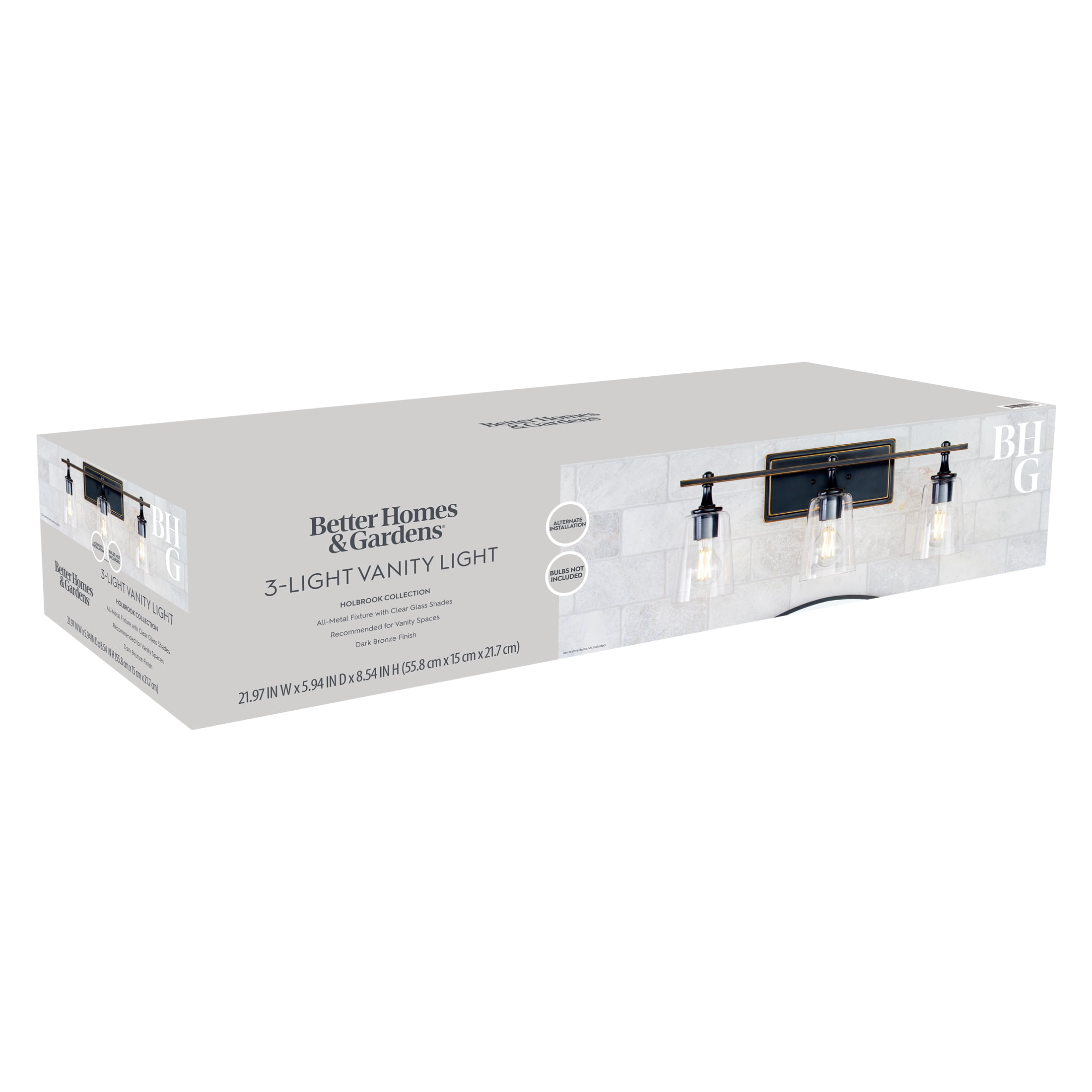 Better Homes & Garden 3-Head Vanity Light Crafted from metal with aged bronze finish Includes 3 Clear glass shades Compatible for use with dimmer switch Damp rated – suitable for used indoors and covered outdoors 120V Hardwired; professional installation recommended Requires (3) E26 Medium base Light Bulbs Vintage LED Light Bulbs are recommended, not included Modern Style BHS036179061071