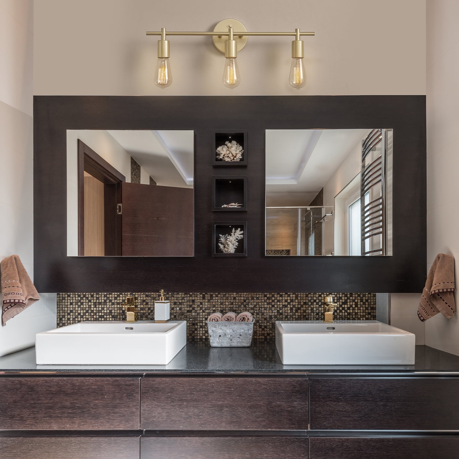 VERSATILE PLACEMENT: with the ability to mount this fixture horizontally or vertically, and with the lights pointing up or down, this light is super versatile and can be used on top of a mirror, on either side of a mirror or even in a gorgeous modern kitchen – the choice is yours MINIMALIST DESIGN: the super trendy burnished brass finish of the Better Homes & Gardens 3-Light Vanity Light is paired with an open socket construction and clean silhouette to showcase the wonderful world of minimalist design DIMMABLE: with compatible dimmer switch (sold separately)