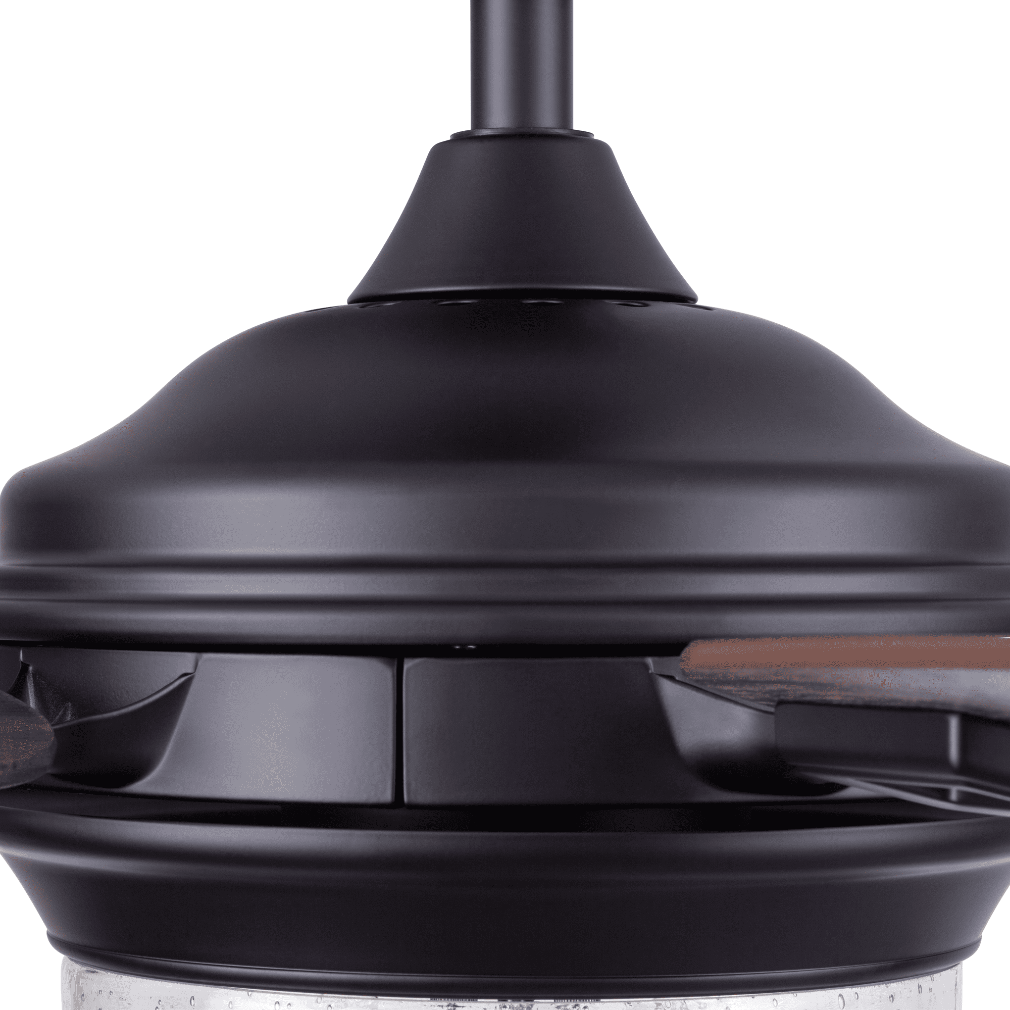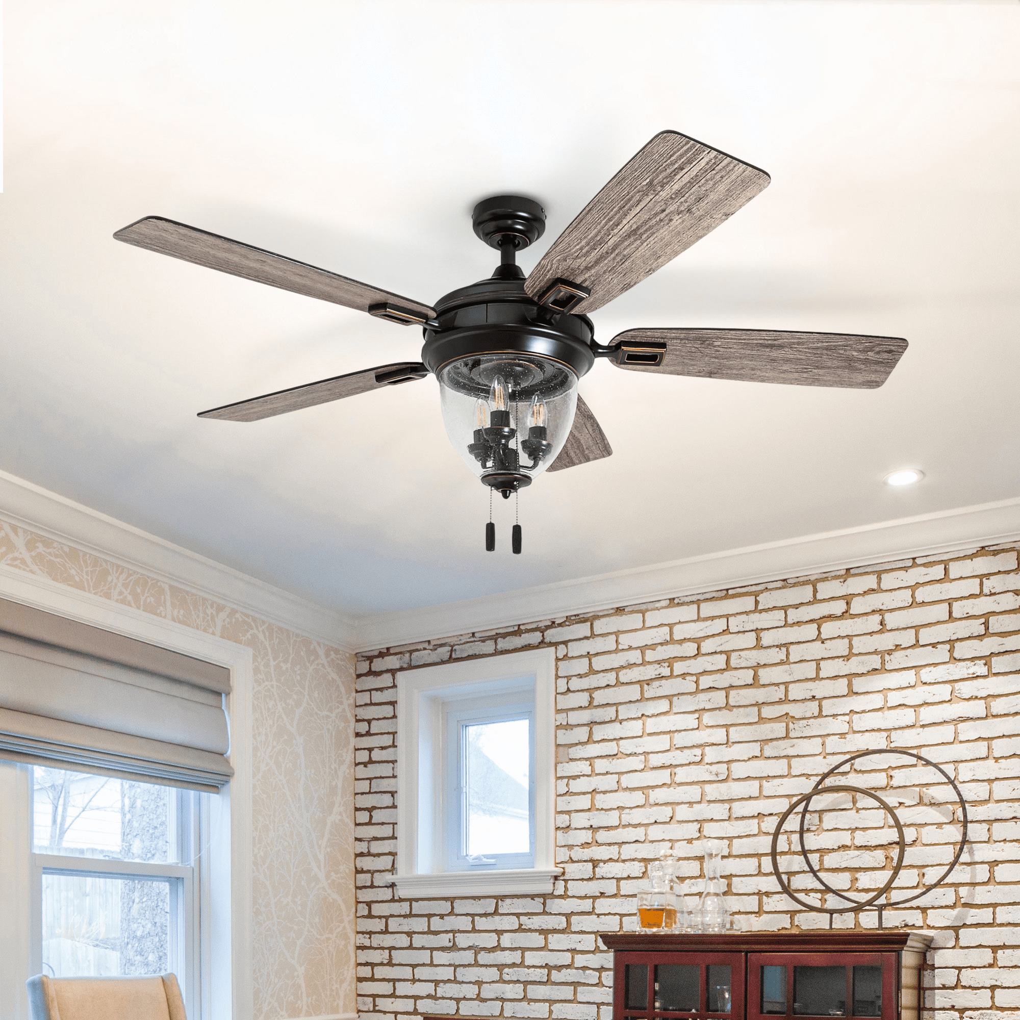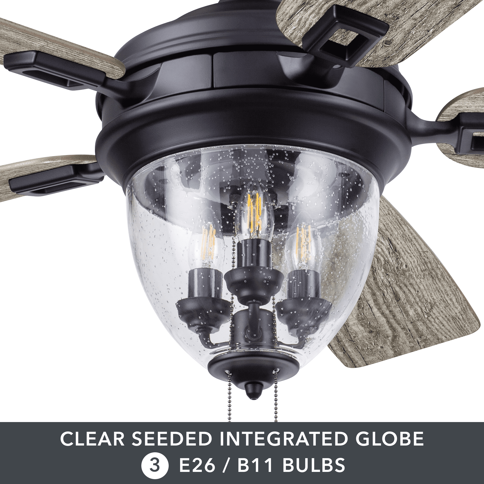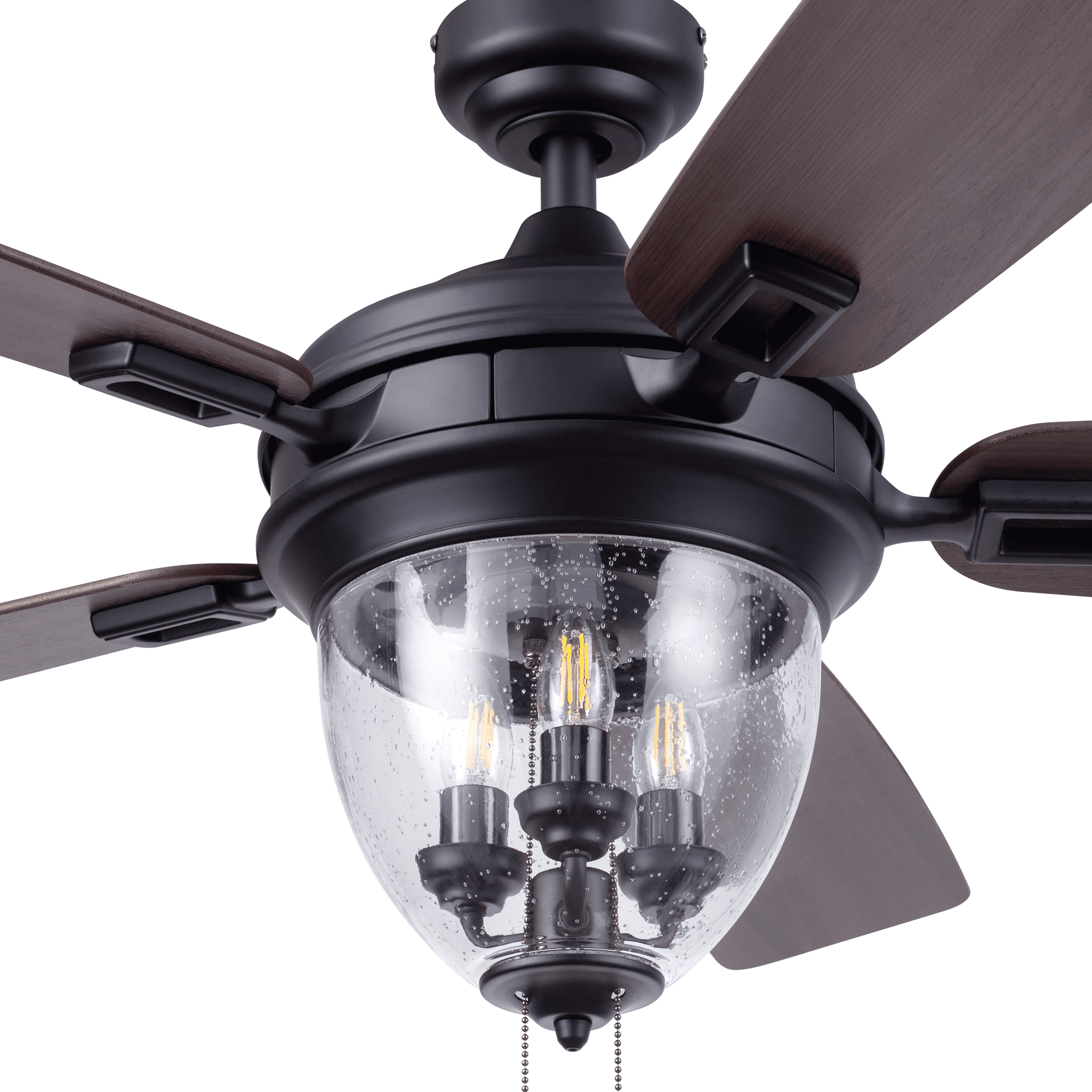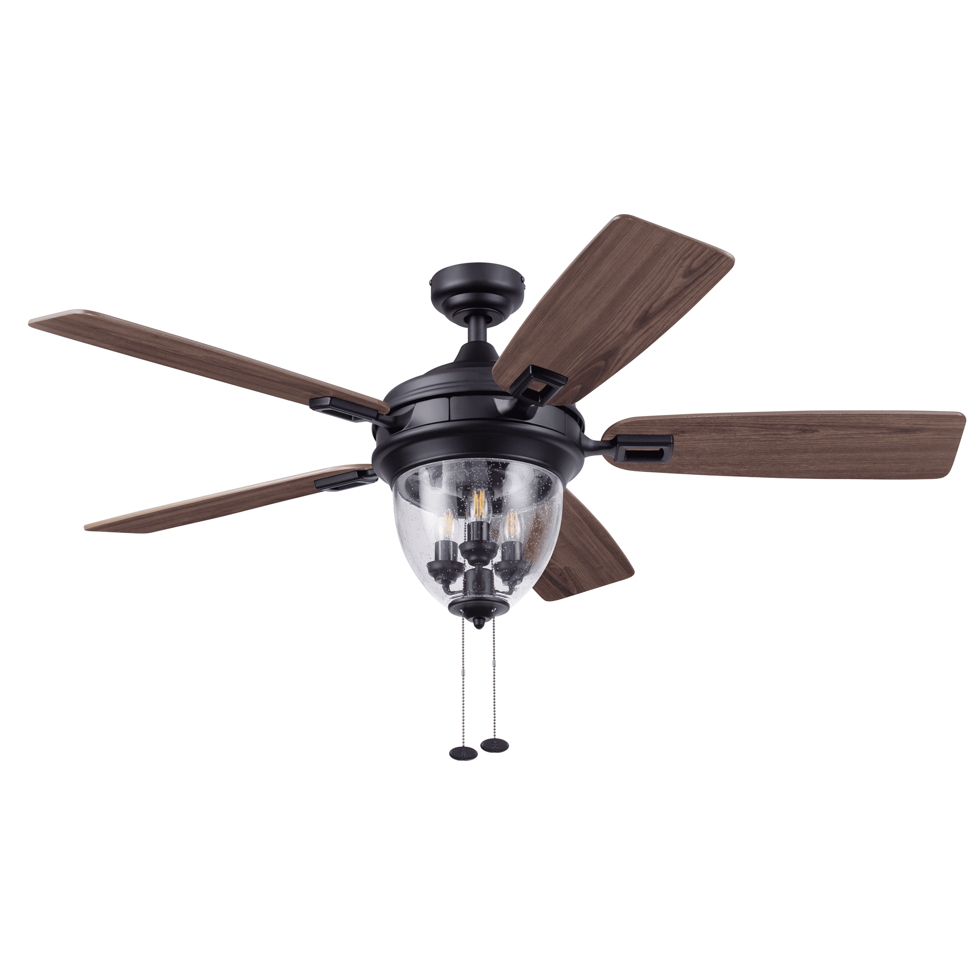 The Better Homes & Gardens 52″ Matte Black 5 Blade Indoor/Outdoor Ceiling Fan with Seeded Glass Bowl is perfect addition to your space, serving up both adequate air flow and a fresh take on a timeless style. This fan is damp rated and a perfect match for any large to medium sized covered outdoor living space- patios, porches, pergolas, etc. With three pull-chain adjustable speed settings, this fan is sure to deliver a high quality, quiet performance while saving energy both in the summer and winter months. It is very easy to install and can be conveniently mounted from both standard and angled ceilings. It includes three E26, B11 filament LED bulbs, sure to timelessly illuminate your space. Each of the five blades is reversible, offering a choice between trendy Aged Teak and classic Dark Walnut, both equally complementing the Matte Black housing finish.