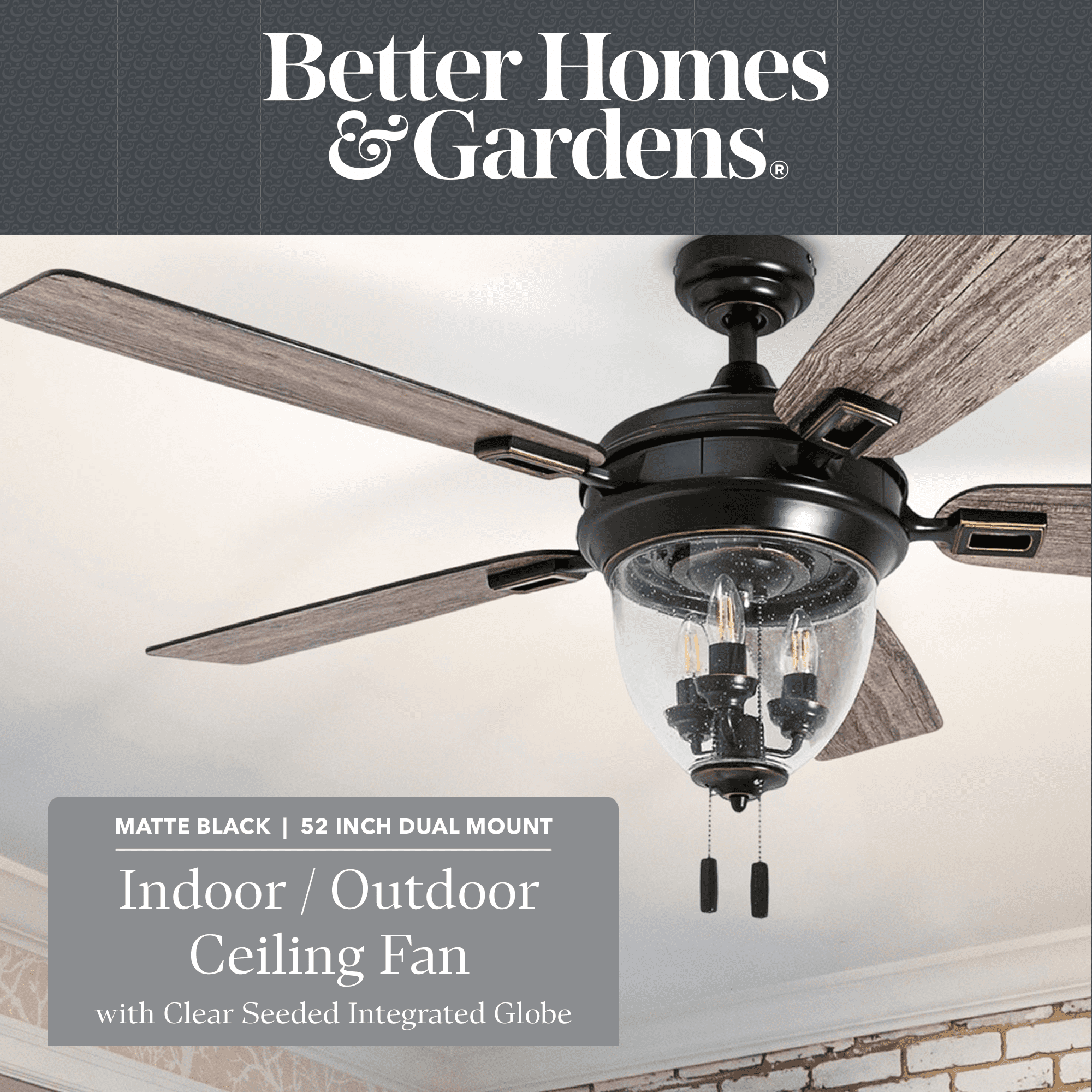 Better Homes & Gardens 52″ Matte Black Indoor/Outdoor Ceiling Fan with Lights, 5 Blades, Pull Chains & Reverse Airflow