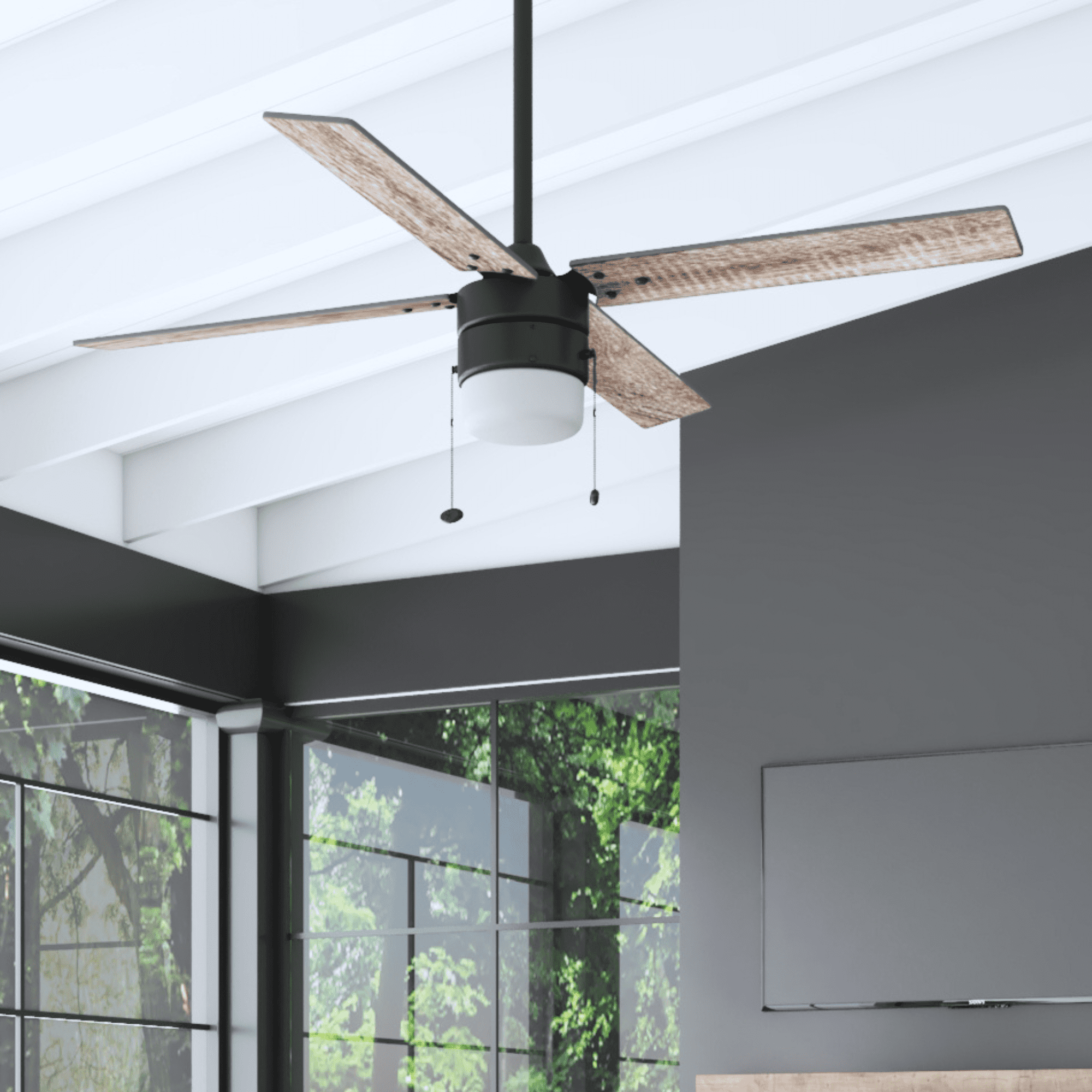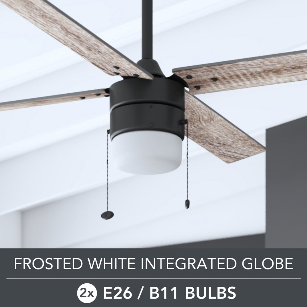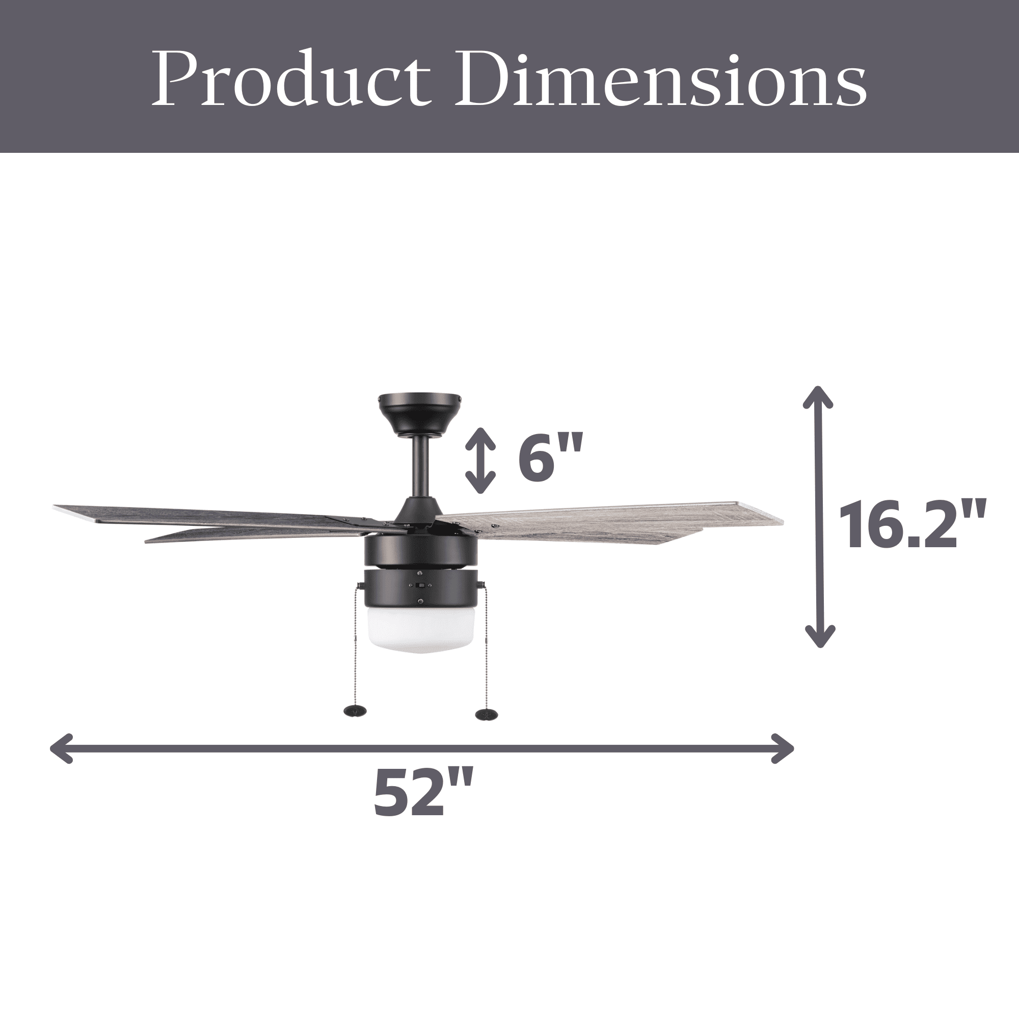 Keep Cool With The Correct Ceiling Fan Size: This 52 inch indoor ceiling fan is ideal for large areas up to 400 sq. ft. such as bedrooms and living rooms. Two Mounting Options: Standard option includes a 6 inch downrod; angled mount option allows for hanging on vaulted ceilings with a longer downrod (sold separately) Reversible Fan For All Seasons: Improves air circulation in winter and summer; During summer, this ceiling fan optimizes airflow to enhance comfort; During winter, change the direction to evenly distribute warm air on low speed Indoor Ceiling Fan: Perfect for living rooms, bedrooms, and offices Pull Chain Control: Easy-to-use pull chains are included for quick adjustments to the light and speed settings Ceiling Fan With Light: Includes a frosted integrated plastic globe that houses an E26, A19 LED bulb Reversible Blades: Choose between Rough Pine and Coal to best fit your space Crafted With High-Quality Material: The high-capacity motor delivers powerful airflow and quiet performance for years to come; This durable and modern ceiling fan is designed for long lasting comfort; ETL listed