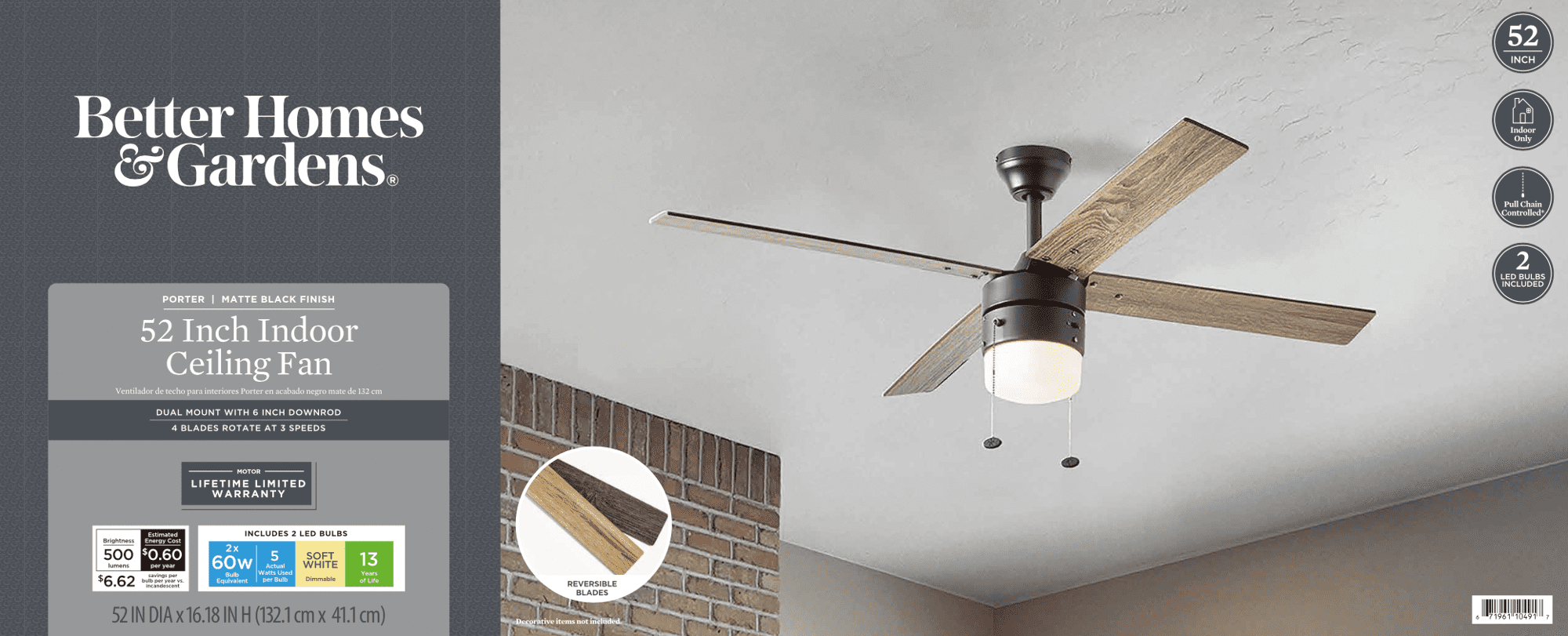 Better Homes & Gardens 52″ Modern Black Indoor Ceiling Fan with Light, Pull Chain Control & Reverse Airflow