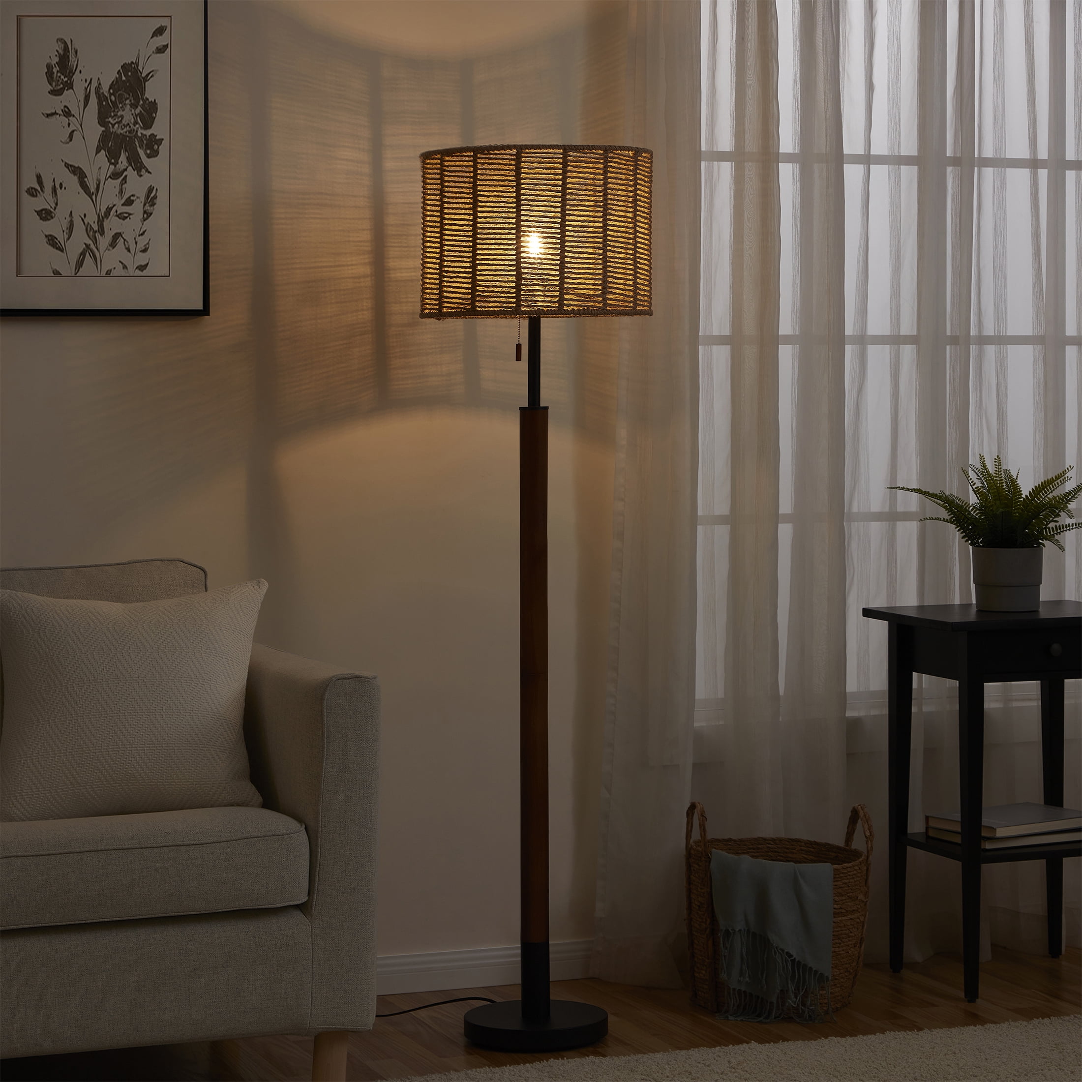 Standing floor lamp with jute shade Features wood finish accents and woven jute rope lampshade Natural textured design creates a laidback, boho look Sturdy, weighted round metal base 60-inch overall lamp height, 16-inch shade diameter Ideal lighting accent for living rooms, bedrooms, offices, dorm rooms, and more Requires E26 light bulb (not included)
