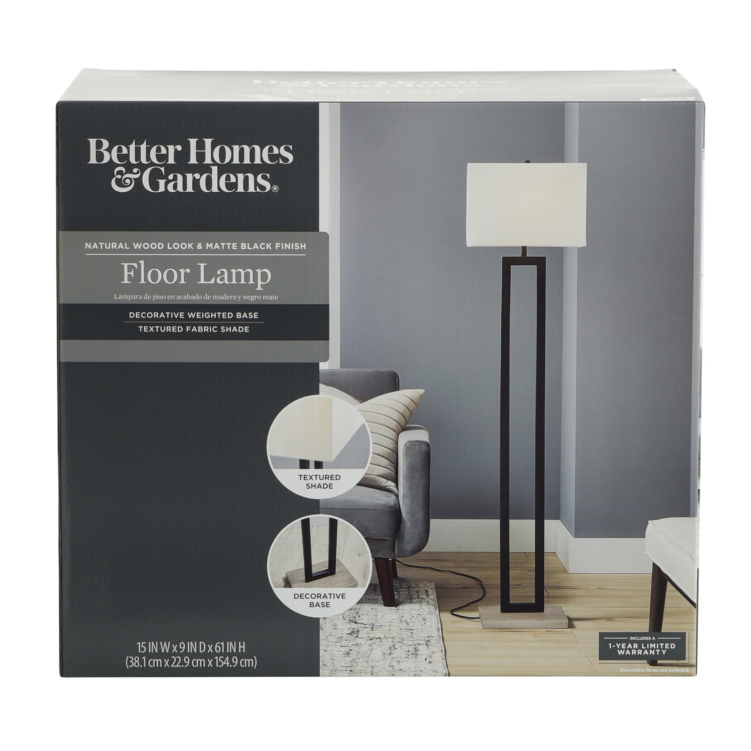Decorate and illuminate your space with the Better Homes & Gardens 61″H Metal Windowpane Floor Lamp, Black Finish with Faux Wood Base. It adds soft ambient lighting and elegant style to almost any room. The 61” metal floor lamp in an elevated painted black finish features a natural finish faux wood base. This lamp works well in your bedroom, living area or office. It features a stylish rectangular fabric shade and an easy-to-reach on/off rotary switch located on the socket underneath the shade to turn it on and off with a simple click. Enjoy a classic yet transitional look in your home with this Better Homes & Gardens Floor Lamp.