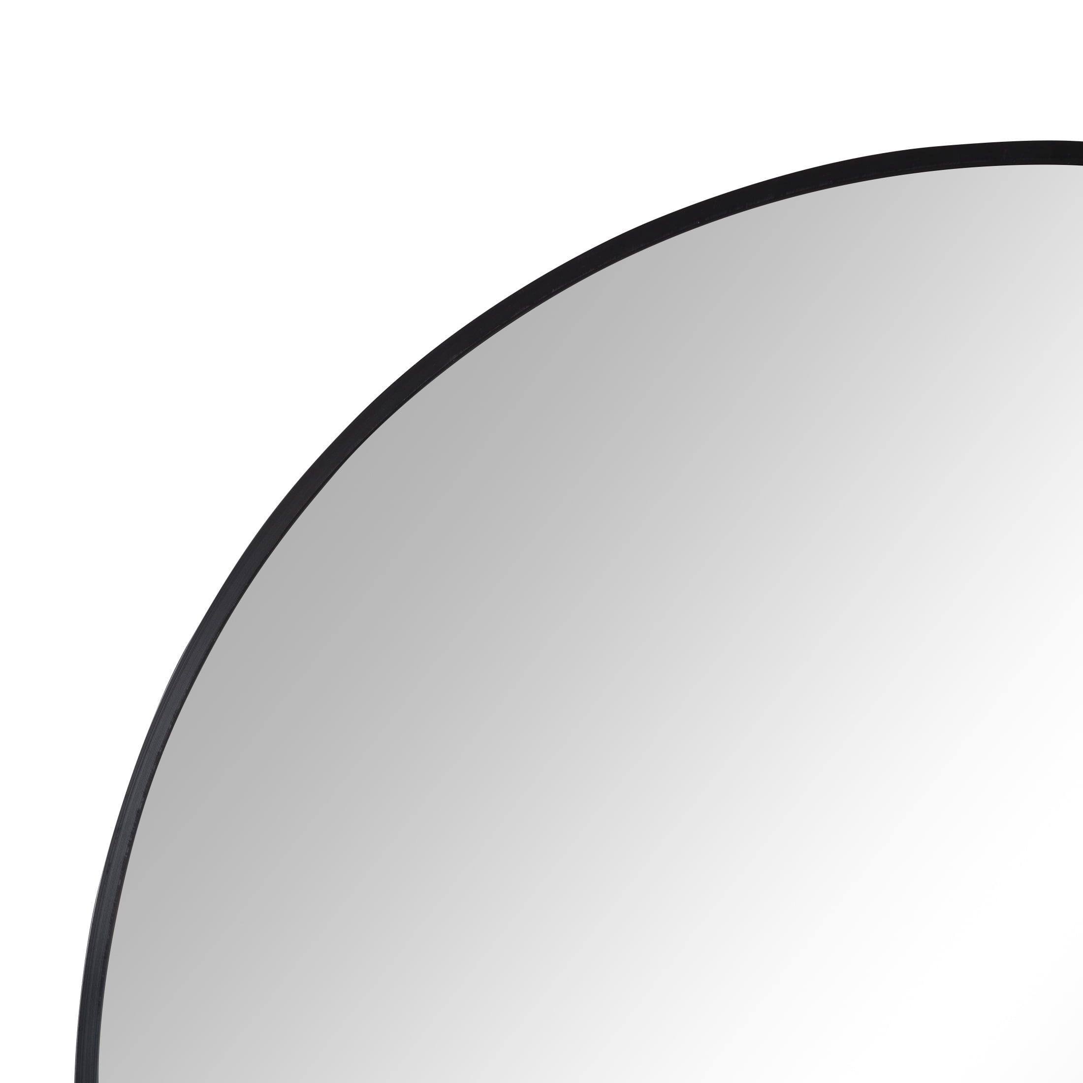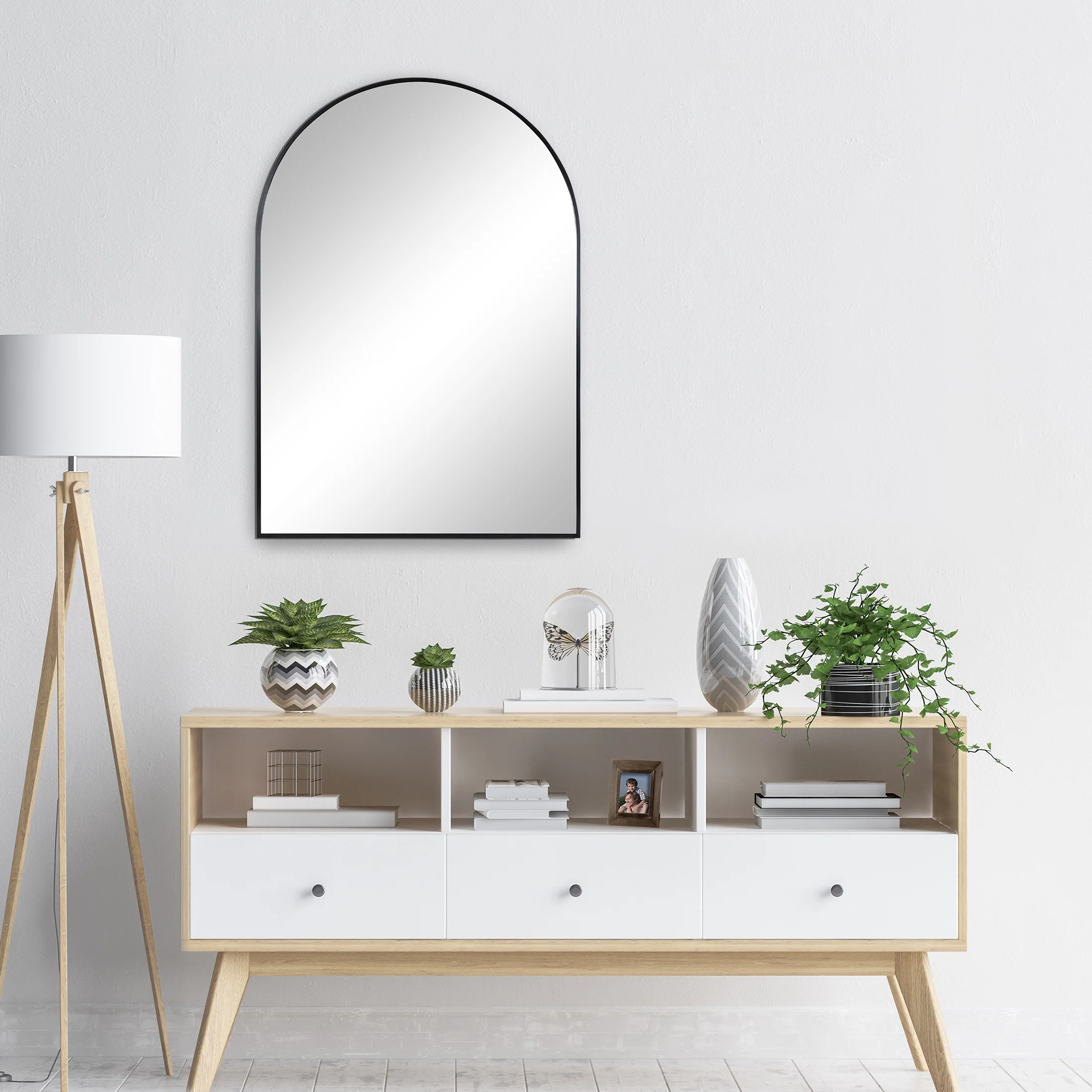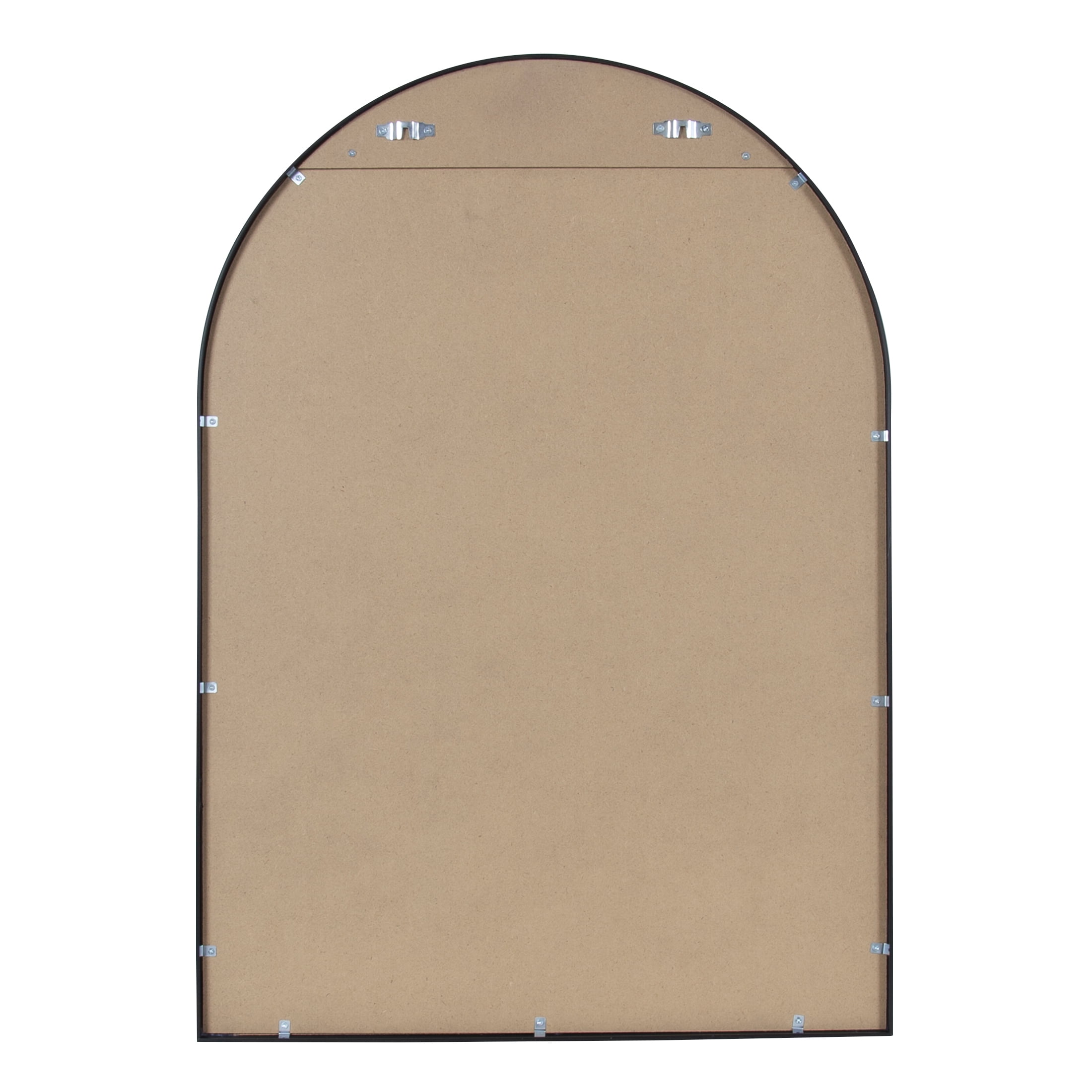 24″ x 34″ arched mirror Mid-Century styling Black metal frame Displays vertically Includes attached hardware for wall display