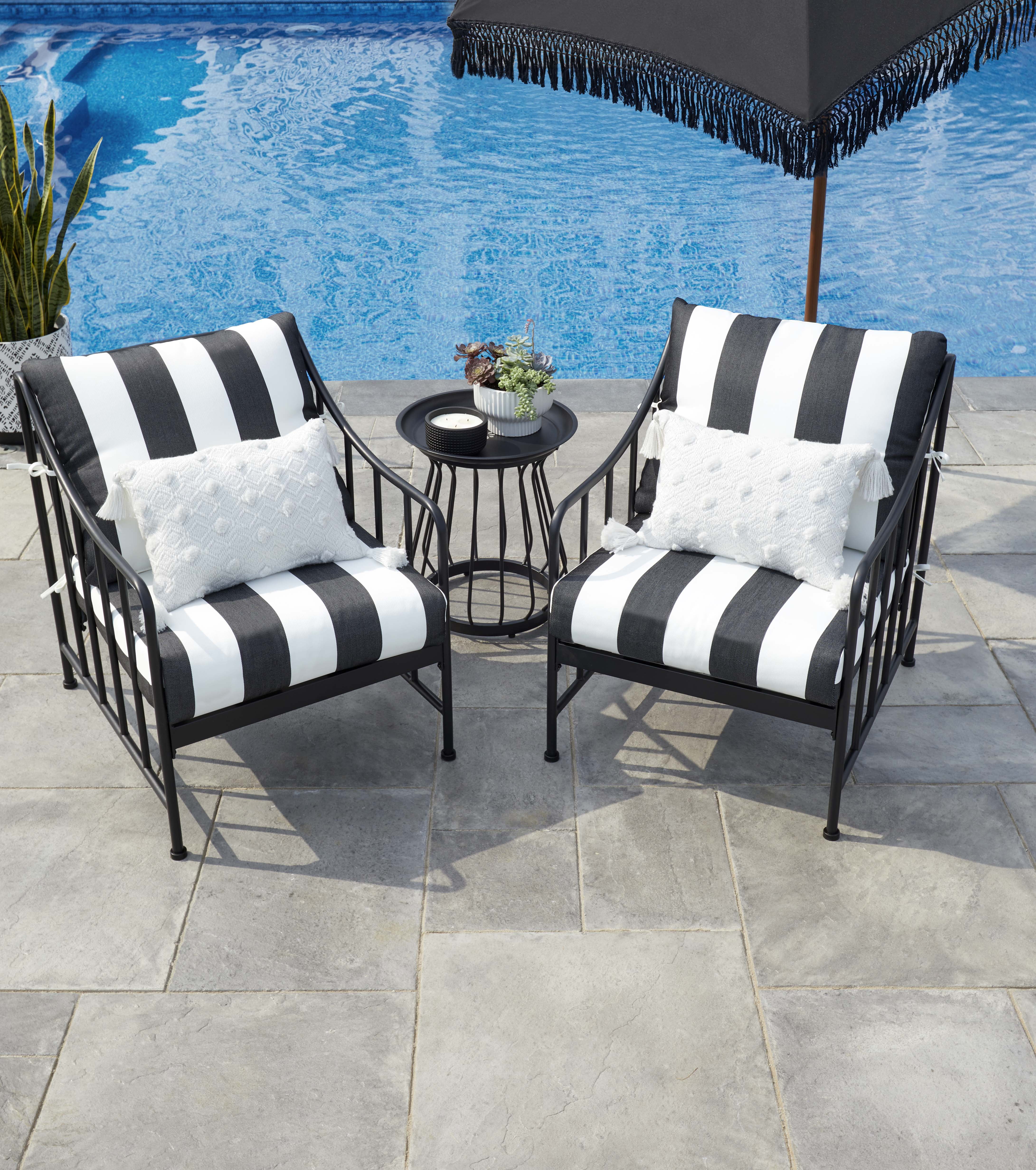 Better Homes & Gardens Aubrey 3-Piece Stationary Conversation Set A conversation is set for two. Complete with two cushioned chairs and one cocktail table Heavy-duty, rust-resistant, e-coated & powder-coated steel frames Plush Solution-Dyed Polyester cushions provide weather-resistant comfort with Scotchgard 3M Color: Black Frame, Black and White Stripe Cushion Chair dimensions: 30.63″ x 26.22″ x 31.81″ Table dimensions: 17.72″ x 17.72″ x 20.79″ Product materials: Steel, polyester SDP Part of the Better Homes & Gardens Aubrey collection Assembly Required Arrives in 1 Box