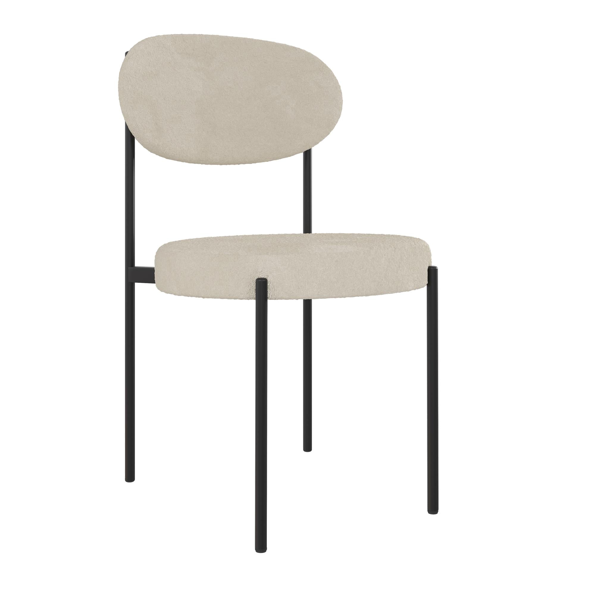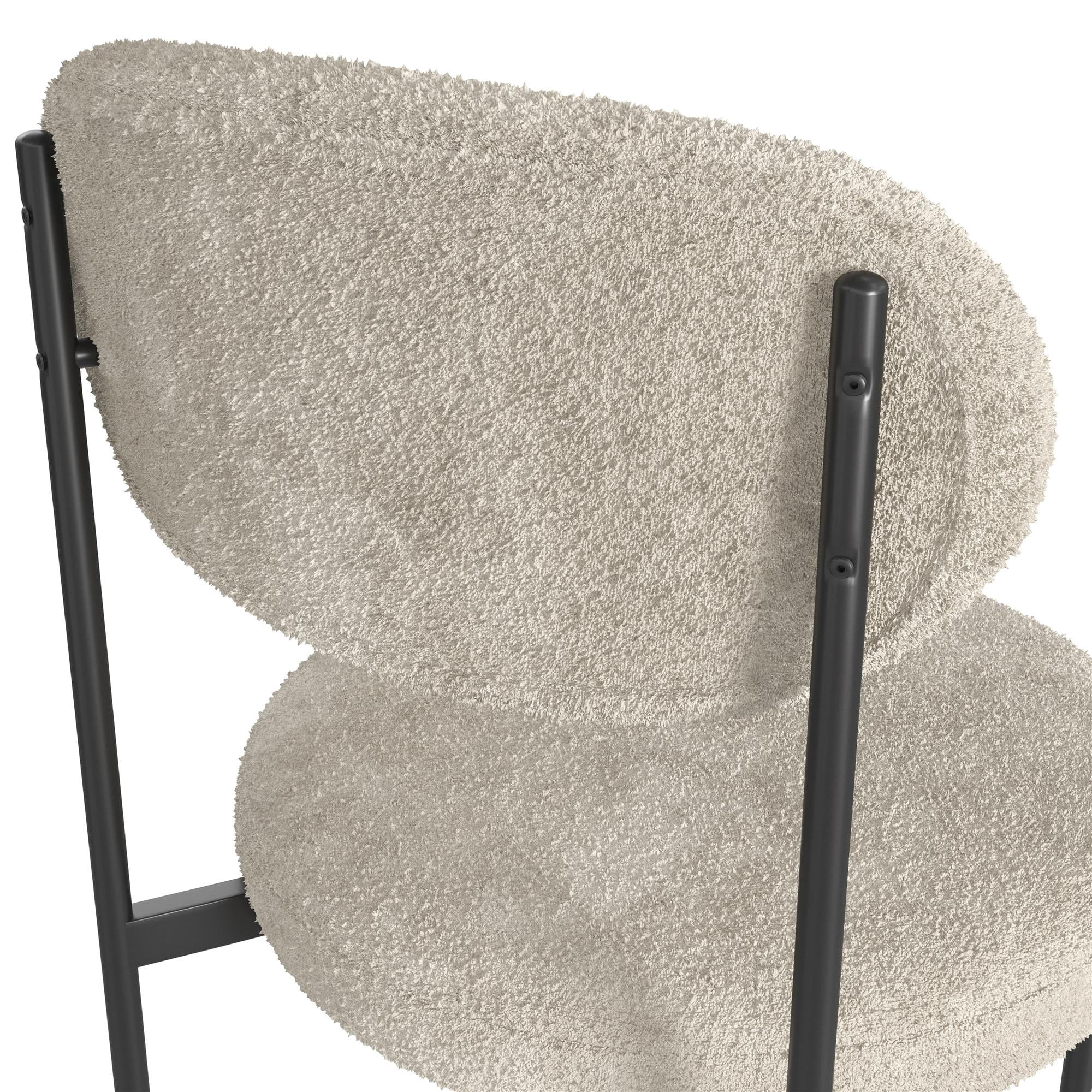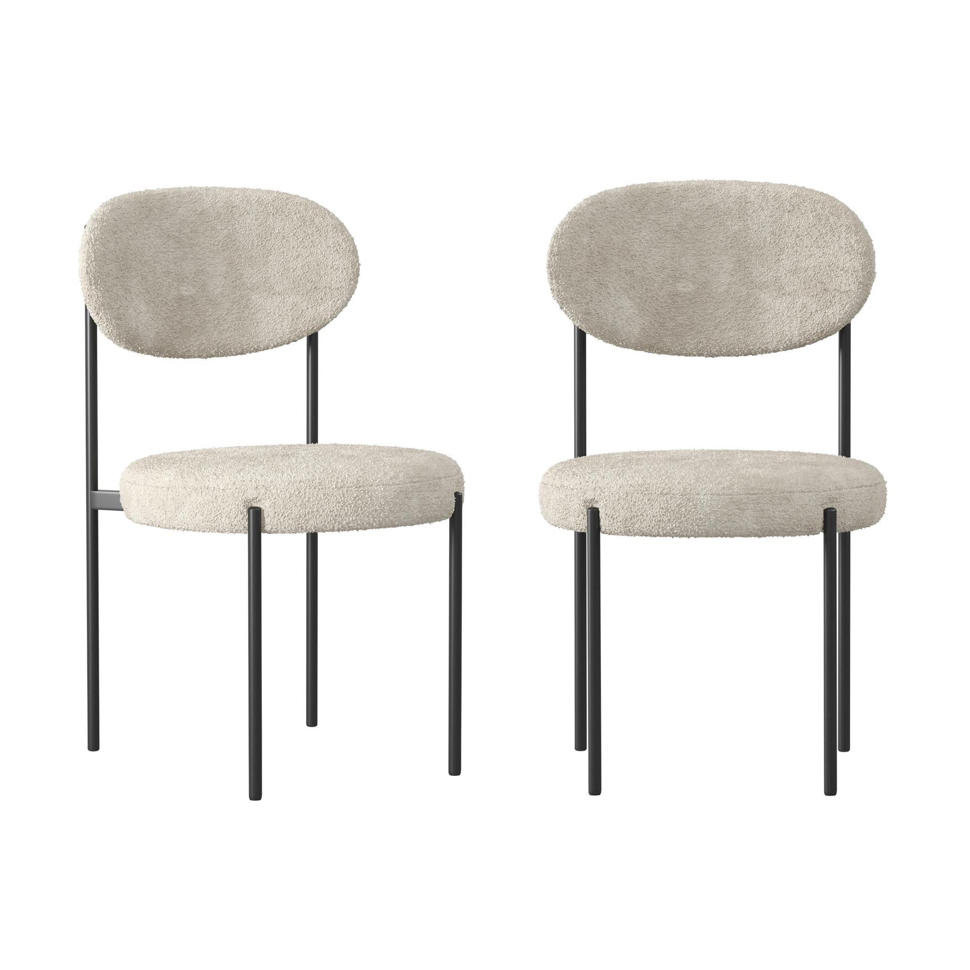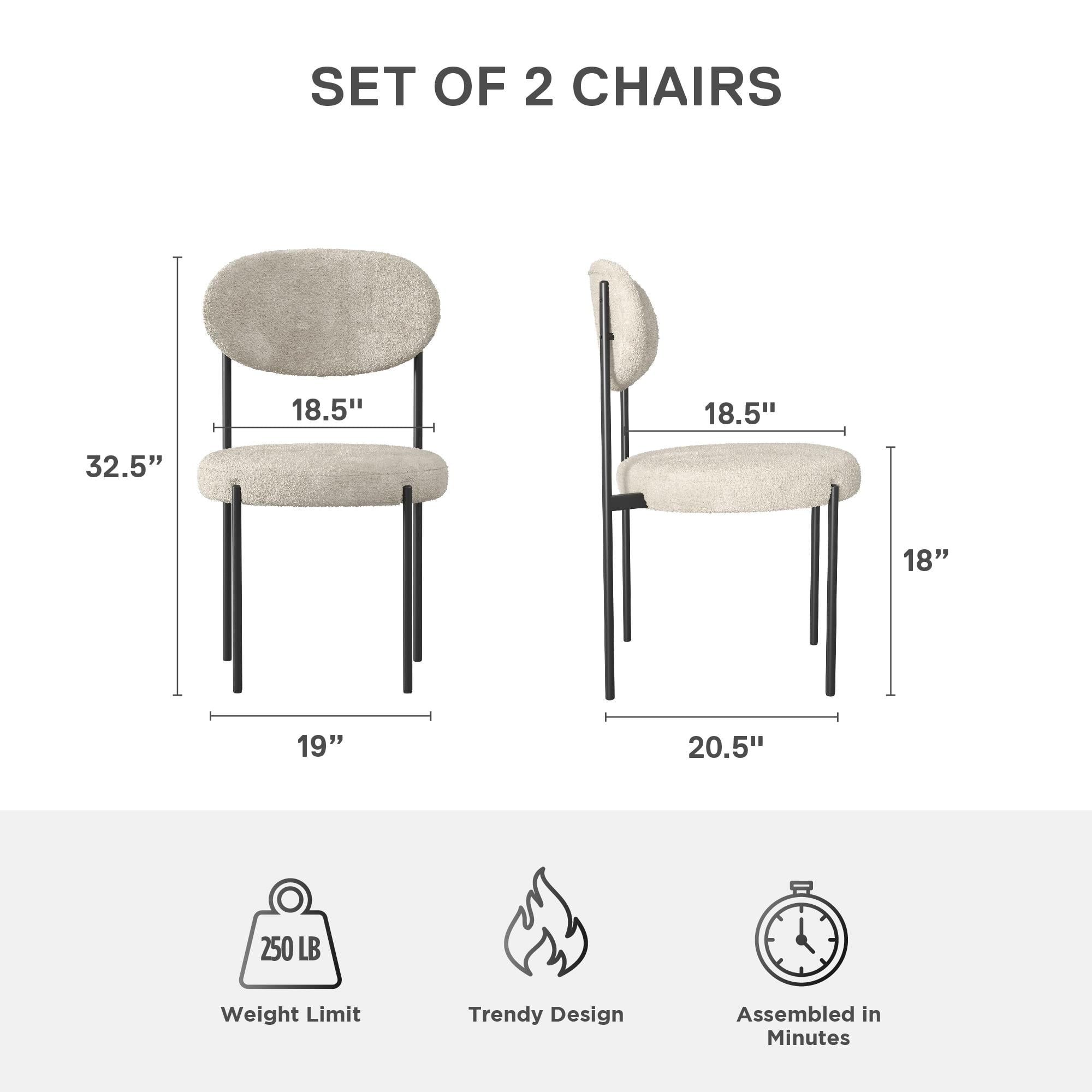 SHERPA SOFT: Our luxe boucle fabric upholstered and cushioned set of 2 dining chairs sport ergonomic design featuring a high curved back for ideal support and wide 3.5-inch-thick seating to sink into for dining room, kitchen, and living room comfort MIDCENTURY MODE: The matte black steel metal frame and high-density foam padded round seat backed by a strong wood base not only draw your eye to impeccable modern style but to the durable build of the dining chairs which also double as accent chairs ADJUSTABLE GLIDERS: Back leg anti-skid plastic caps help your floors from getting scuffed or scratched when moving the chair while adjustable height gliders on the front legs keep your chair level on surfaces to prevent wobbliness and offer stability SPEEDY ASSEMBLY: Set aside only 15 minutes to put this item together. All parts, tools, and easy-to-follow instructions are included in box. Wipe polyester-based material clean with a damp cloth, but avoid excessive rubbing to maintain boucle texture SLEEK SIZE: Dining chair profile: 19″L x 20.5″W x 32.5″H. Seat dimensions: 18.5″W x 18.5″D x 18″H. Weight limit: 250 lbs. Net weight (each chair): 13 lbs. 1-year limited warranty. Each pair sold separately. Matching stool available (not included)