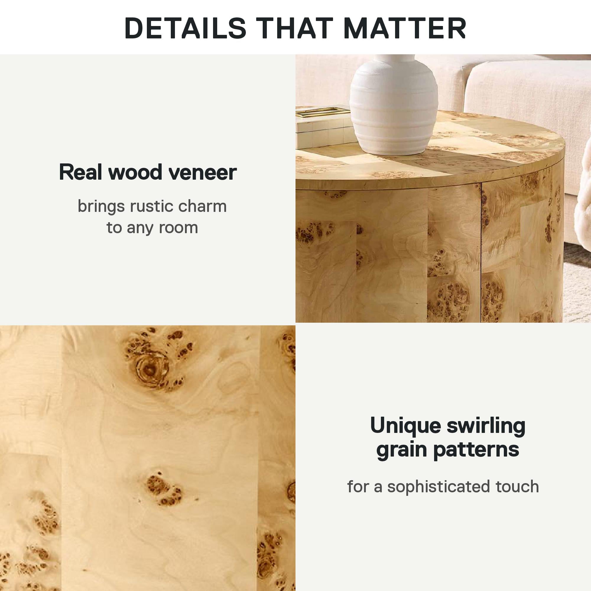 RUSTIC ELEGANCE: Elevate your space with the Better Homes & Gardens Burlwood Round Coffee Table, showcasing swirling grain patterns and warm tones for a sophisticated touch NATURAL CHARM: Crafted from budget-friendly burl wood veneer over durable MDF, this table brings rustic charm to any room, perfect for rustic-chic, modern farmhouse, or bohemian décors TIMELESS BEAUTY: Experience durability and uniqueness with the Burlwood Coffee Table, a one-of-a-kind addition to your living room, bedroom, or office space SHIPPING AND DIMENSIONS: The Burlwood Coffee Table arrives fully assembled; Just unbox, place, and enjoy. Dimensions: 36″ D x 36″ W x 17″ H; Weight 51.6 lbs. 1-YEAR LIMITED WARRANTY INCLUDED: Call centers, staffed by live agents in both the U.S. and Canada, are at your service for any needs related to replacement parts, assembly assistance, or warranty inquiries ONE-OF-A-KIND PIECES: Each piece is unique and made with real wood; Differences in wood grain patterns shown are normal and may occur