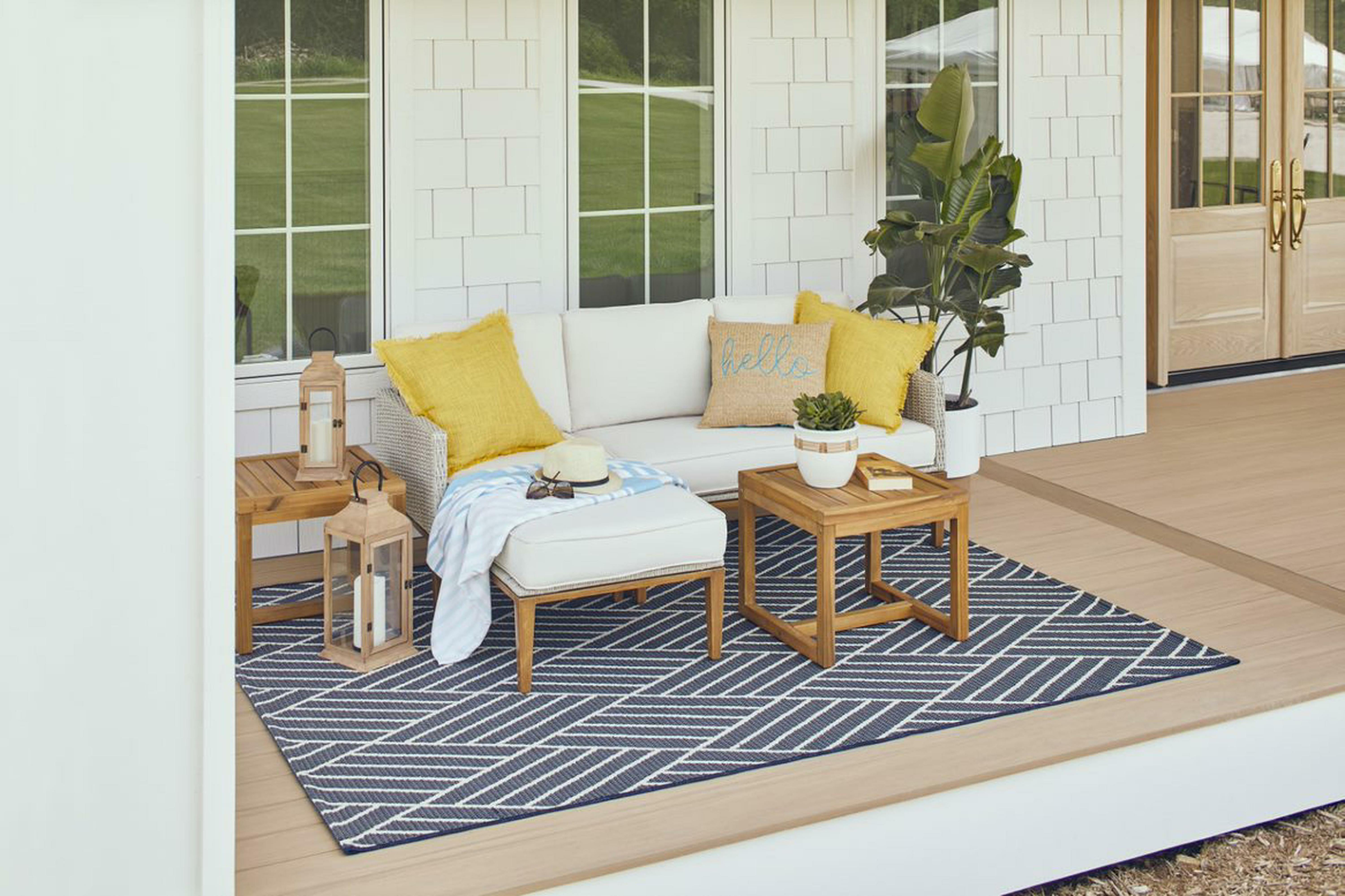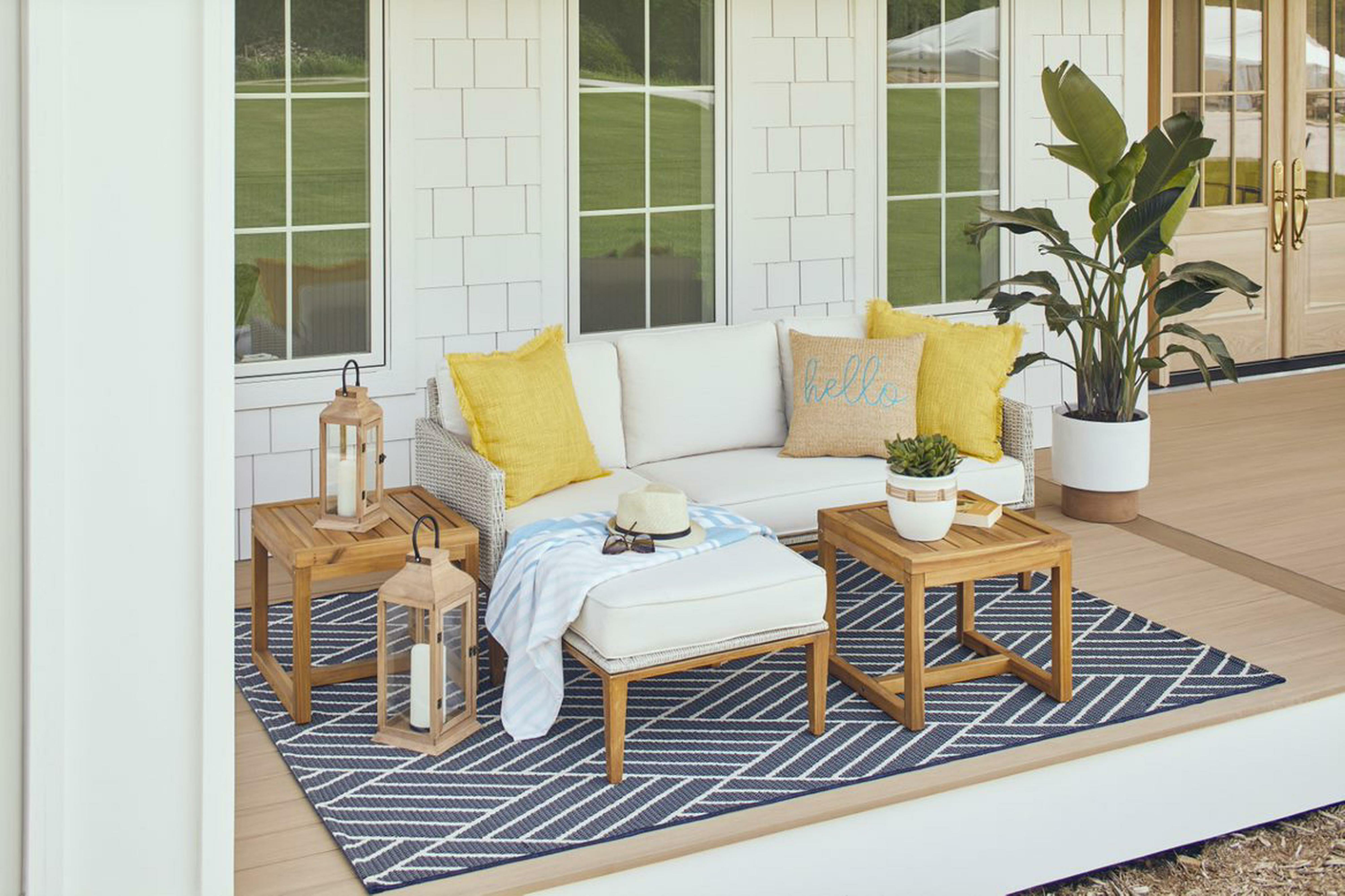 The Better Homes & Gardens Davenport 5-Piece Outdoor Sofa Set makes a great addition to your patio, deck, porch, and other outdoor spaces. This stylish set is weather resilient, durable, and creates a great place for your friends, family, neighbors, and more to gather. The cushions are made with superior fade-resistant 50% recycled polyester fabric for long wear and durability. For increased rust resistance, the steel frames are both e-coated and powder-coated. Enjoy your patio or outdoor room with the Better Homes & Gardens Davenport 5-Piece Outdoor Sofa Set.