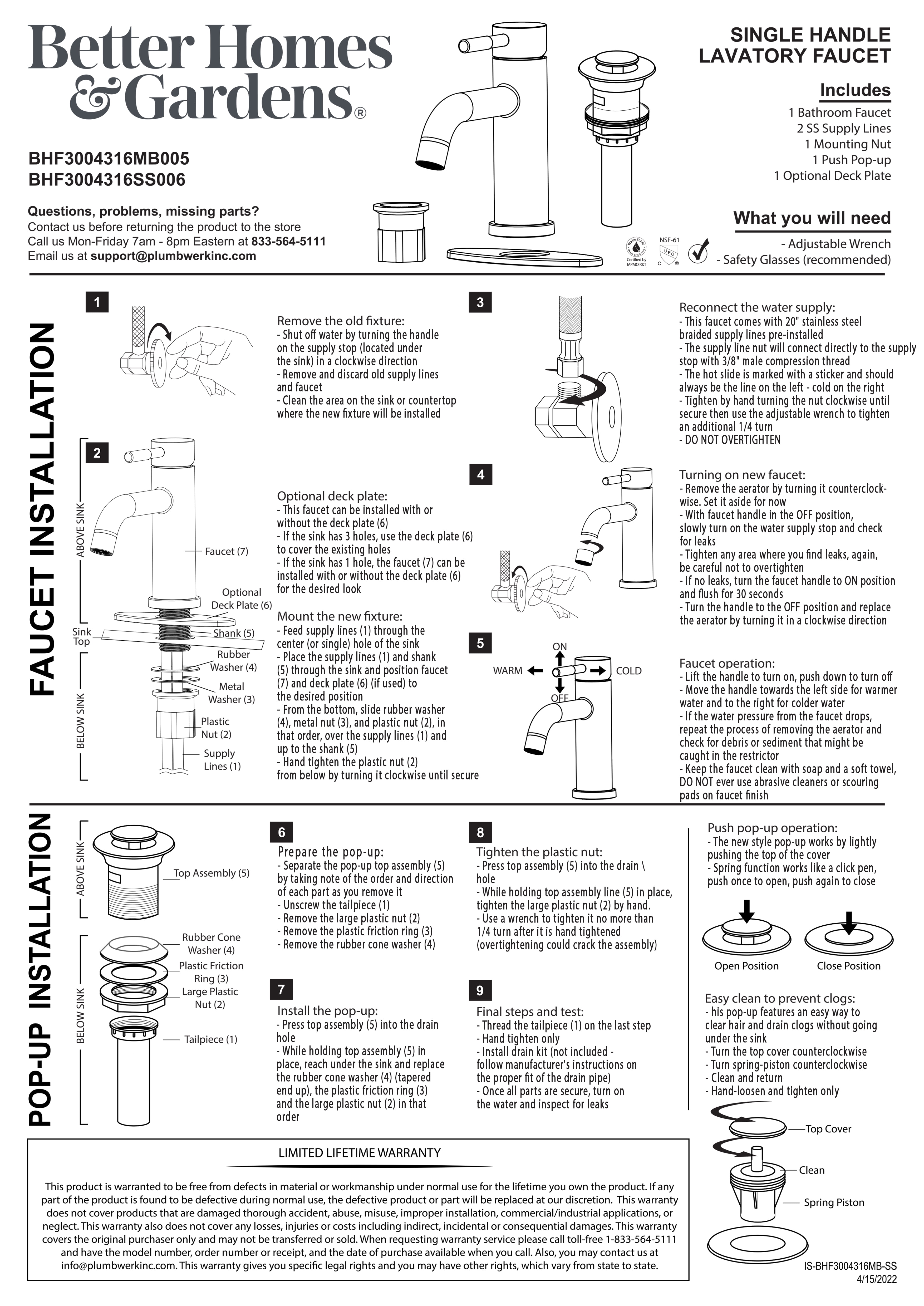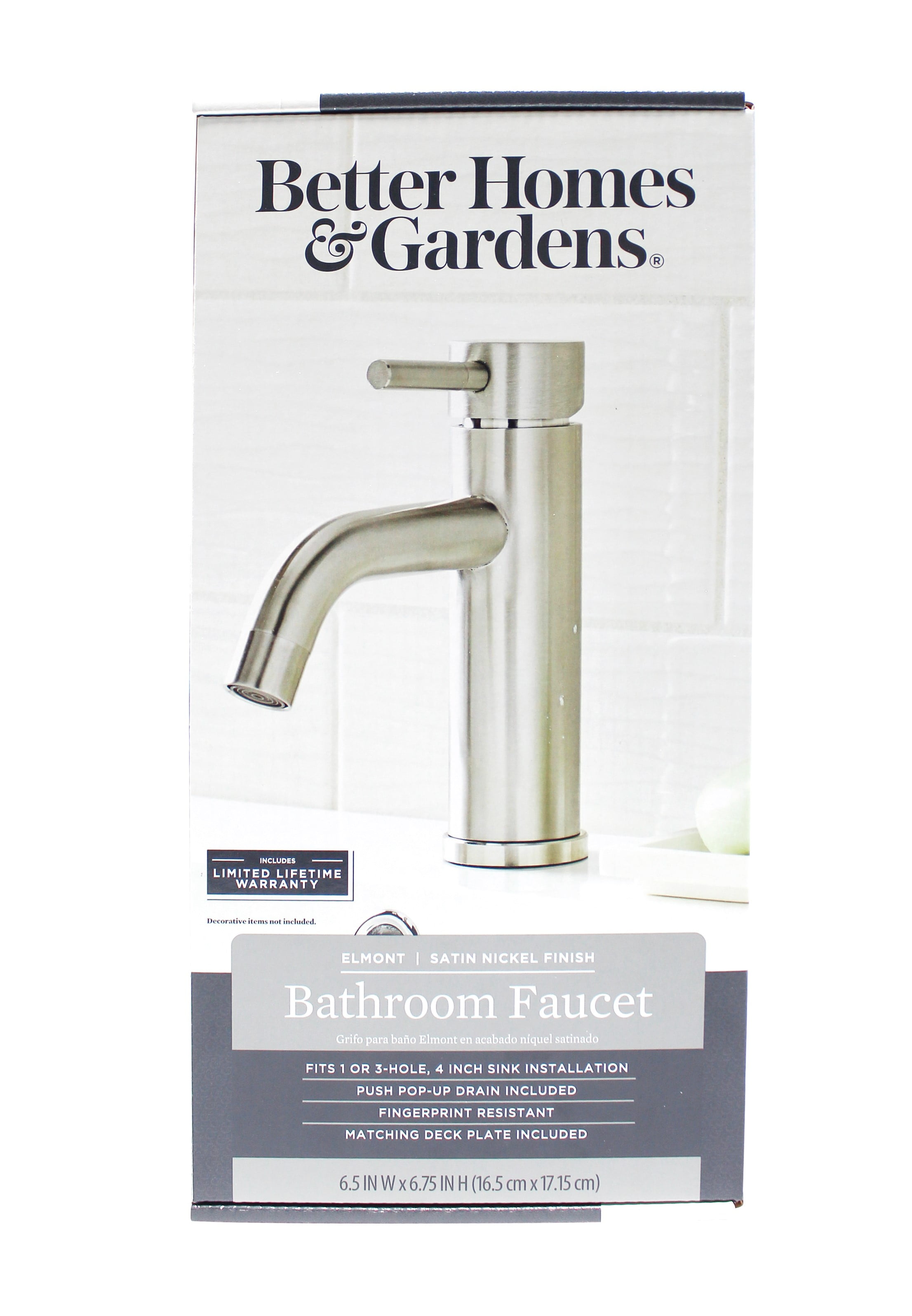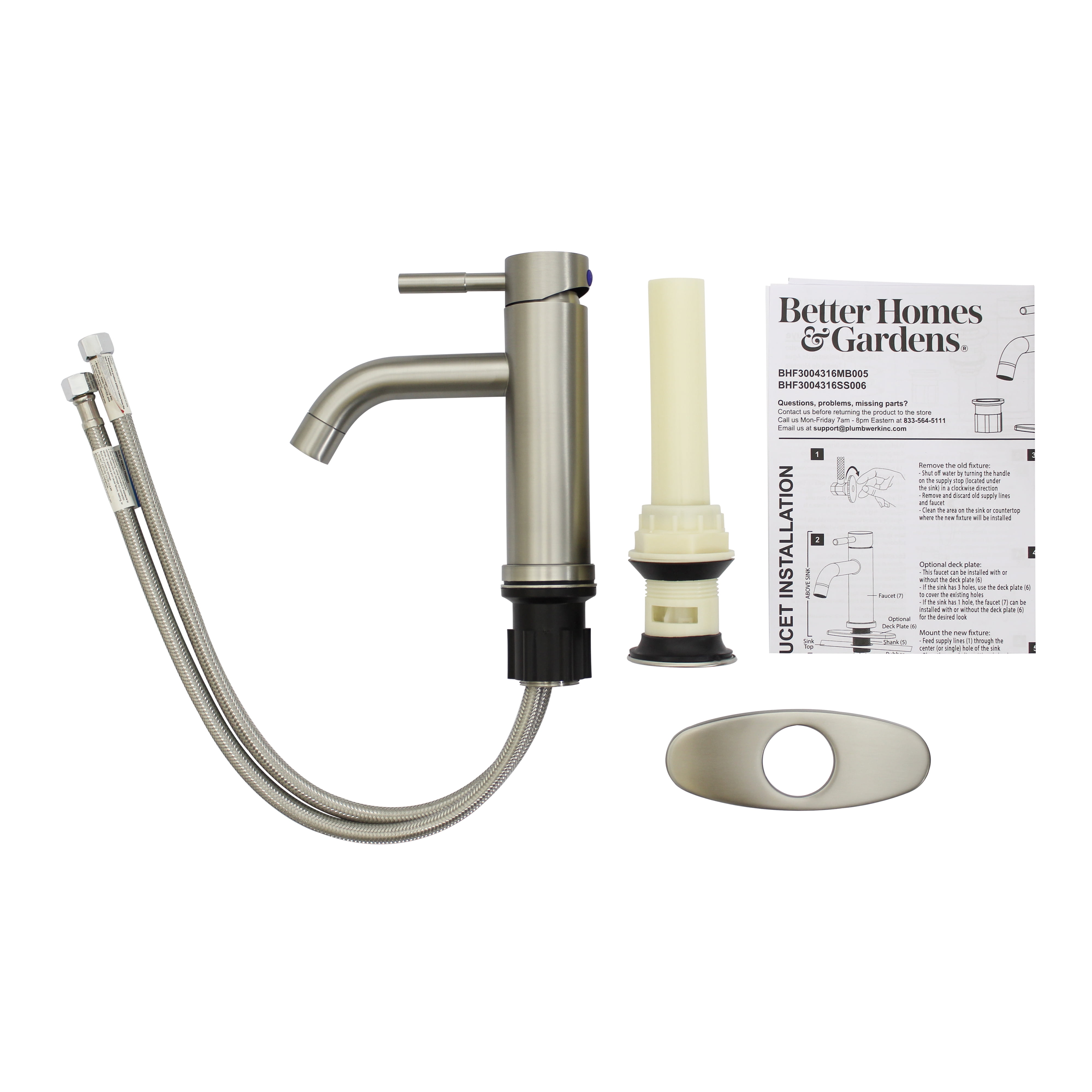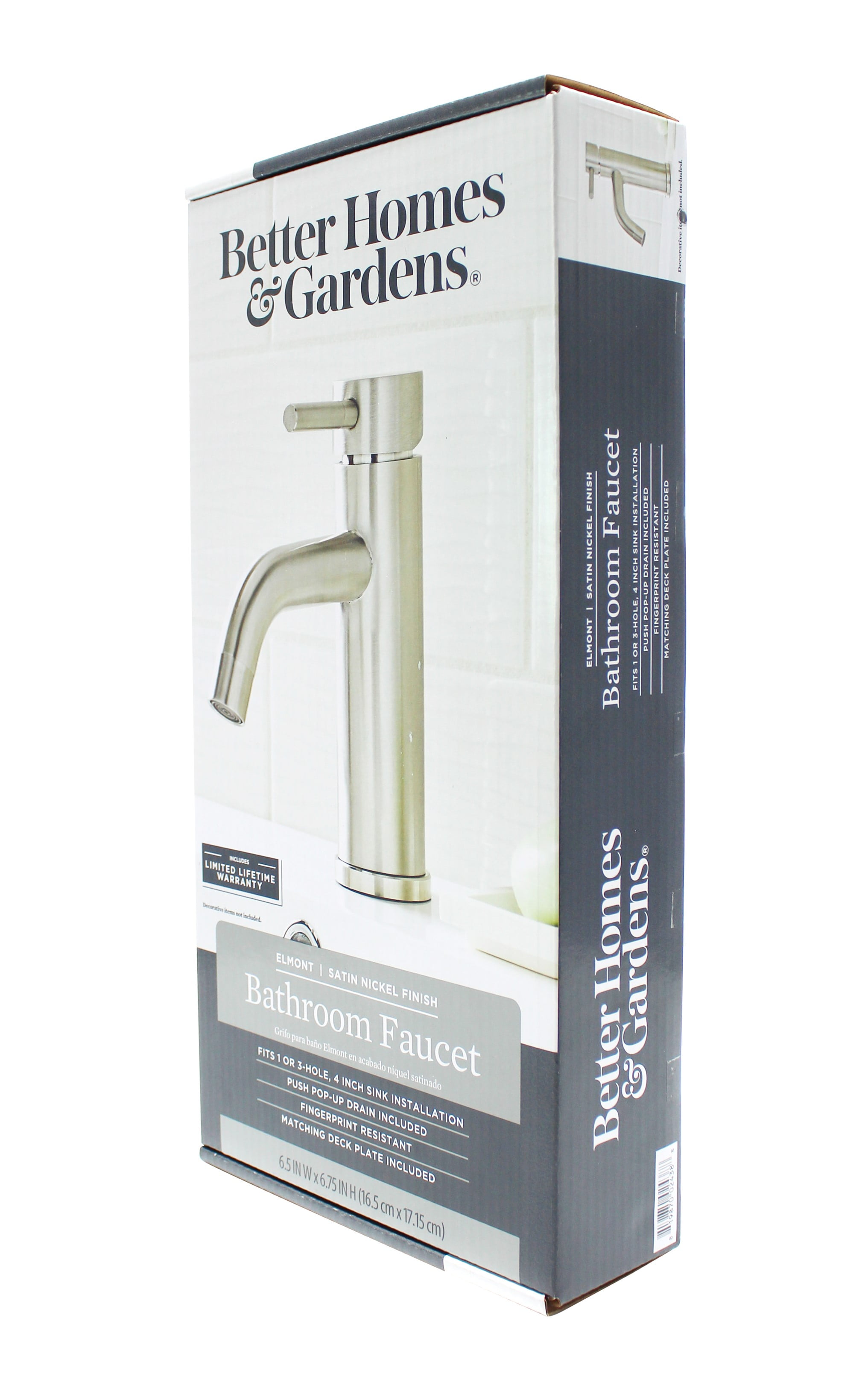 This Better Homes & Gardens Elmont Single Handle Bathroom Faucet in Satin Nickel finish is a stylish addition to your bathroom. The included optional deck plate allows for installation in 1 hole or 3 hole sink configurations with the optional deck plate. This single handle design allows for easy one hand operation of flow control and temperature. The included Push Pop-up in matching finish allows for easy installation and clean lines as no lift rod assembly is required. This faucet is Watersense Certified and covered by a Limited Lifetime Warranty. Clean periodically, but avoid use of abrasives cleaners, steel wool, or harsh chemicals.
