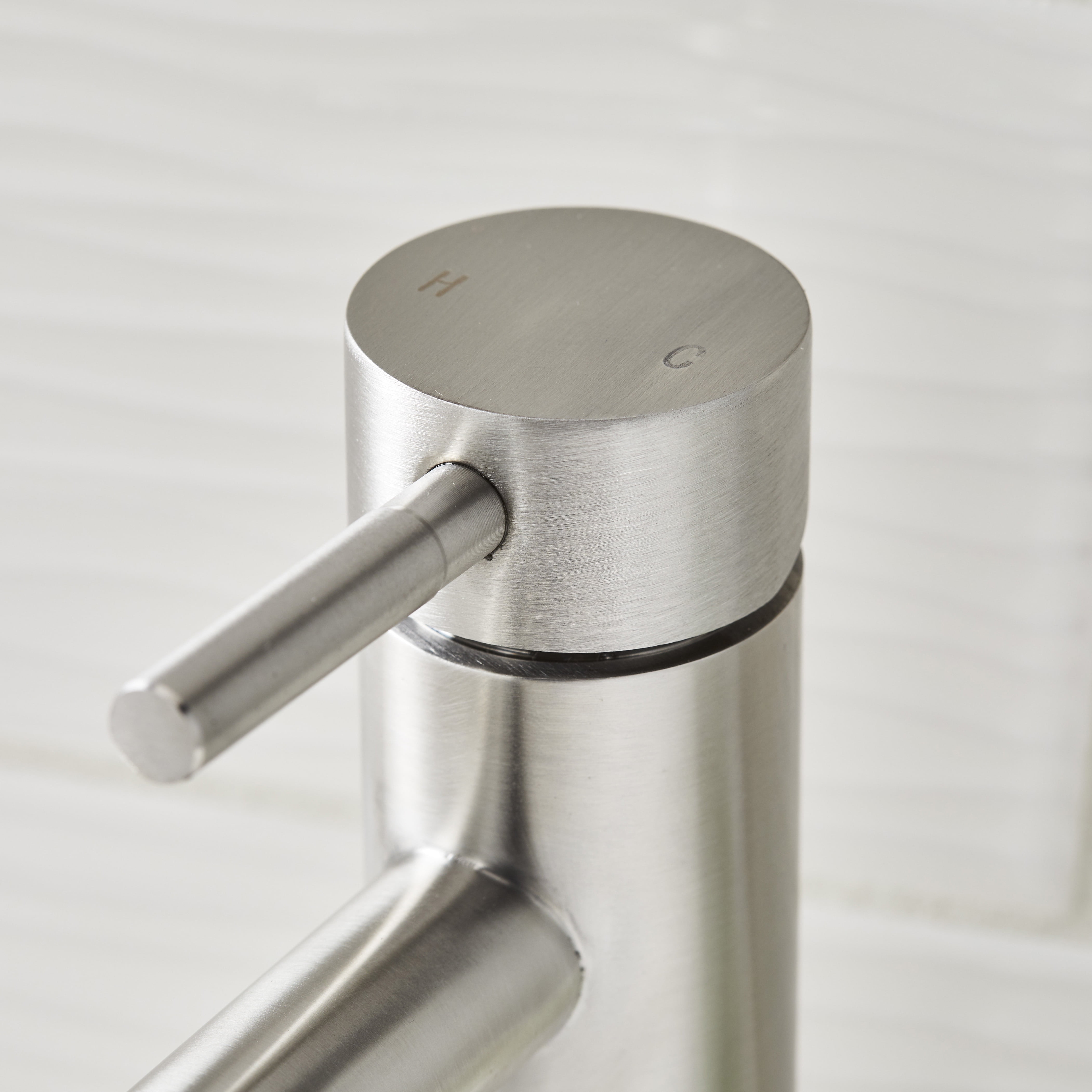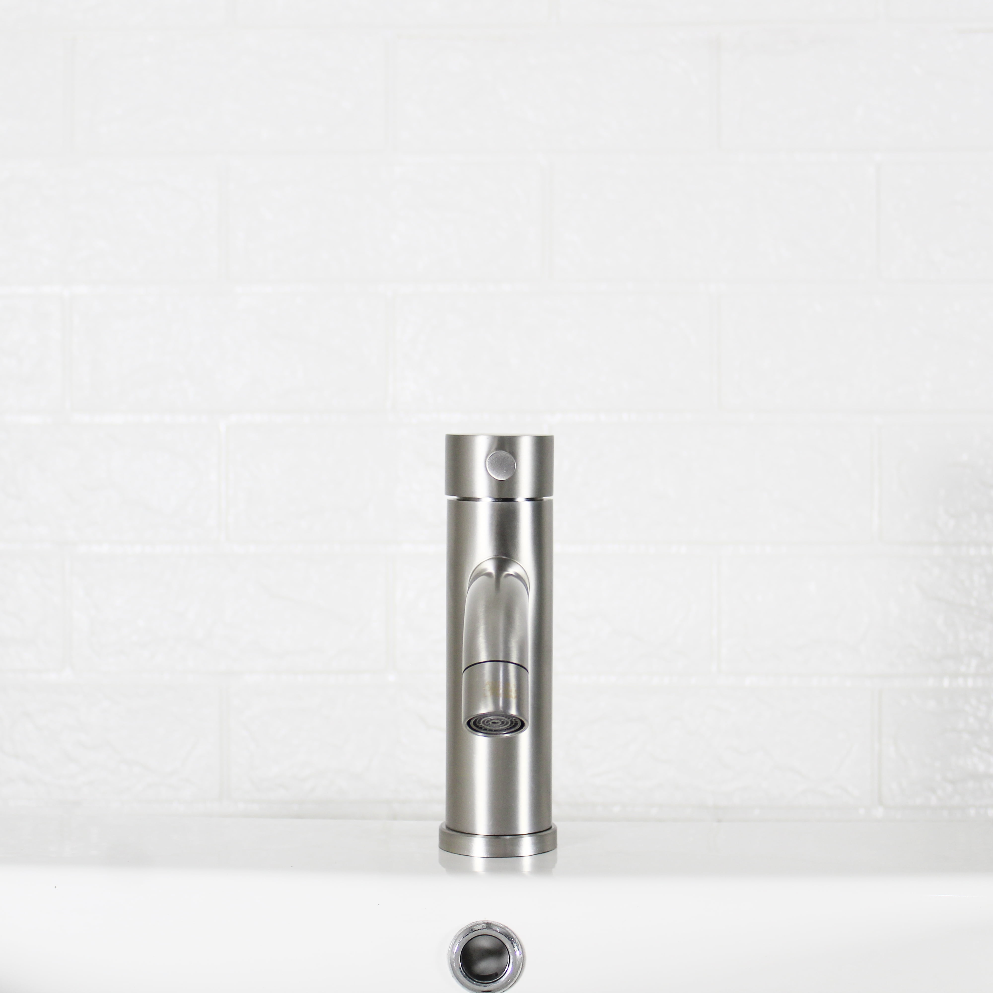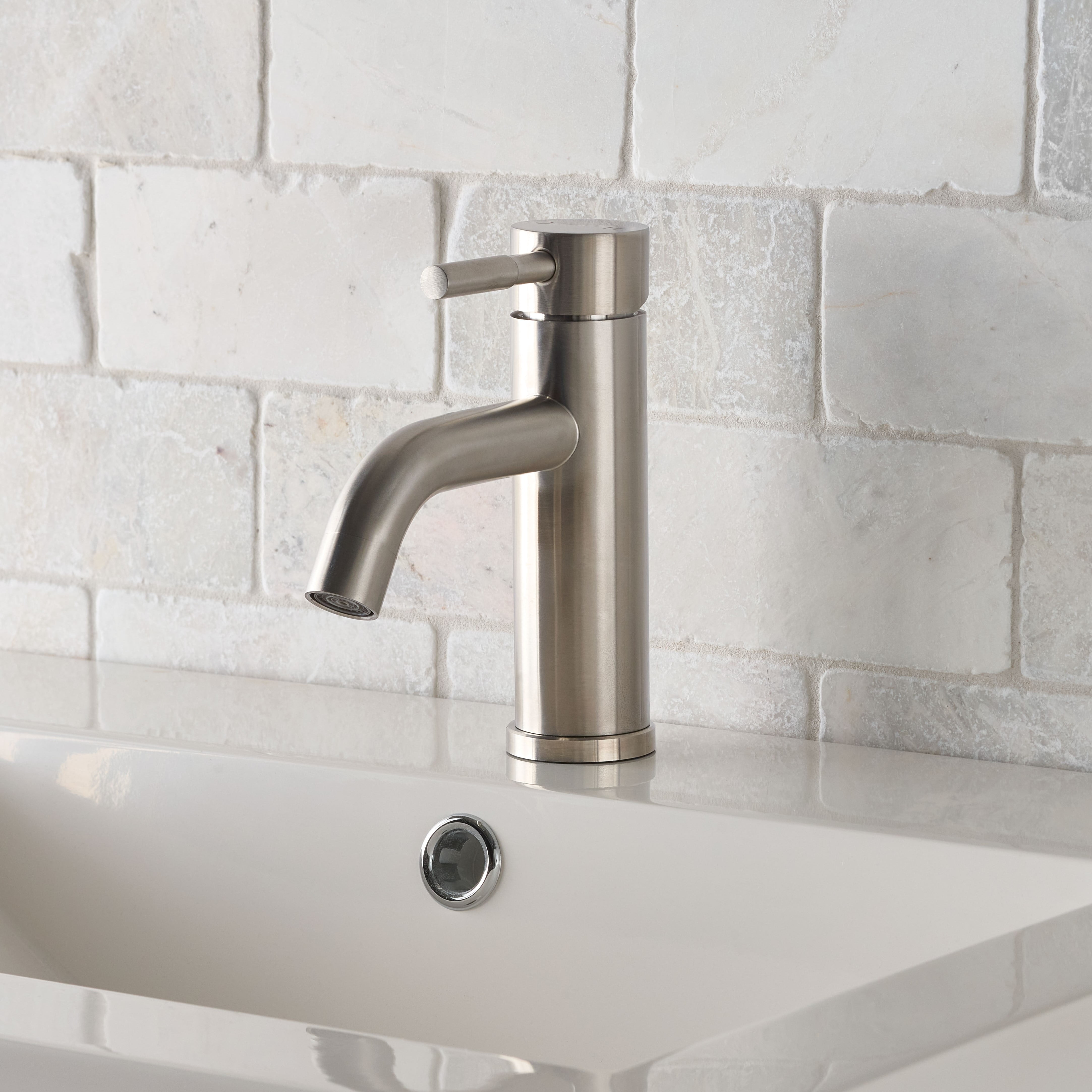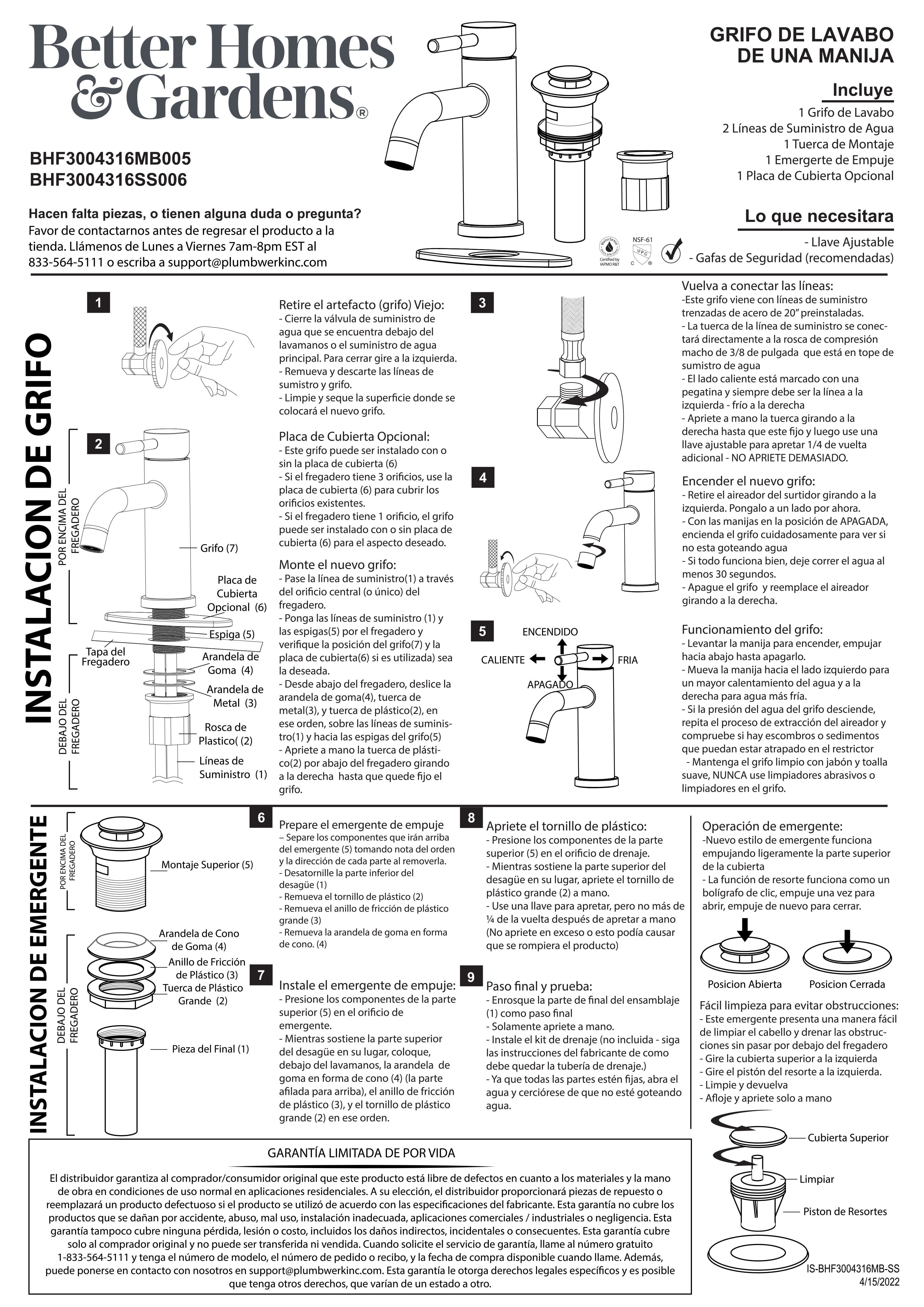 This Better Homes & Gardens Elmont Single Handle Bathroom Faucet in Satin Nickel finish is a stylish addition to your bathroom. The included optional deck plate allows for installation in 1 hole or 3 hole sink configurations with the optional deck plate. This single handle design allows for easy one hand operation of flow control and temperature. The included Push Pop-up in matching finish allows for easy installation and clean lines as no lift rod assembly is required. This faucet is Watersense Certified and covered by a Limited Lifetime Warranty. Clean periodically, but avoid use of abrasives cleaners, steel wool, or harsh chemicals.