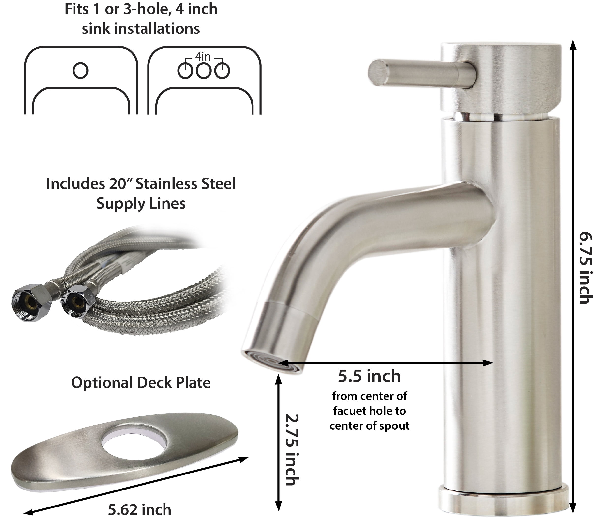Handles: Single Handle Lever Lead Free Compliant: Yes Stainless Steel Supply Lines Included 3/8″ Female Compression Faucet Connection Optional Deck Plate Push pop-up drain for easy install assembly Meets California low-lead AB1953 requirements, High Quality Ceramic Cartridges for Durability and Reliability cUPC certification, Holes for Installation:1 or 3 hole 4-inch on center installation Flow Rate (GPM): 1.20 Complies with ASME A112.18.1-2012/CSA B125.1-12 Cartridge Type: Ceramic Cartridge Watersense: Yes Complies with NSF