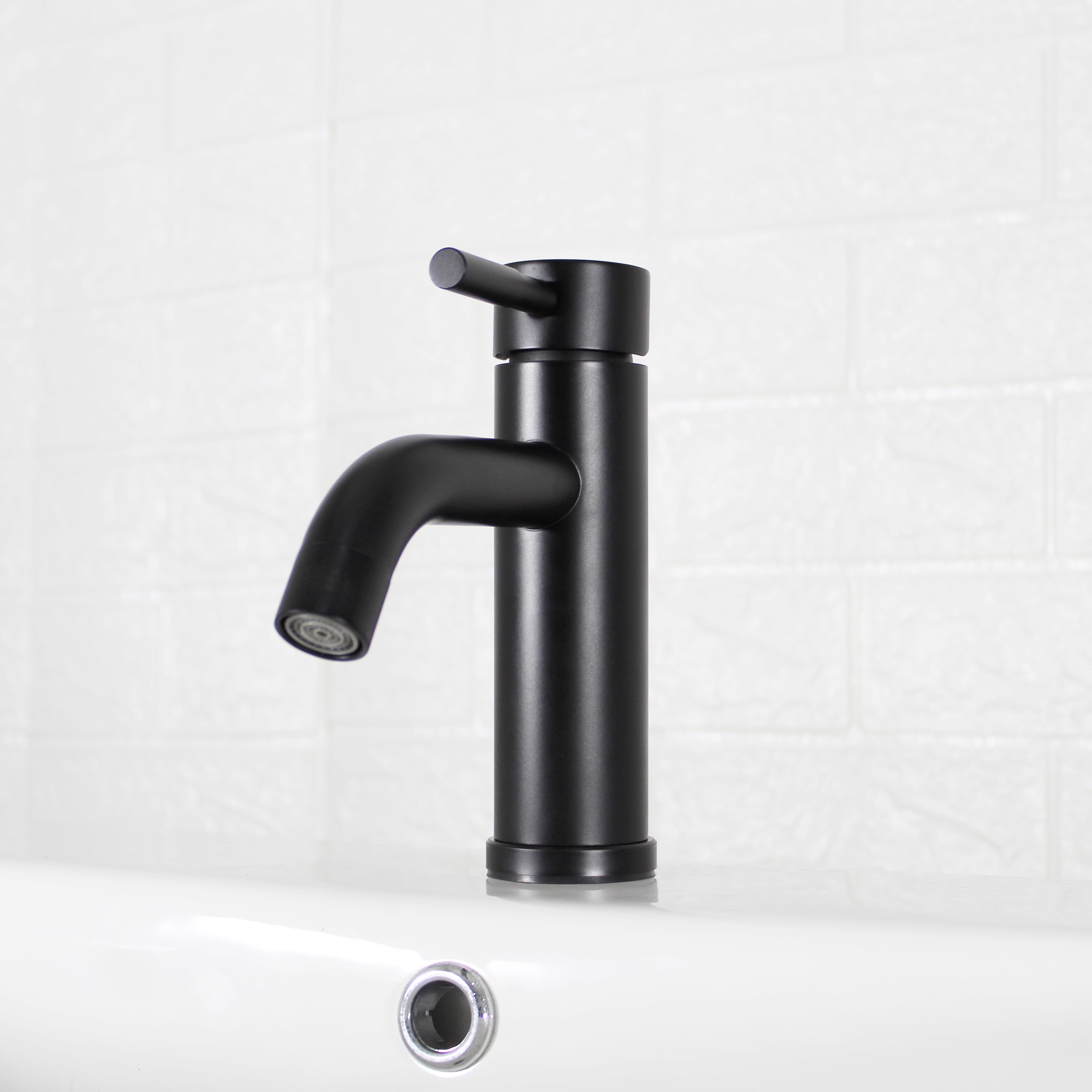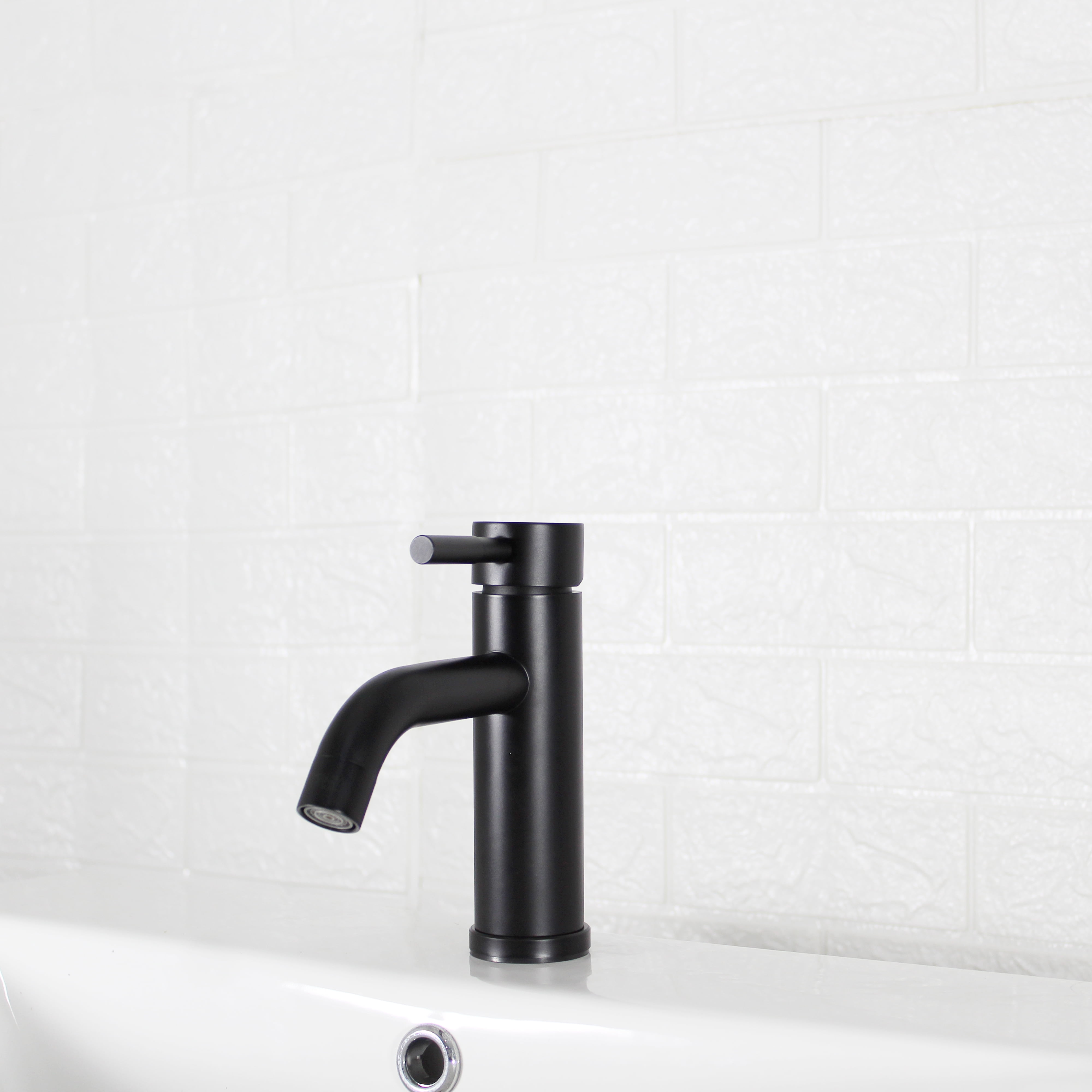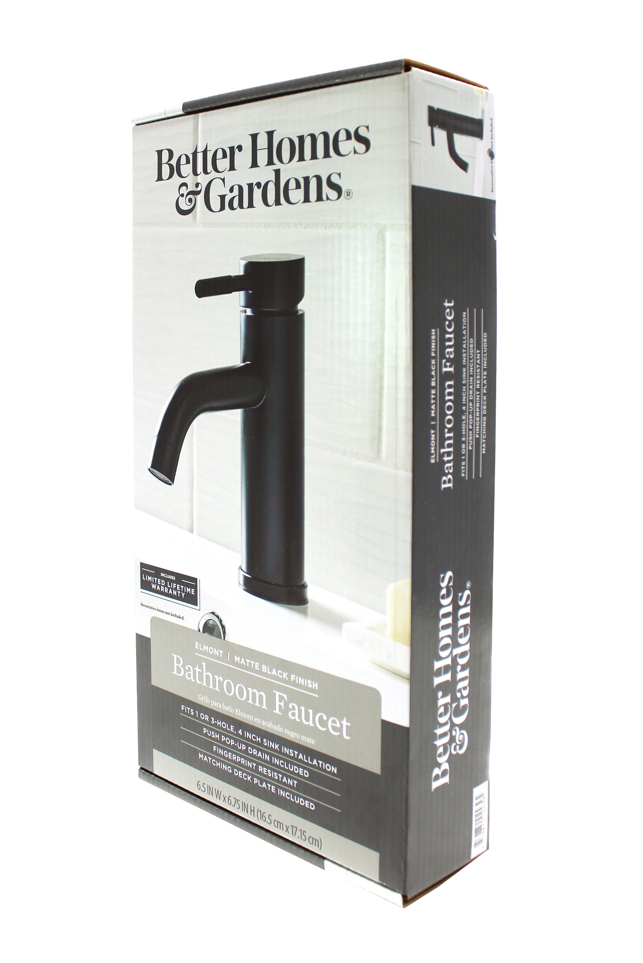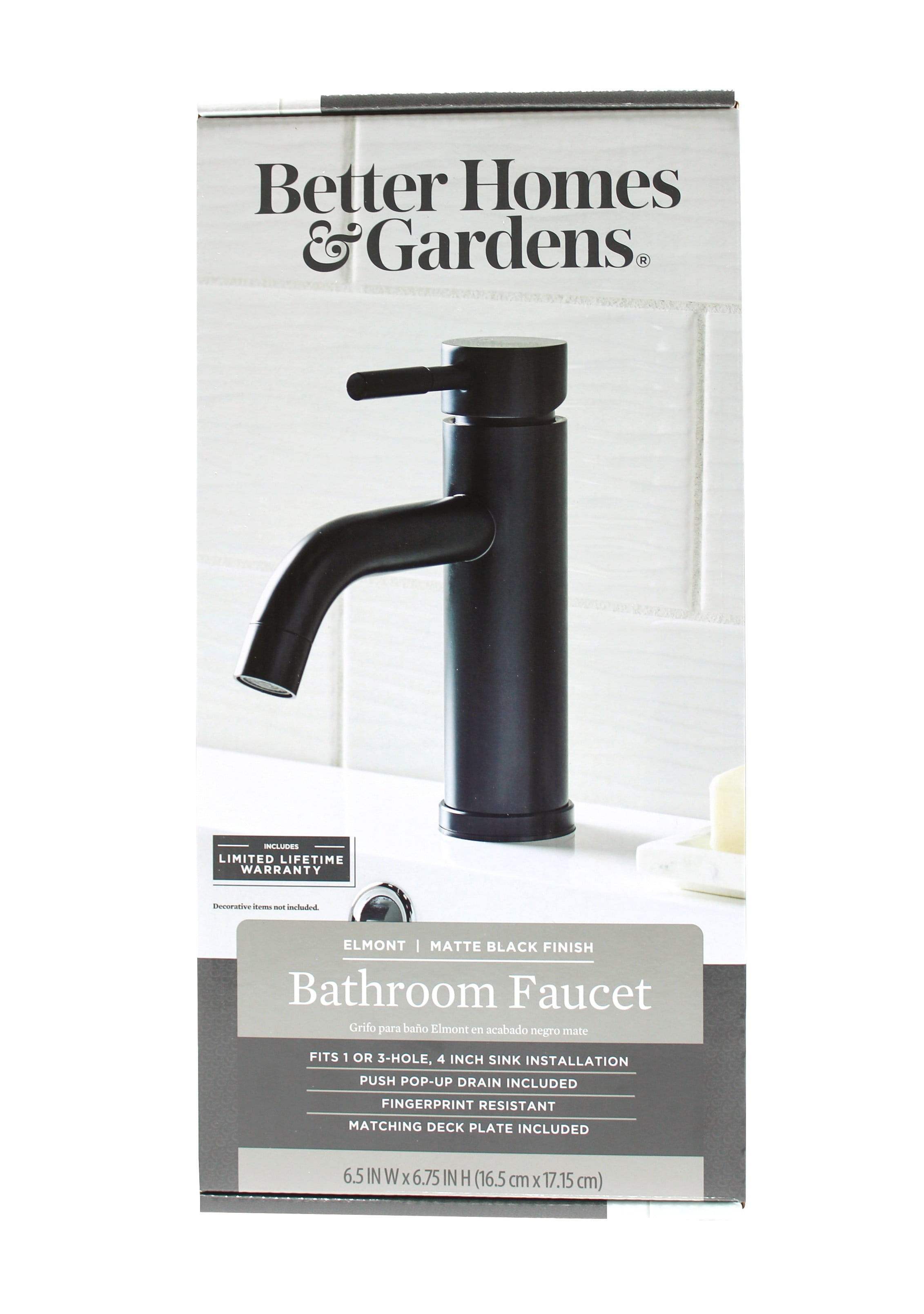 This Better Homes & Gardens Elmont Single Handle Bathroom Faucet in Matte Black finish is a stylish addition to your bathroom. The included optional deck plate allows for installation in 1 hole or 3 hole sink configurations with the optional deck plate. This single handle design allows for easy one hand operation of flow control and temperature. The included Push Pop-up in matching finish allows for easy installation and clean lines as no lift rod assembly is required. This faucet is Watersense Certified and covered by a Limited Lifetime Warranty. Clean periodically, but avoid use of abrasives cleaners, steel wool, or harsh chemicals.
