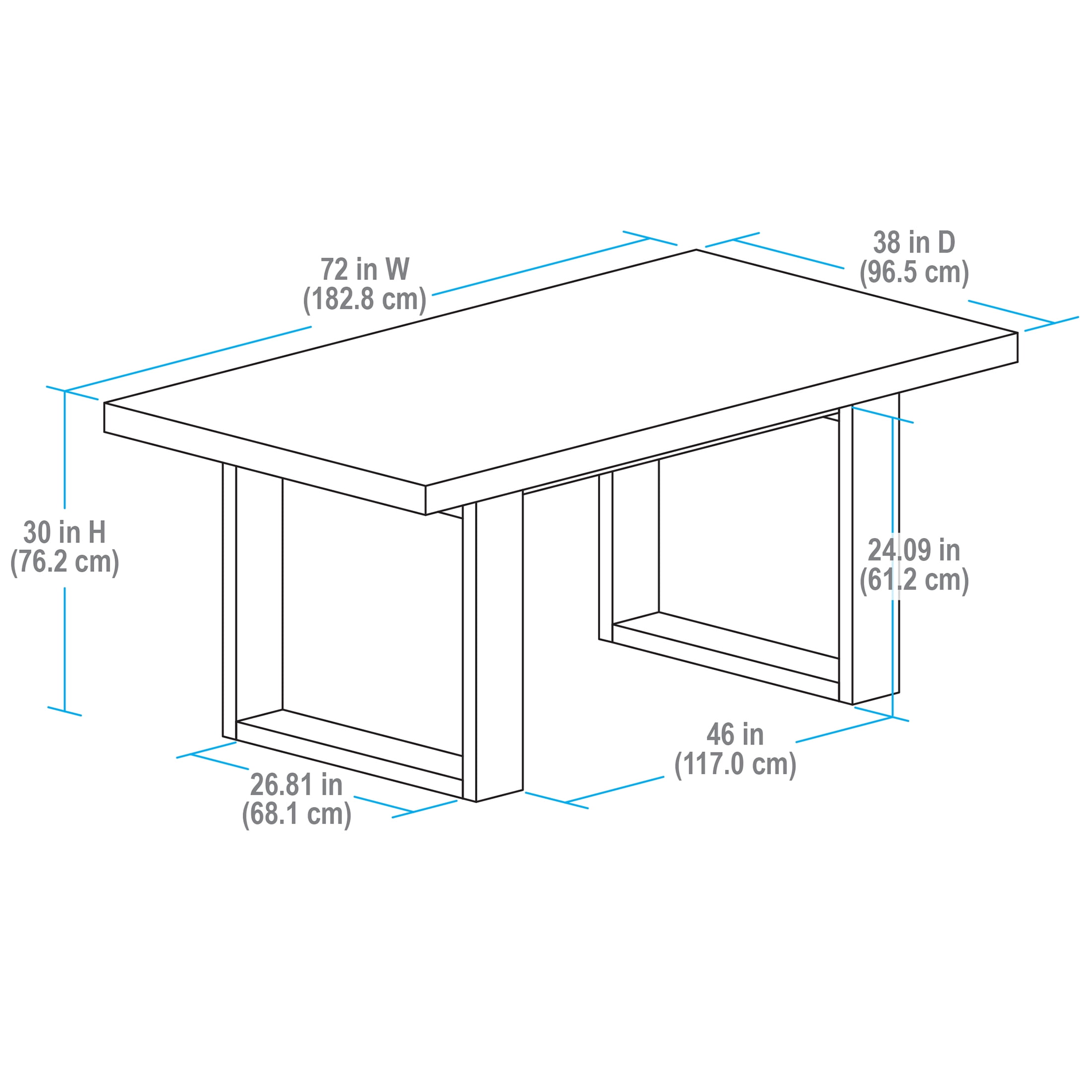 Better Homes & Gardens Ezra 72in Rect Dining Table The simple, sleek design of this table fits well with most any decor, from modern or contemporary to traditional or minimalist. Sturdy construction features trunky legs with double pedestal and a support cross bar connecting them underneath table. Can be used in the dining room, kitchen, or as a creative alternative to your home office desk. Coordinates with other furniture in the BHG Dining Chair collection Easy assembly. Dimensions: 72W x 38D x 30H inch (182.8×96.5×76.2cm) approx. Model # BH2402125171015(4894165028209) Walnut Matching BHG Dining Chairs: