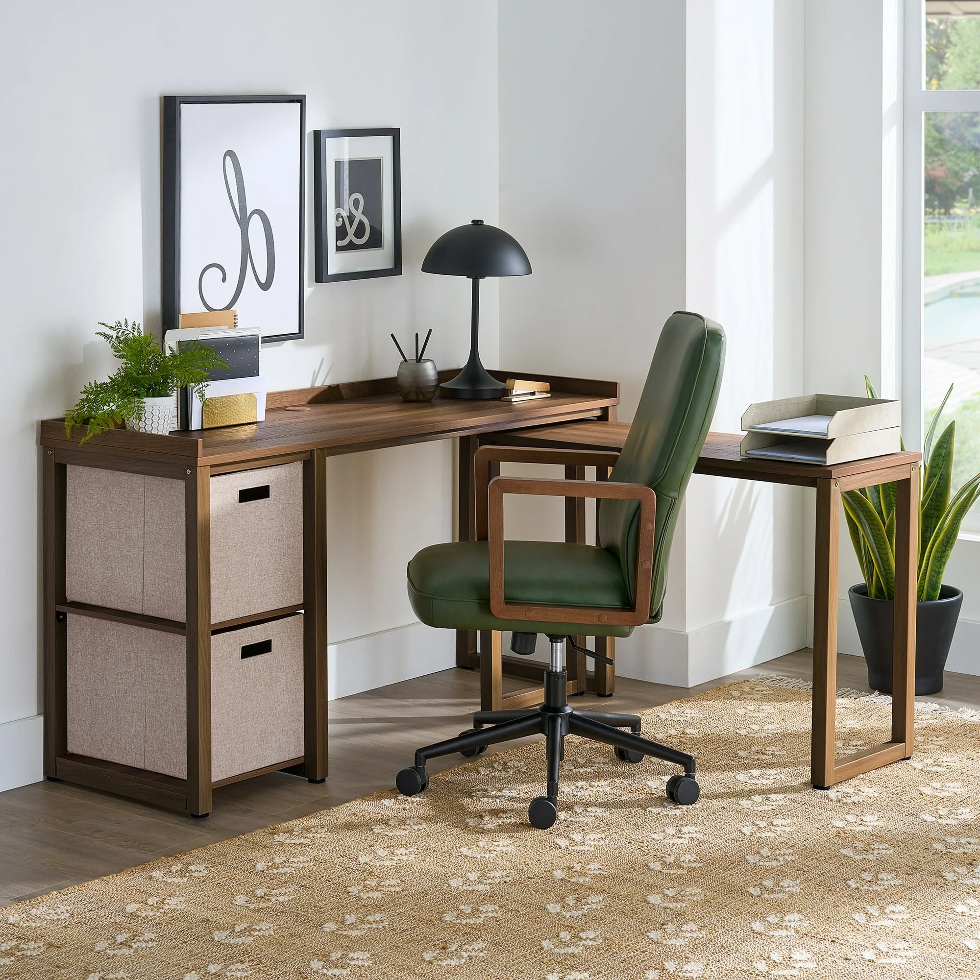 The Better Homes & Gardens Modular 2-Cube L-Desk is designed to elevate your productivity by meeting all your workspace needs with style and functionality. This set includes a spacious 60″ desk with two cube-style shelves and a smaller 40″ desk. The desks can be used together to create an L-shaped or corner workstation, or separately in a variety of rooms. The reversible design allows the desk shelves to be assembled on either the left or right side to suit your preference. The smaller 40″ desk can stored underneath the larger one when not in use. This space-saving design makes it perfect for compact living and work areas. Ideal for adults and teens alike, transform your home office or study space into a productive and organized haven with this versatile desk set.