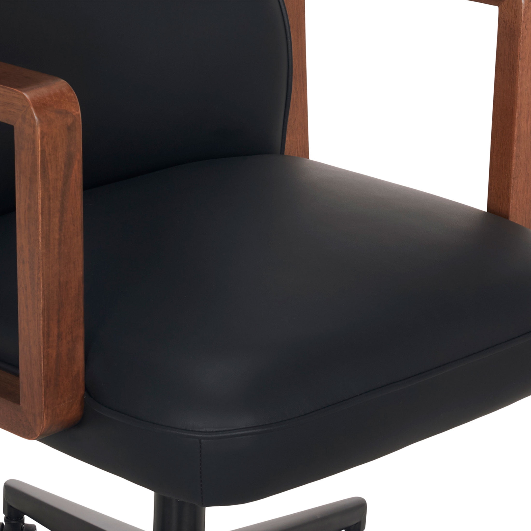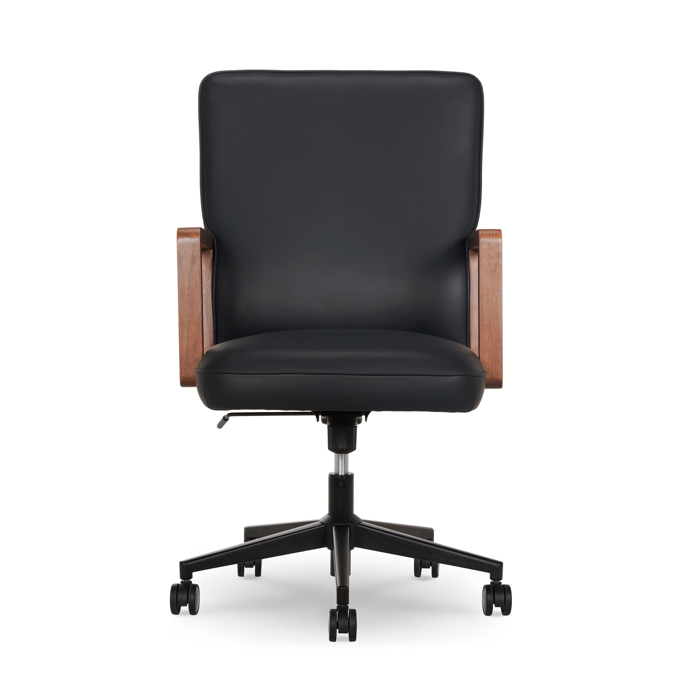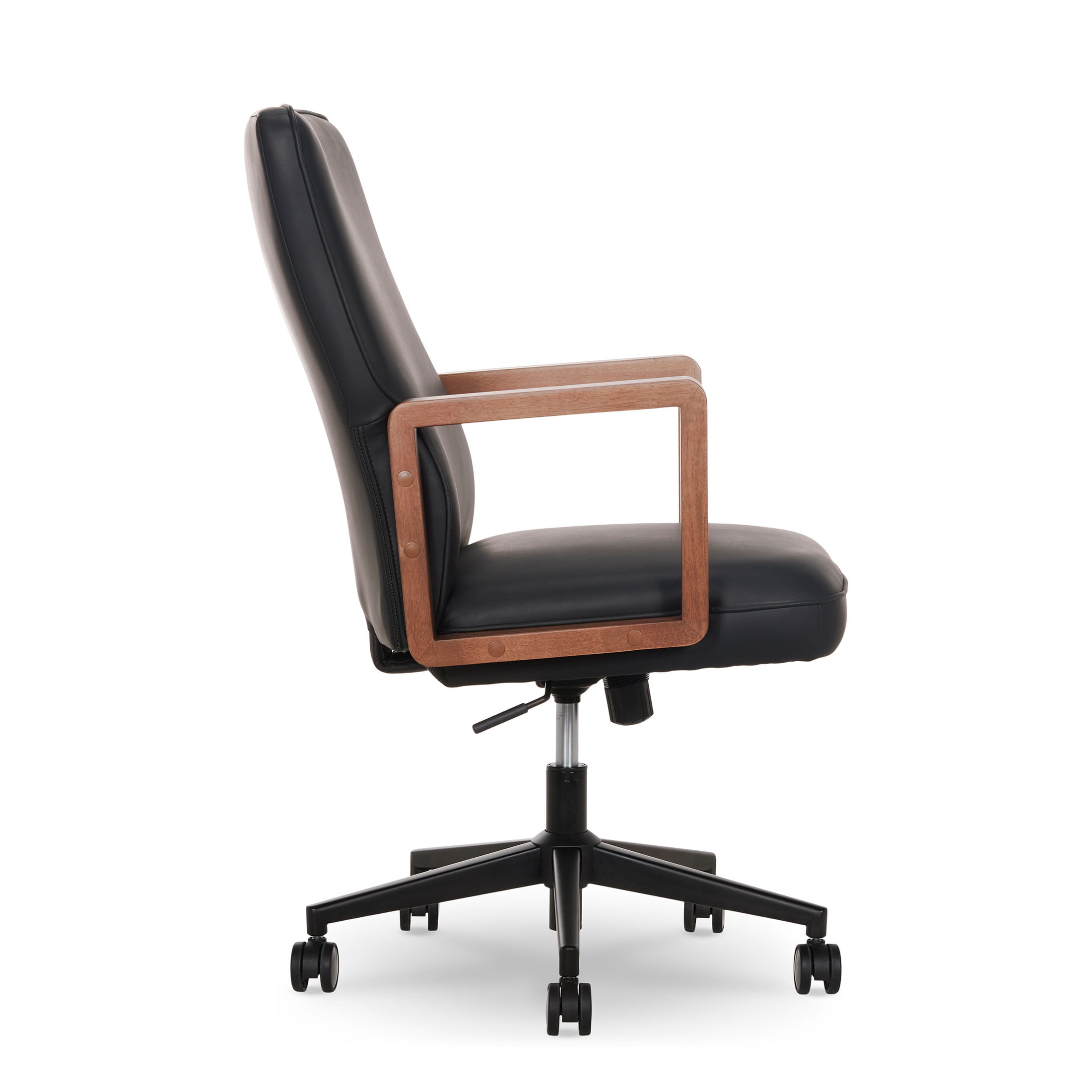 Vegan leather seating surfaces combine elegance and durability for a naturally elevated look Authentic wood grain armrests provide upper body support Ergonomically-curved backrest promotes good posture Adjustable seat height with gas lift and control lever Recline mechanism with adjustable tilt tension and tilt lockout 360° dual-wheel casters and smooth-swivel seat for effortless mobility Durable metal base provides reliable support Available in Black, Olive or Chestnut Easy assembly with no additional tools required Product Dimensions: 24.5 in W x 28 in D x 38.5 – 42.25 in H (62.2 cm x 71.1 cm x 97.8 – 107.3 cm) Packaging Dimensions: 29 in x 14.25 in 24.75 in Model# BH25000052549BL, BH25000052549OL, BH25000052549CH