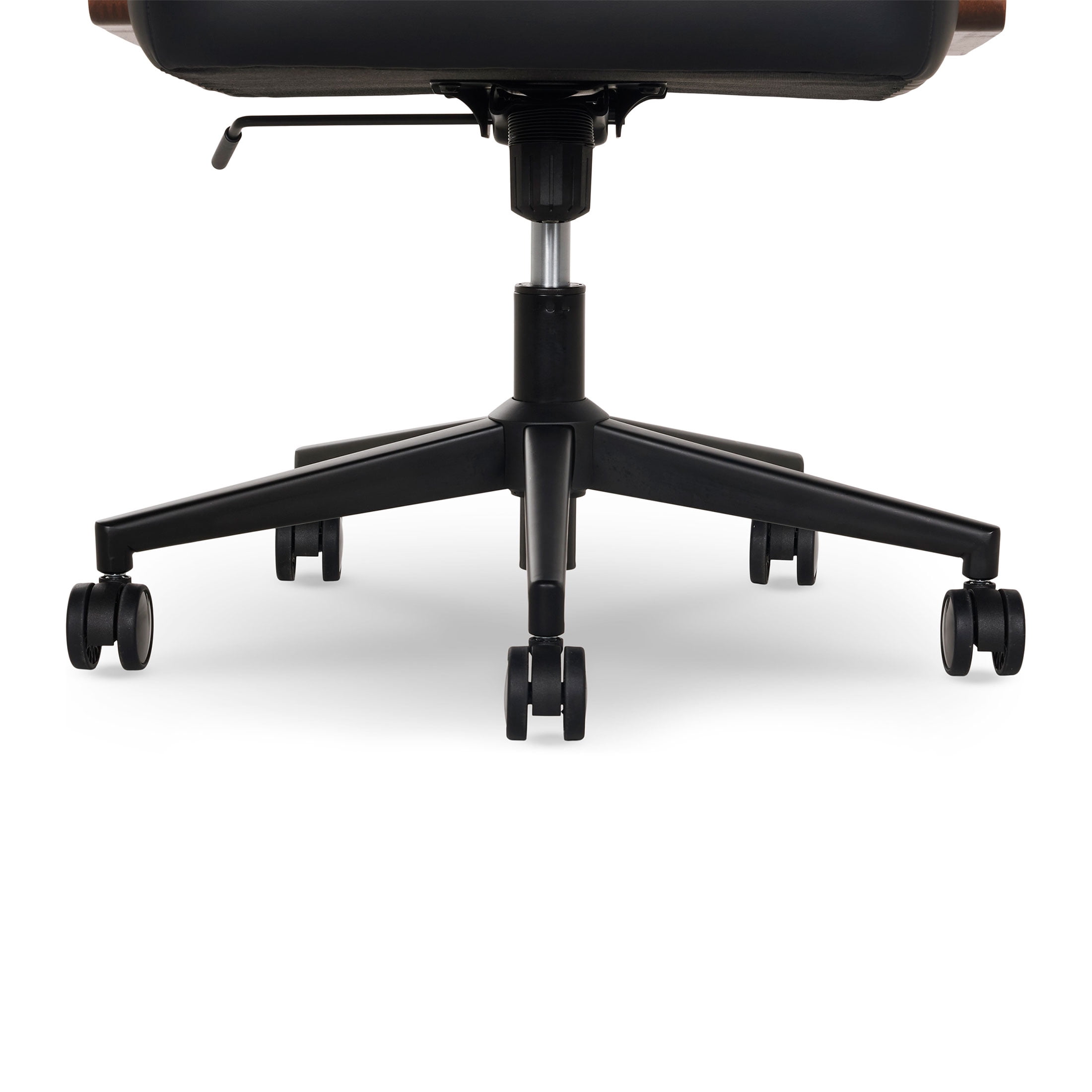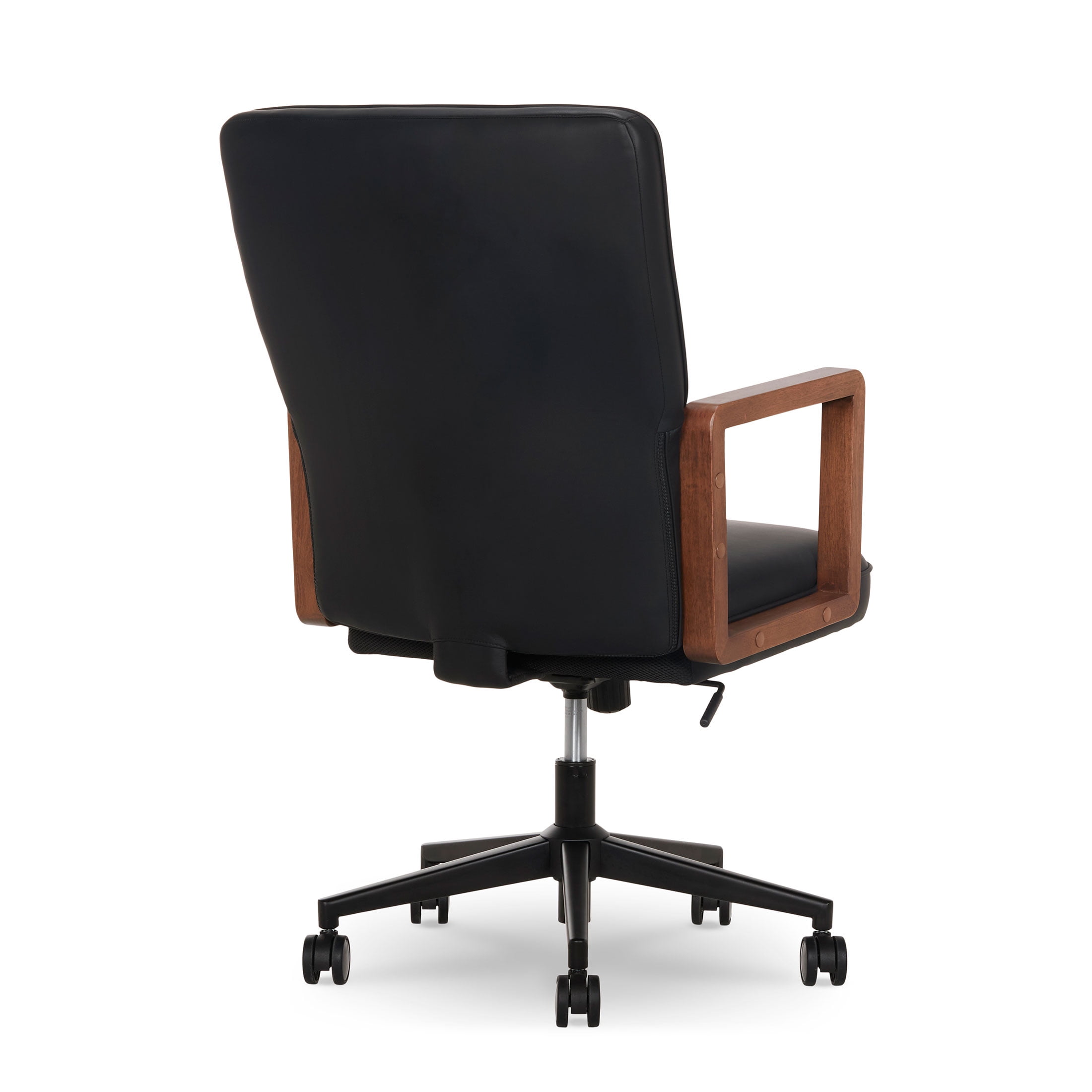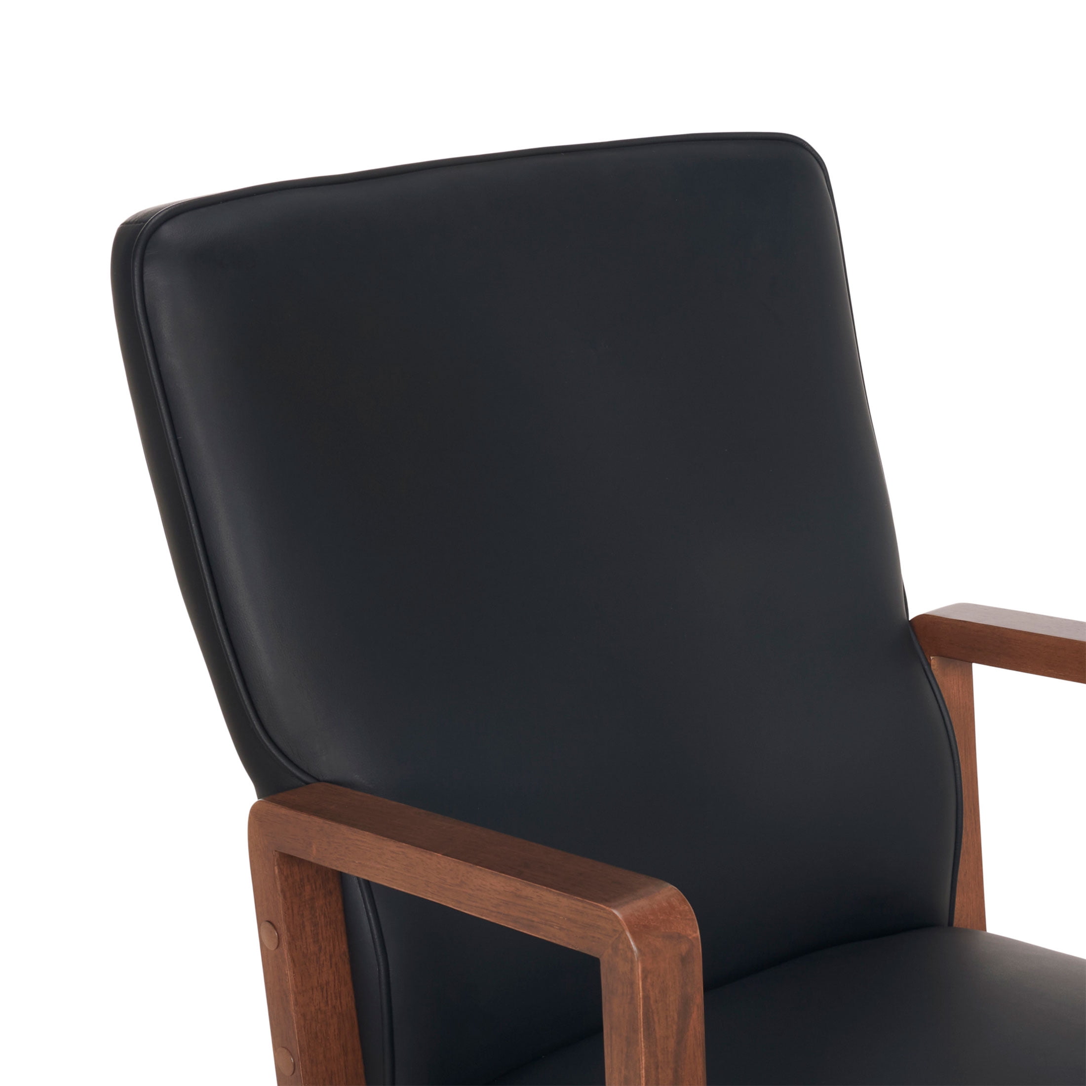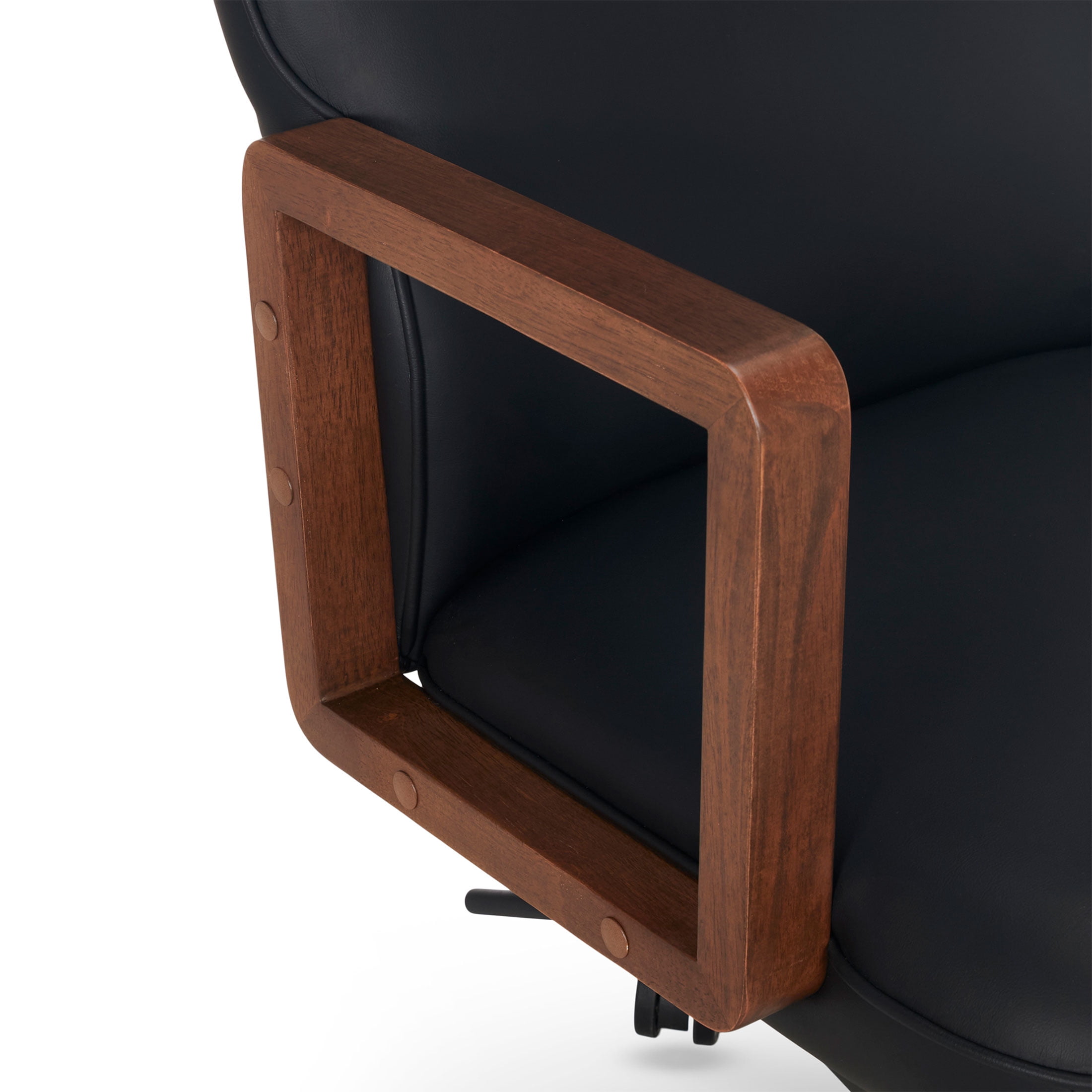 Vegan leather seating surfaces combine elegance and durability for a naturally elevated look Authentic wood grain armrests provide upper body support Ergonomically-curved backrest promotes good posture Adjustable seat height with gas lift and control lever Recline mechanism with adjustable tilt tension and tilt lockout 360° dual-wheel casters and smooth-swivel seat for effortless mobility Durable metal base provides reliable support Available in Black, Olive or Chestnut Easy assembly with no additional tools required Product Dimensions: 24.5 in W x 28 in D x 38.5 – 42.25 in H (62.2 cm x 71.1 cm x 97.8 – 107.3 cm) Packaging Dimensions: 29 in x 14.25 in 24.75 in Model# BH25000052549BL, BH25000052549OL, BH25000052549CH