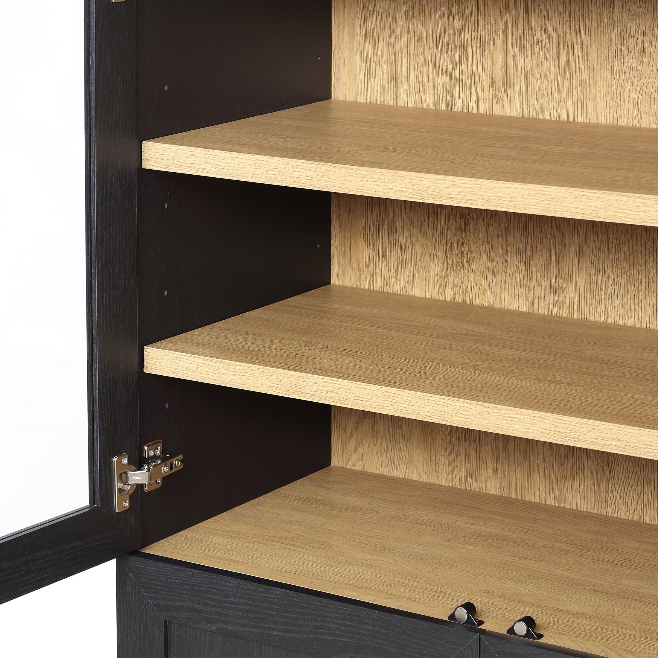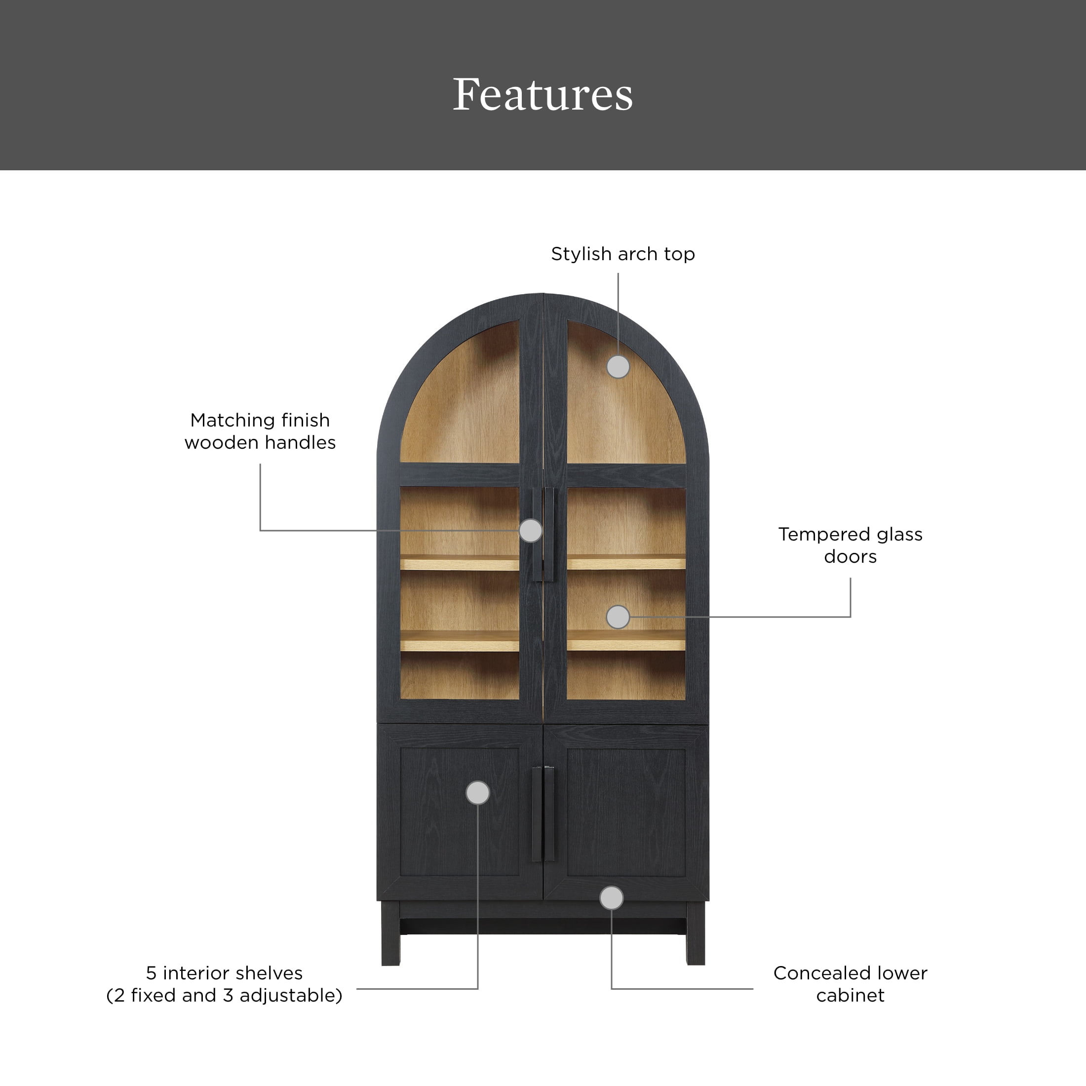 Spacious cabinet for storage and display 2 Tempered glass doors, 2 solid doors for concealed storage Sturdy wood construction 5 interior shelves (2 fixed and 3 adjustable) Soft-closing, euro-style cabinet door hinges Anti-tipping hardware included Available in multiple finishes: Light honey and Black Assembly required Product Dimensions: 36 in W x 16.375 in D x 72.25 in H (91.4 cm x 41.6 cm x 183.5 cm) Box 1 Dimensions: 70.25 in x 22 in x 6.75 in Box 2 Dimensions: 40 in x 20 in x 7.75 in Product Weight: 87.2 lb (37.5 kg) Box 1 Weight: 94.8 lb (43 kg) Box 2 Weight: 54 lb (24.5 kg) Model# BHF336158813032, BHF336158813033
