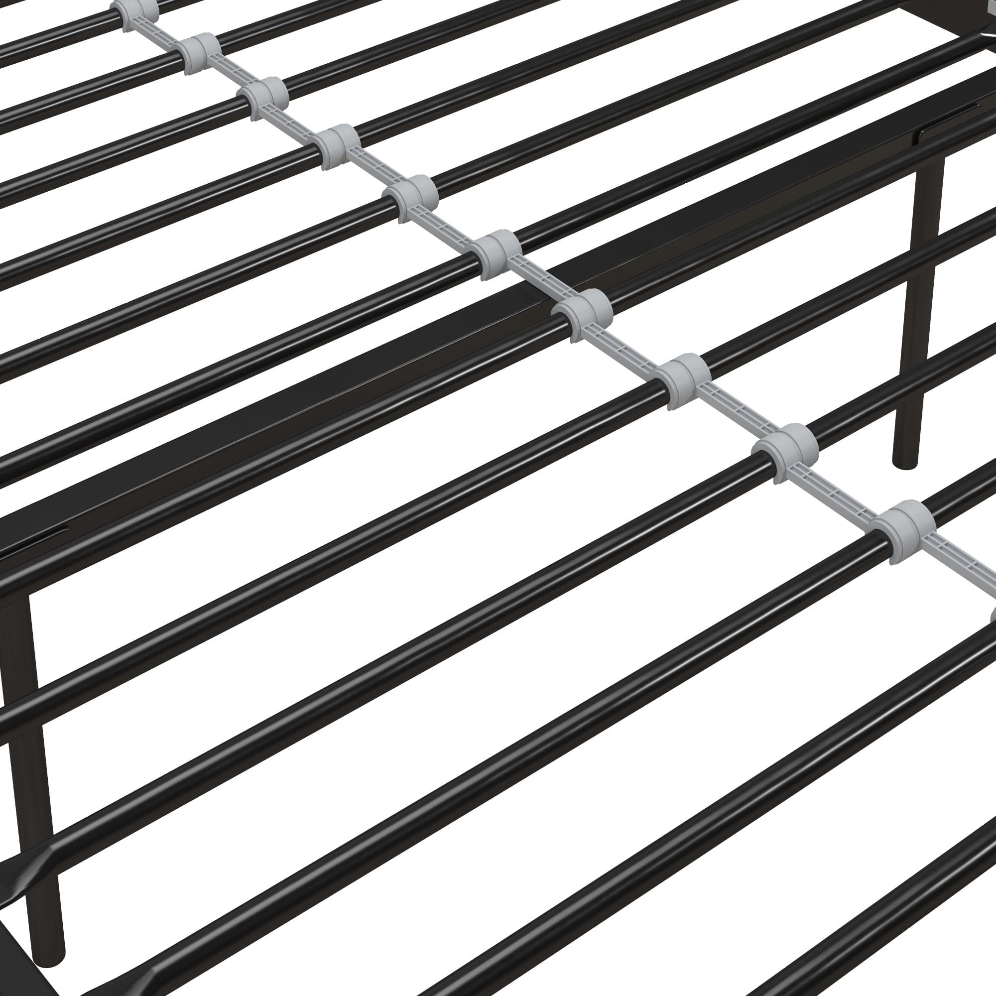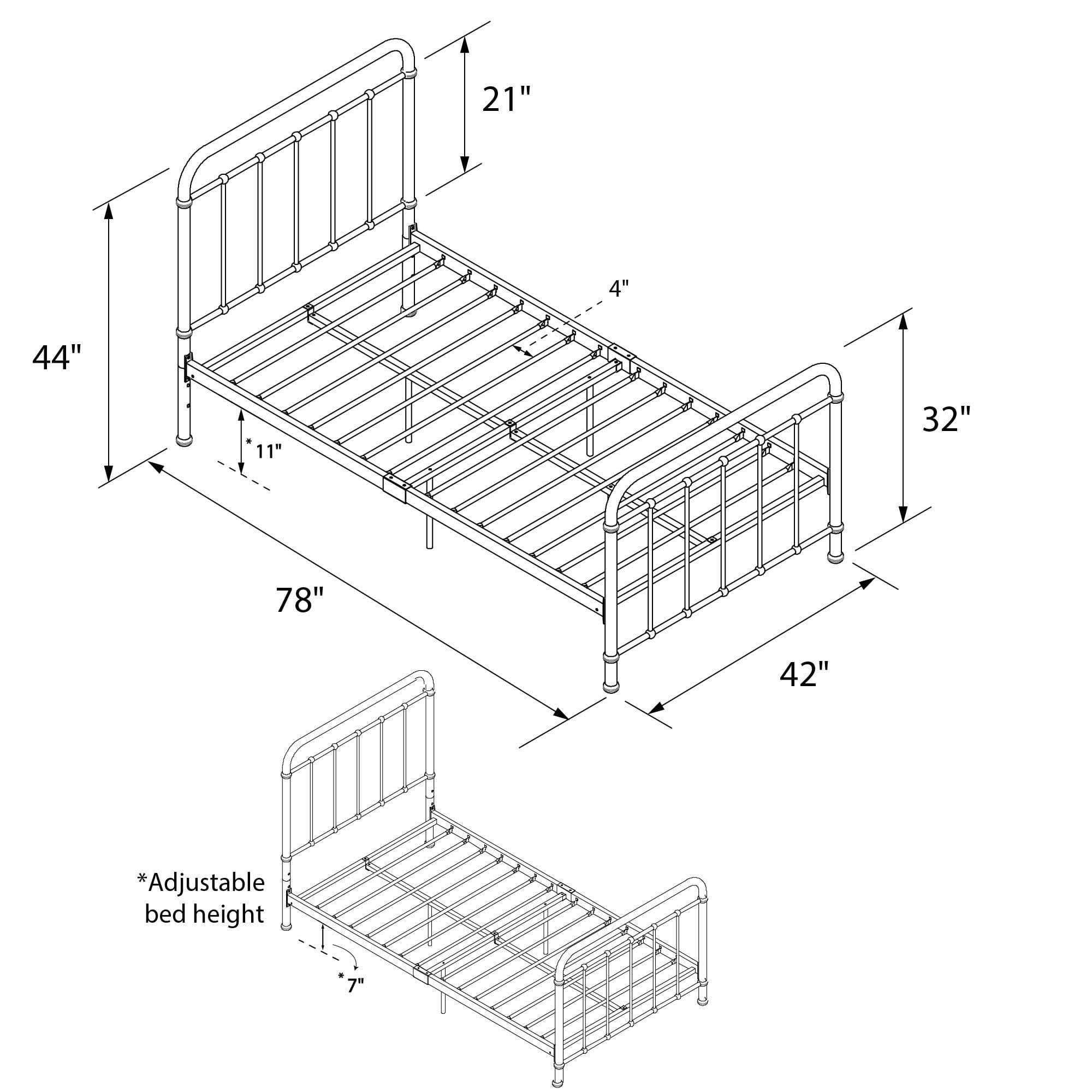 Sturdy metal frame. Headboard and footboard feature decorative accents Includes metal side rails for guaranteed stability and durability and a center metal rail for added support 2 base height options for convenience: 7″ or 11″ clearance. Includes metal slats to provide support and comfort and does not require foundation. Product Dimensions: 78″L x 42″W x 44″H. Weight limit: 250 lb. Available in white, black and rose gold. Ships in one box and assembles easily. Shipping dimensions: 45″L x 43″W x 4″H. Product weight: 37.5 lb. Shipping weight: 48 lb.