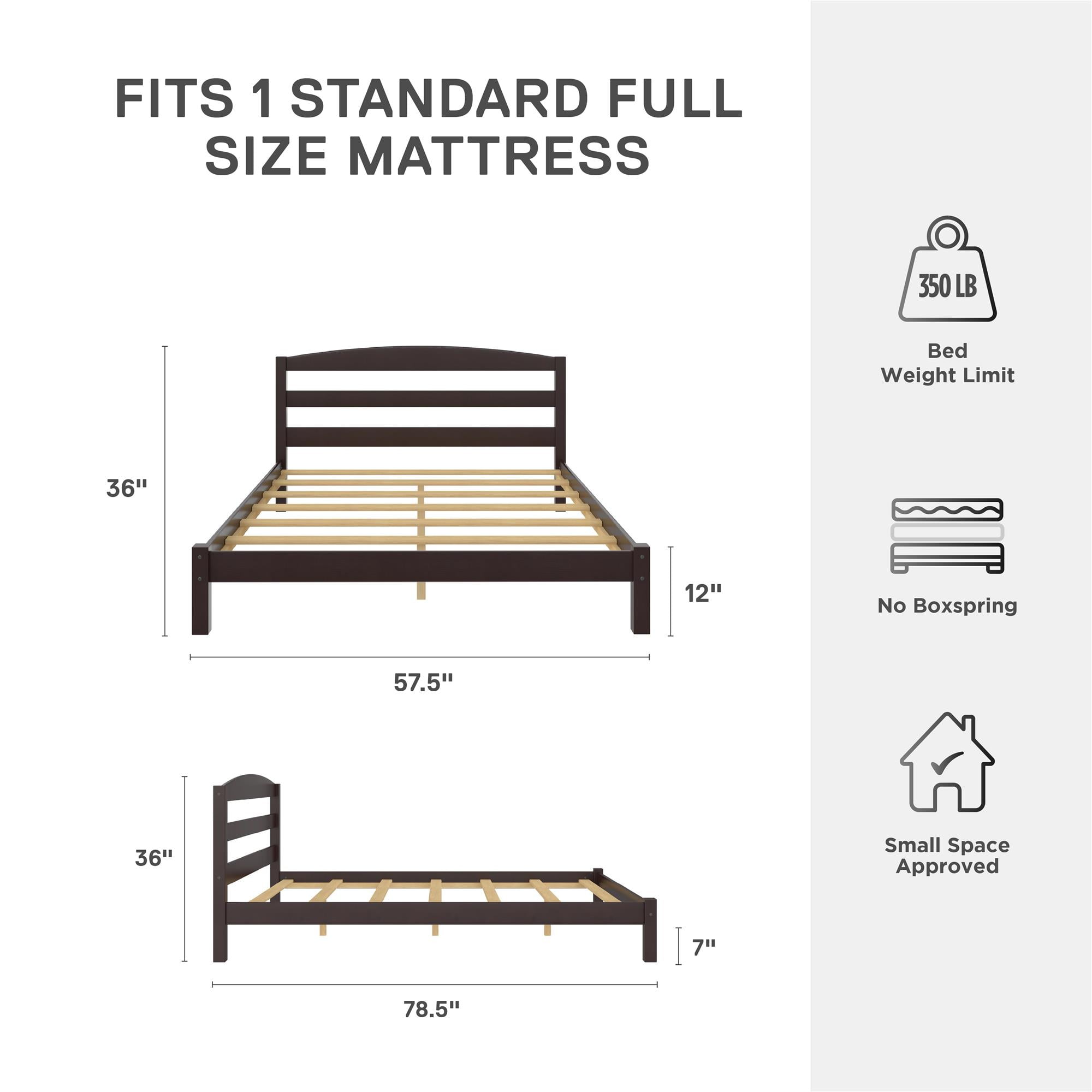STURDY SLEEP SOLUTION: Revel in the handsomely stained finish and beautiful low-profile simplicity of our full-size solid wood platform bed frame that is made from 100% pine and features a slightly curved open panel headboard and square block legs CONTEMPORARY MODE: Designed for kids, teens, and adults, our bedroom and guest room worthy classic low height platform bed embraces comfortable design without the unnecessary frills to remain a lasting modern staple that will never go out of style BRAWNY BUILD: The durable bed frame provides a stable backdrop for rest with the inclusion of strong wooden slats, side rails, and center legs which support your recommended spring mattress (not included) without needing a box spring or foundation SIMPLE ASSEMBLY: All parts, tools, and easy-to-follow instructions are included in box. Get answers to all your questions from our helpful customer support team 7 days a week by phone, email, or chat and easily order any replacement parts if needed SPACE SAVING CHOICE: Ideally sized for apartment and condo living. Full size platform bed frame dimensions: 57.5″W x 78.5″D x 36″H. Weight limit: 330 lbs. Net weight: 51.5 lbs. Enjoy a 1-year limited warranty against manufacturer defects