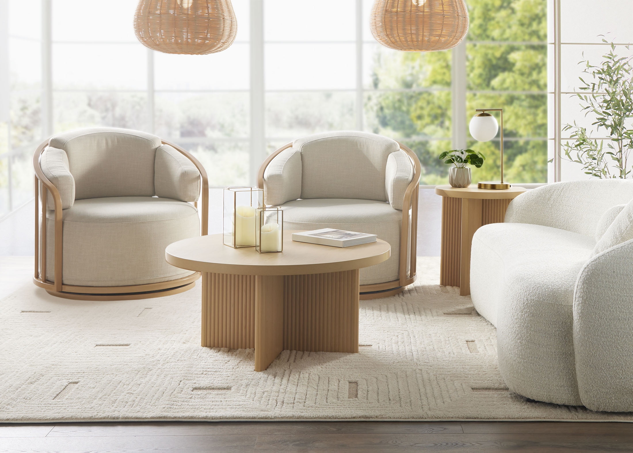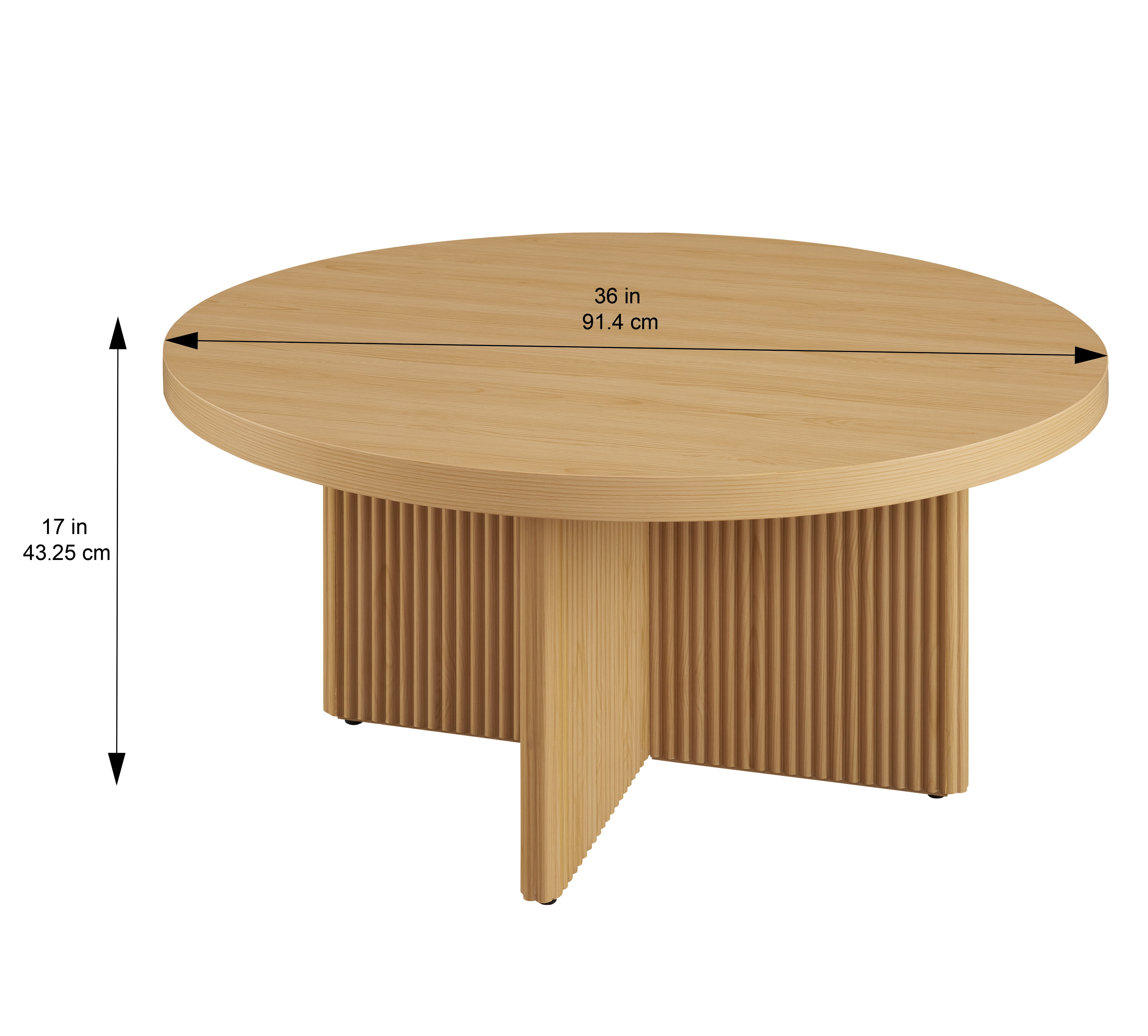 This unique fluted coffee table fit into a modern stylish lifestyle and serve as a luxurious centerpiece for your living or sitting room. Mesmerizing rounded surface provides all the space you will need for all your comforts. Durable top is easy to maintain and keep clean. The fluted legs are a conversational feature with its unique styling and is sturdy to hold all of your conventional needs. Assembled Dimensions: ’36” Dia x ’17” H. Check out other Better Homes and Gardens matching fluted collection.