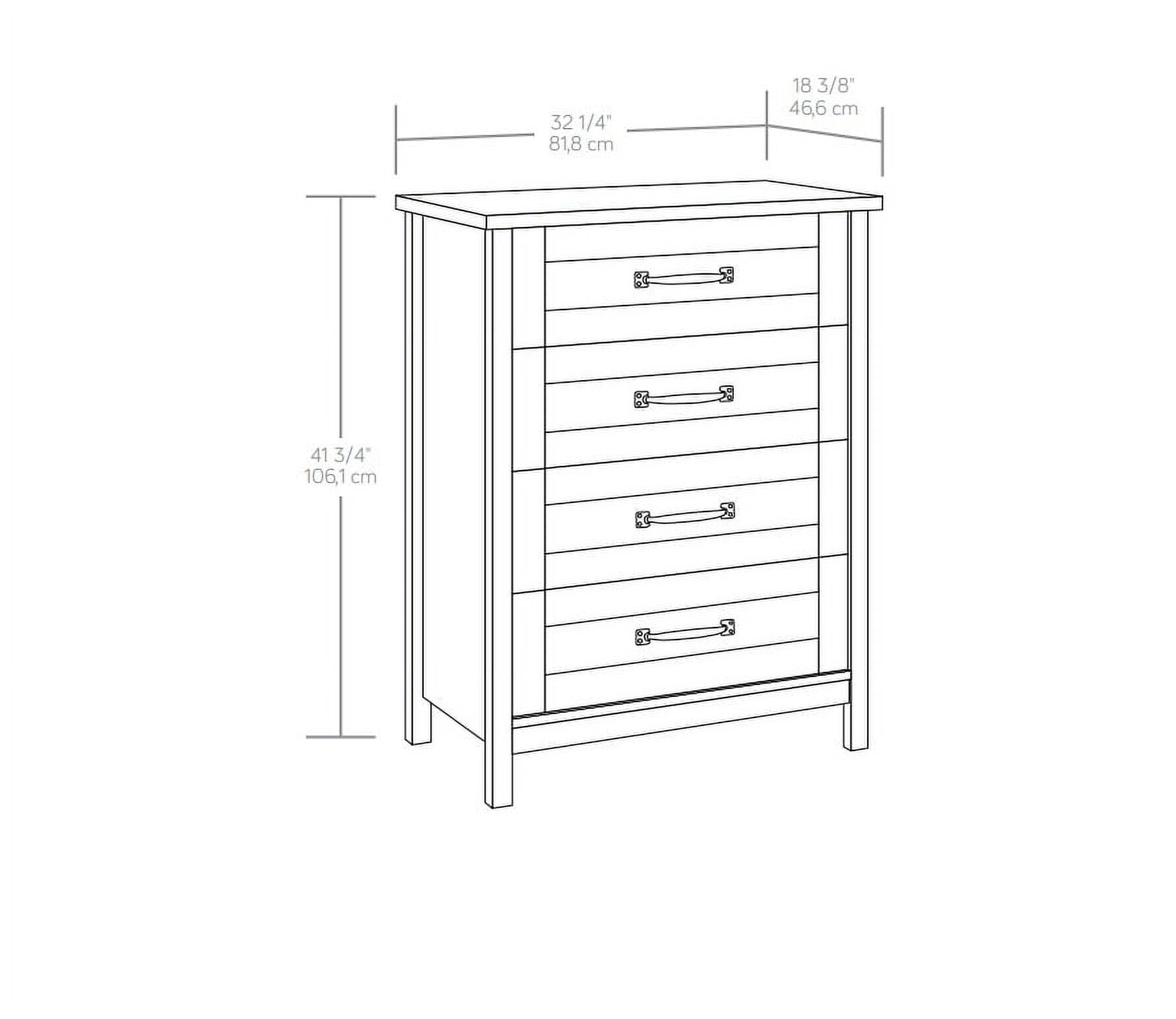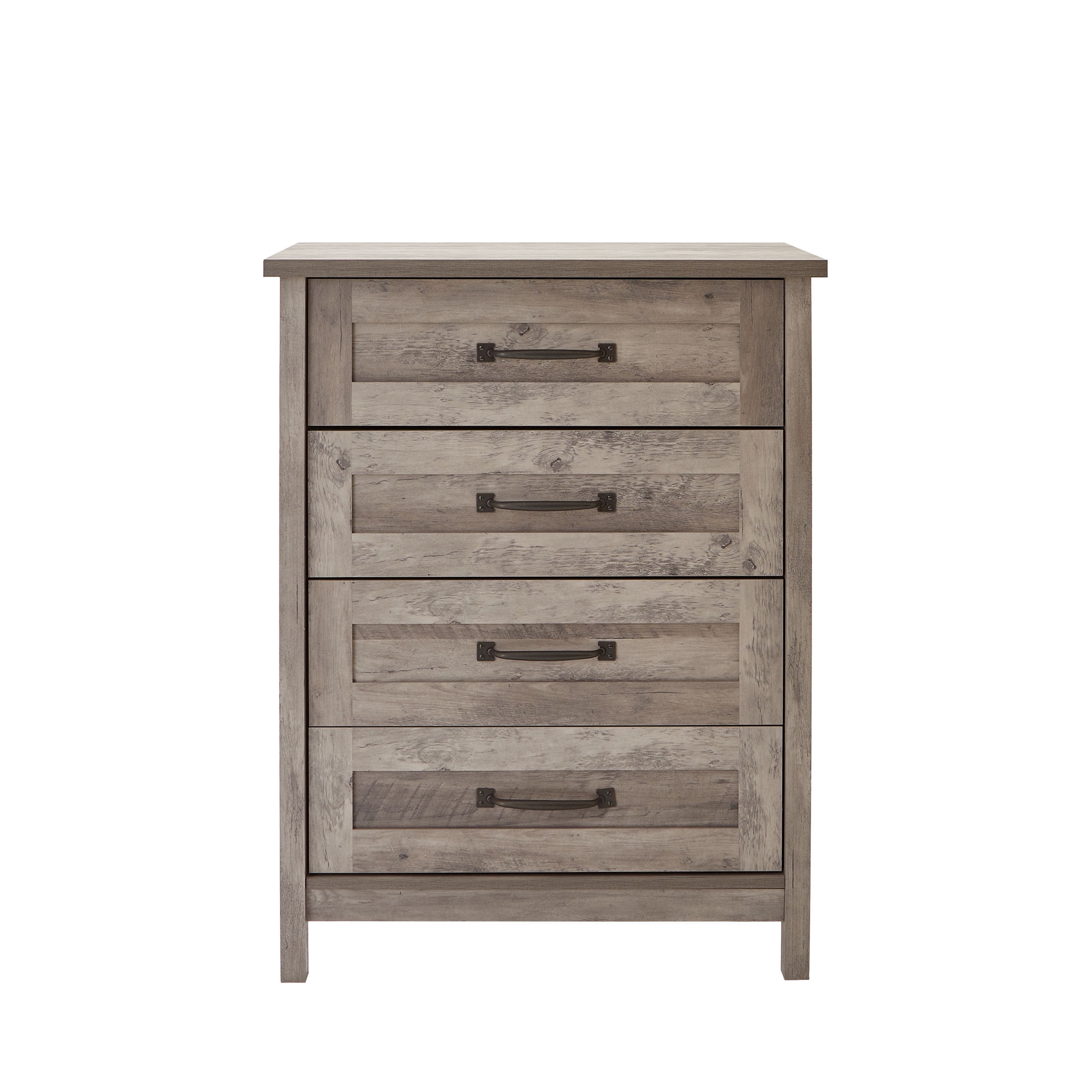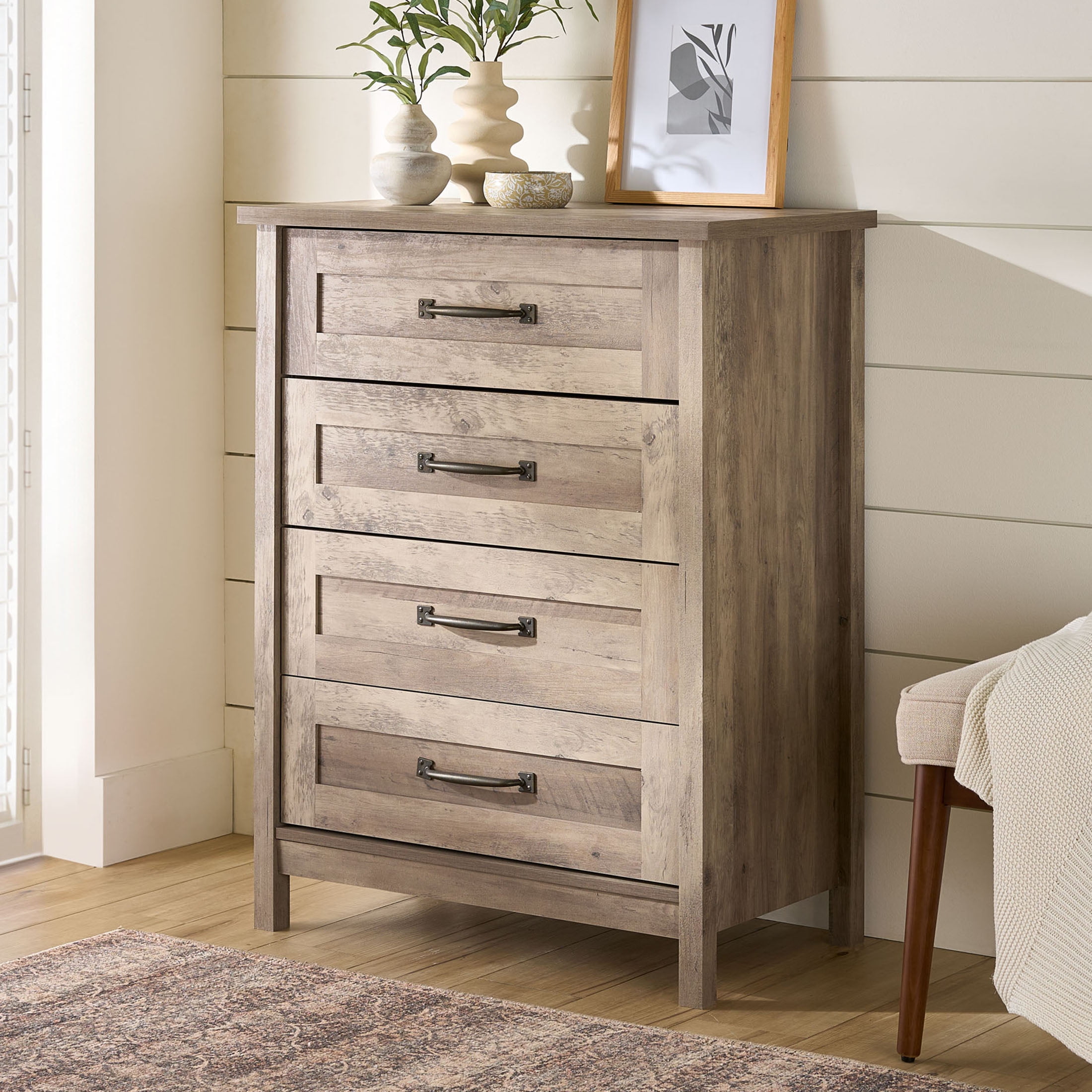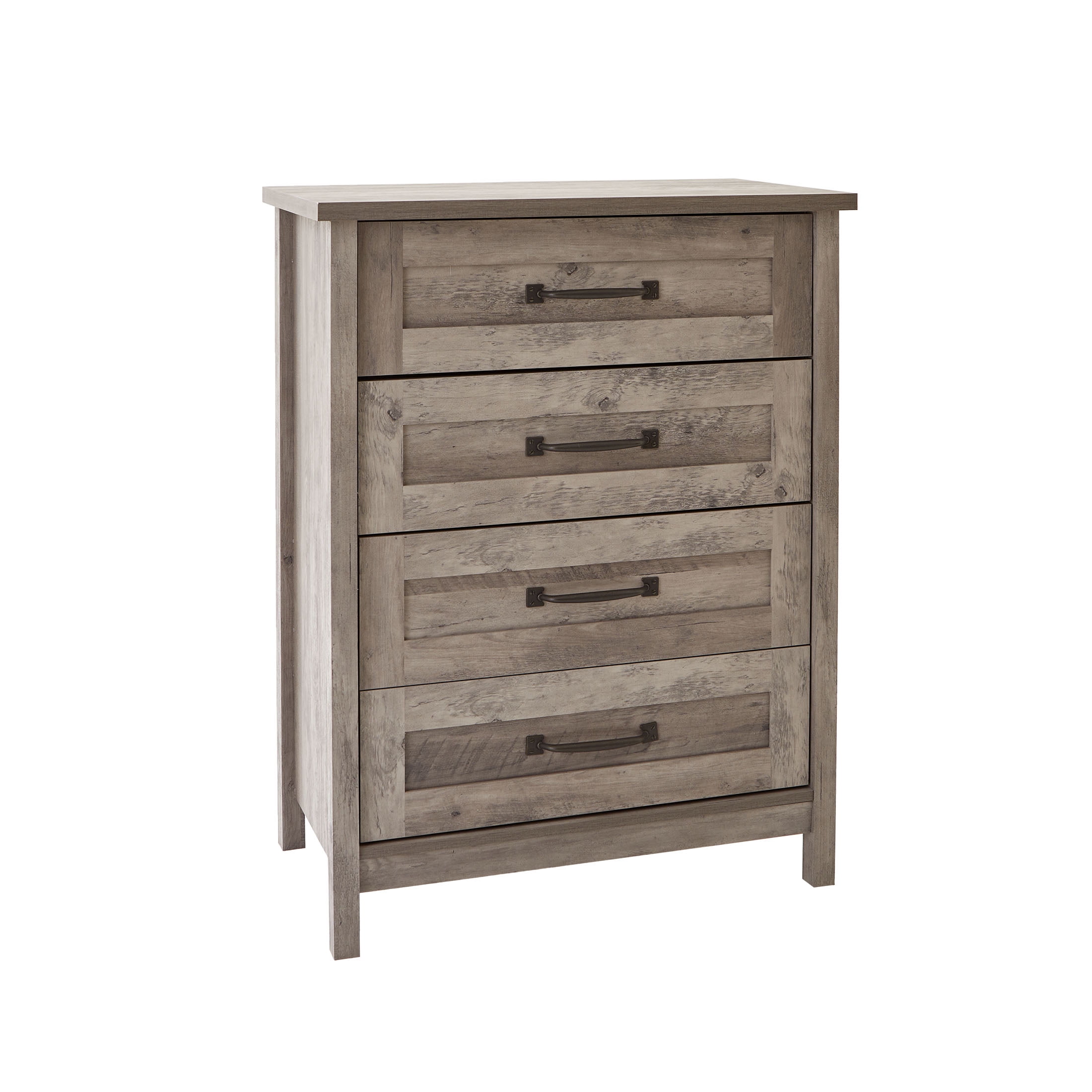 There is no such thing as too much storage space. Create versatile storage for all your things while adding beautiful style and charming design with this 4-drawer chest from the Better Homes & Gardens Modern Farmhouse collection. This handsome chest of drawers features four large drawers that open and close on smooth metal runners, making them ideal for easy access storage of an array of different items like stacks of your favorite blouses and your best-fitting jeans to your secret collection of old t-shirts and your comfy sweatpants. You can find a space for all your things! It also features a spacious top surface that provides you with room to store additional bedroom items or display home decor like an accent lamp, bottles of cologne, your makeup bag, and pictures of your family and friends too. Its framed panel doors and stylish hardware give this dresser a look that is sure to stand out in your bedroom. Finished in Rustic Gray, this stunning chest of drawers is the solution to all your storage woes.