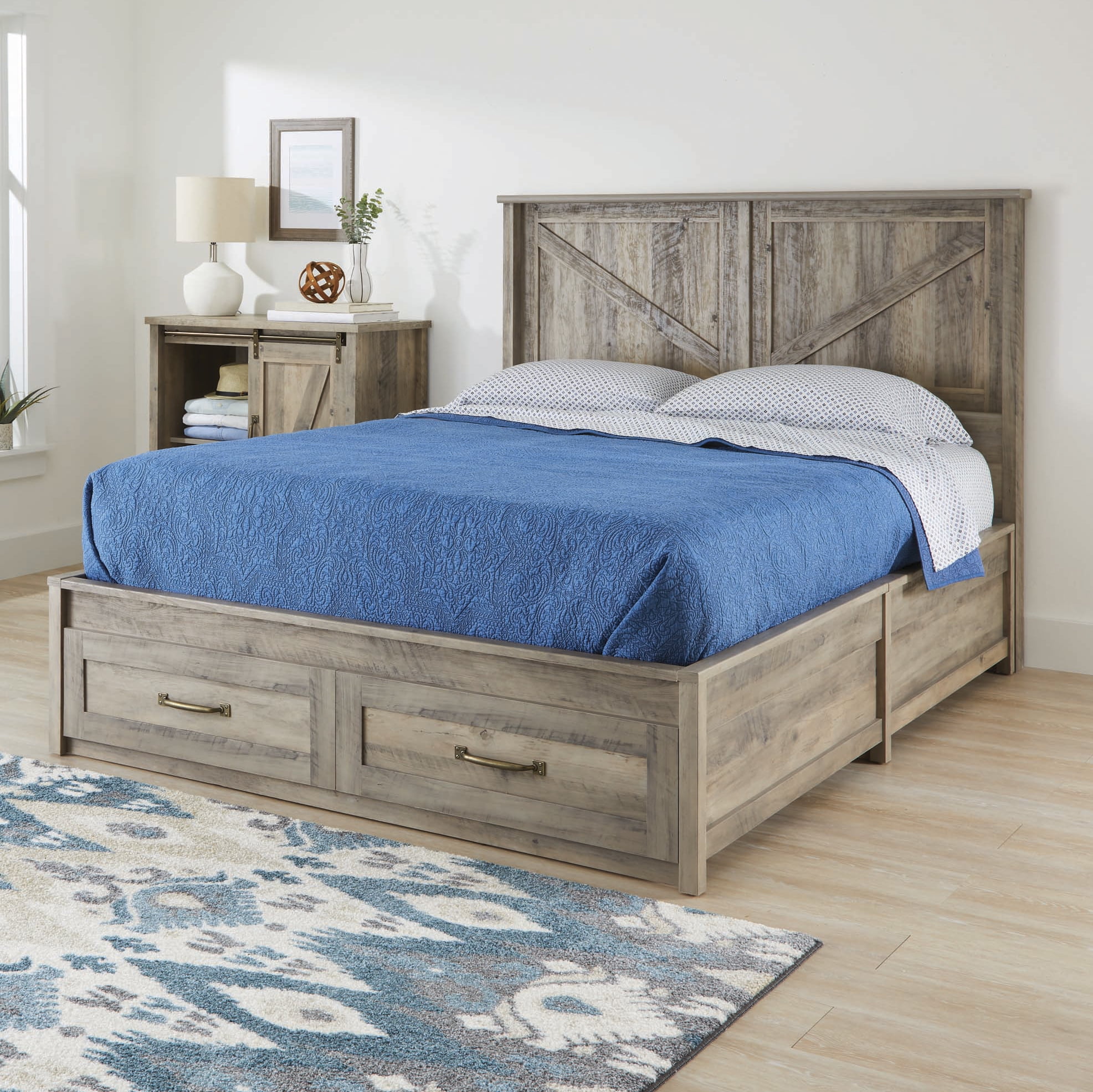Give your bedroom a fresh, new look and begin to snooze in style with this queen platform bed from the Better Homes & Gardens Modern Farmhouse collection. This bed features a barn wood inspired design headboard which gives it a unique rustic look. It also features, convenient under the bed storage which includes two large drawers that open and close on smooth metal runners. Both drawers feature a removable divider for versatile storage options of an array of different items. Enjoy an easy access space to stow away anything from stacks of sweatshirts and shoes to board games and an extra set of sheets and blankets. You can find room for all your stuff! It accommodates a queen-sized mattress to give you a completed look, whether it is in your master suite or down the hallway in the guest room. It adds cozy style and simplistic beauty no matter where it rests. Its detailed with framed panel doors and stylish hardware to give it its charming good looks. Finished in Rustic Gray, this bed is everything your bedroom needs.
