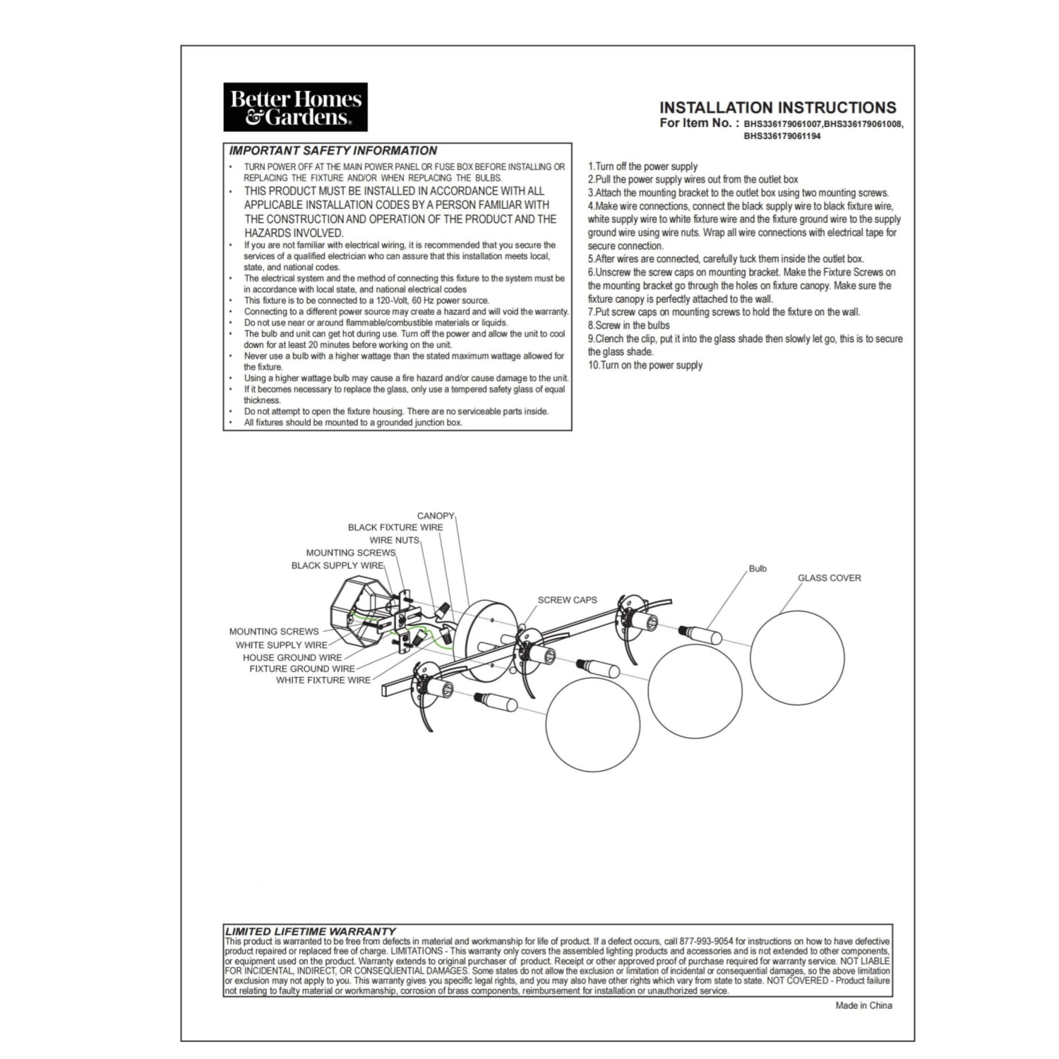 BHG (Better Homes &Garden) vanity light fixture is well-design for your home decoration . It’s equipped with three dimmable 40W equivalence T6 opal filament bulbs. These decorative bulbs are rated to last 13 years based on 3 hours per day use with only 5 Watt of energy to produce light, which is equal to light from a 40W incandescent. This is a 90% savings over traditional lighting – and that means savings on your energy bill every month and with the energy certification to prove its credibility. Our fixture is ETL listed for your safety. 5 YEAR LIMITED WARRANTY: Return of defective product and receipt required for warranty claims. Duration of Limited Warranty based on average daily use of 3 hours. Limited Warranty voided for misuse of product per caution statement.