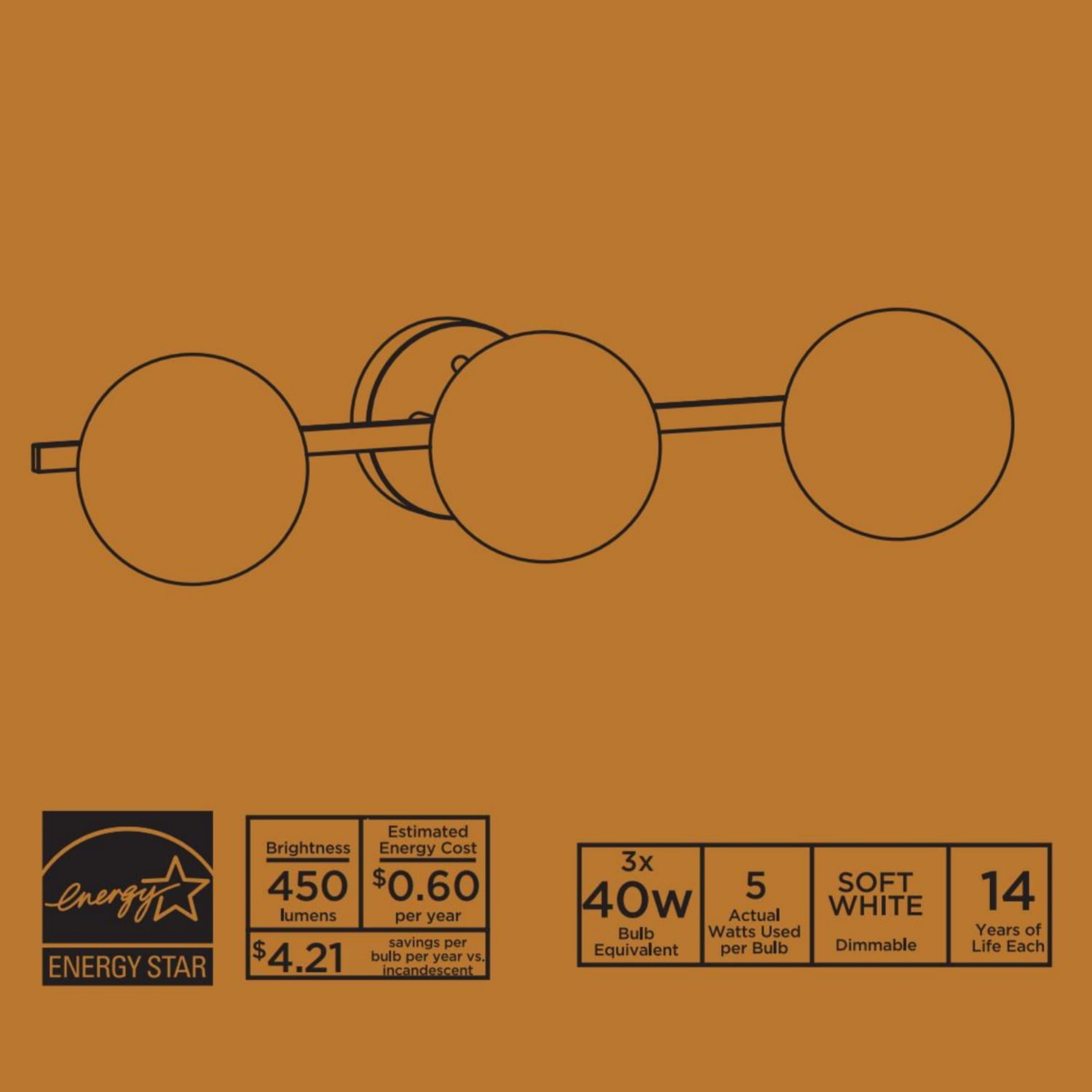 Better Homes & Gardens Modern Vanity Light 3-Light Modern design Constructed from metal in Brass finish With three frosted glass globes Includes three 40W equivalent T6 LED Tubular bulbs The included bulbs are dimmable, soft white (2700K), 450 lumens each Assembled Size: 23.94×8.7×5.51 in 5-year limited warranty Model BHS336179061008