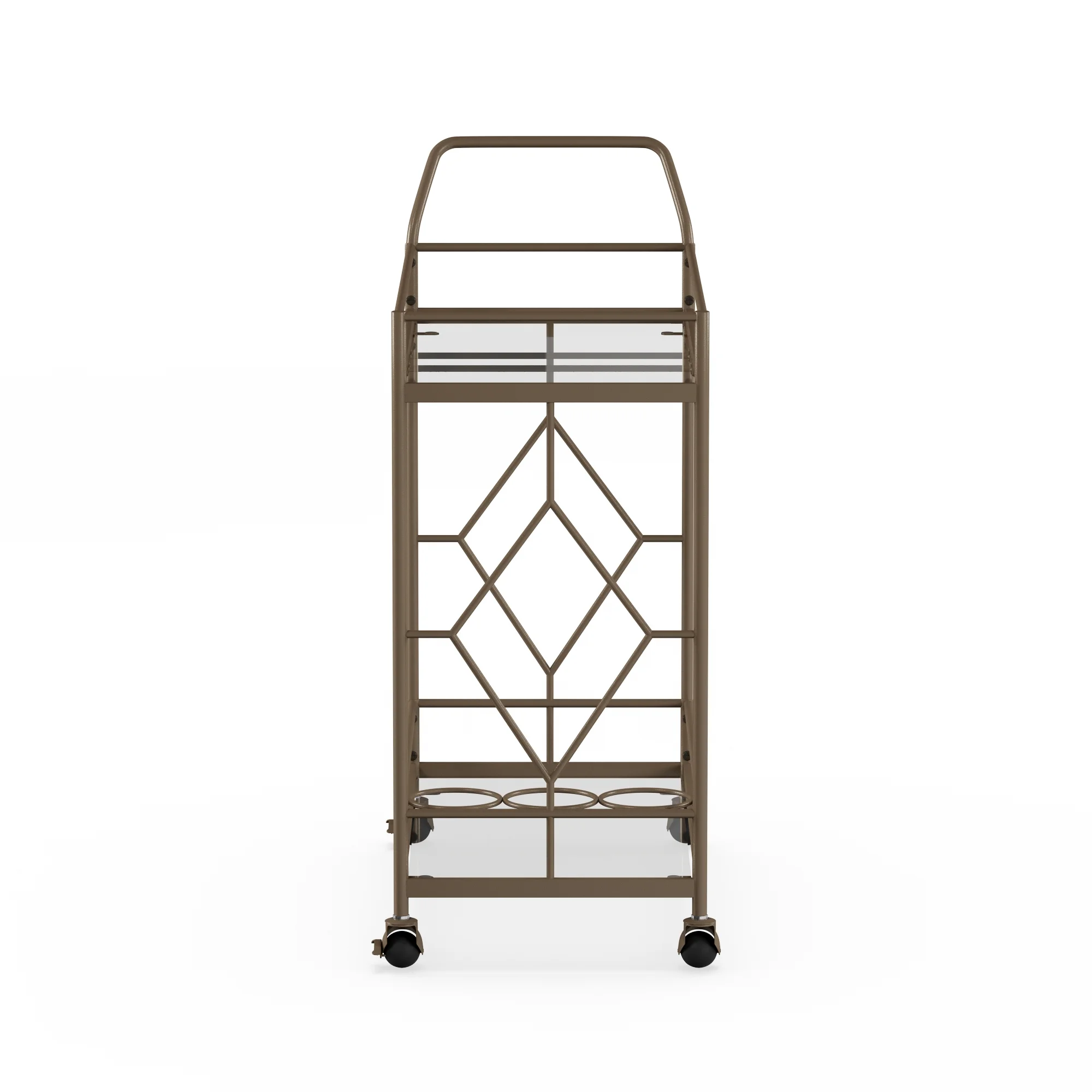 Golden bronze metal frame Dimensions: 27.68″ W x 14.57″ D x 32.76″ H 2 Levels of shelf space Rolling and locking casters 3 Bottle holders