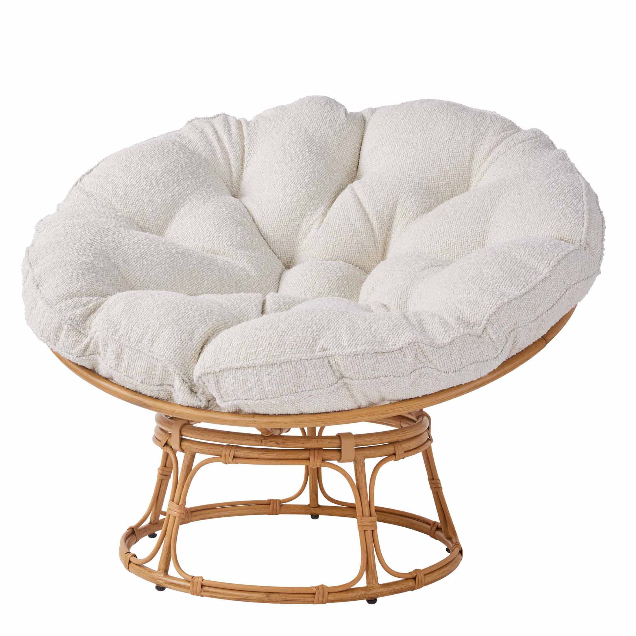 Add a touch of comfort to your home with the Better Homes & Gardens Papasan Chair. Designed with a sturdy steel frame and faux wicker accents, this classic chair features a soft 4.5-inch thick tufted seat cushion covered in cream boucle upholstery to create an inviting seating option. The chair bowl securely attaches to the base for comfort and stability, so you can safely enjoy relaxing in this comfortable chair. This Papasan chair’s cushion cover is made from 100 percent polyester that is hand-wash only with non-chlorine bleach when needed. Lay flat to dry. Cool iron if necessary. Do not dry clean. Relax in style and comfort with the Better Homes & Gardens Papasan Chair.